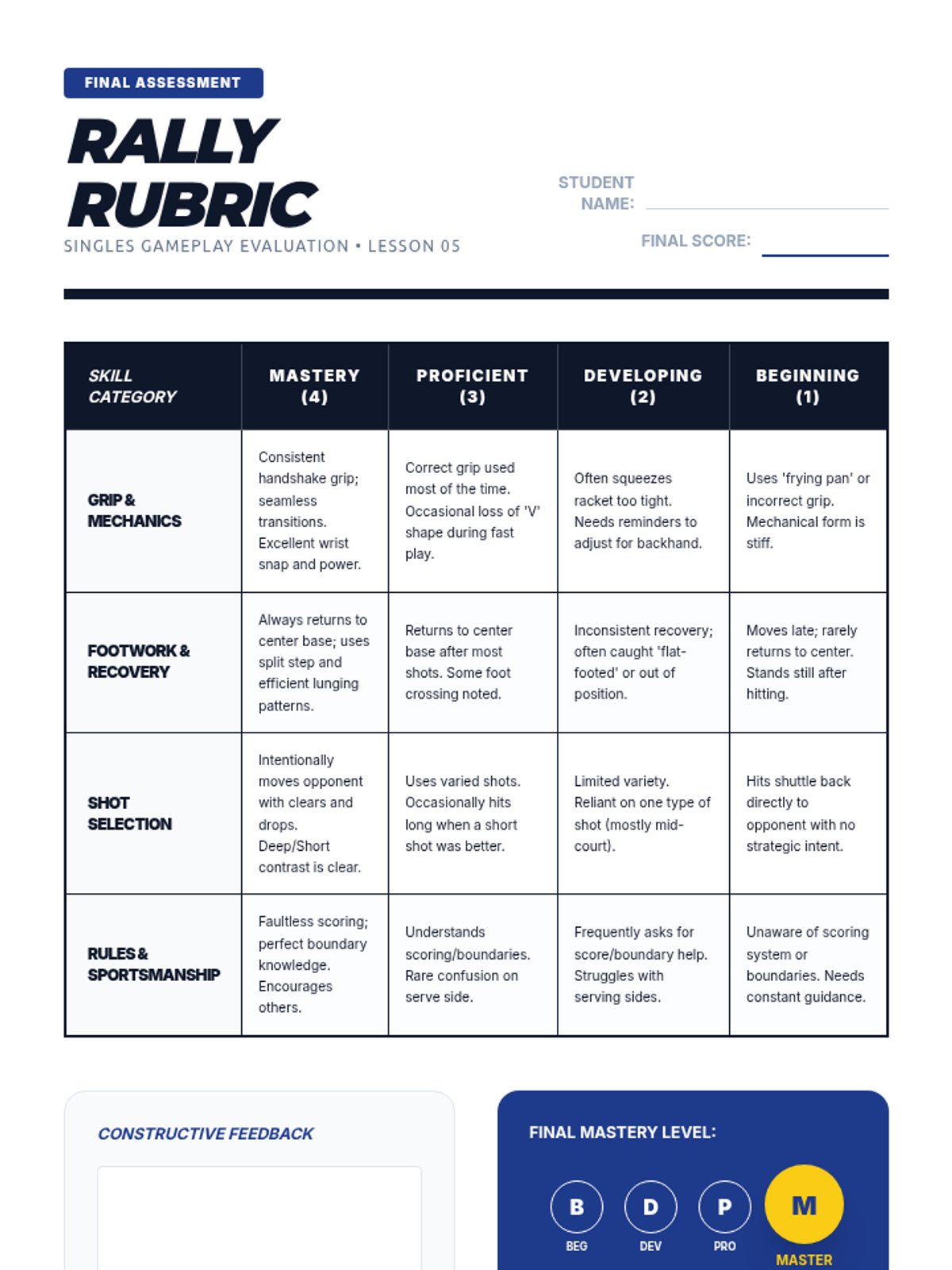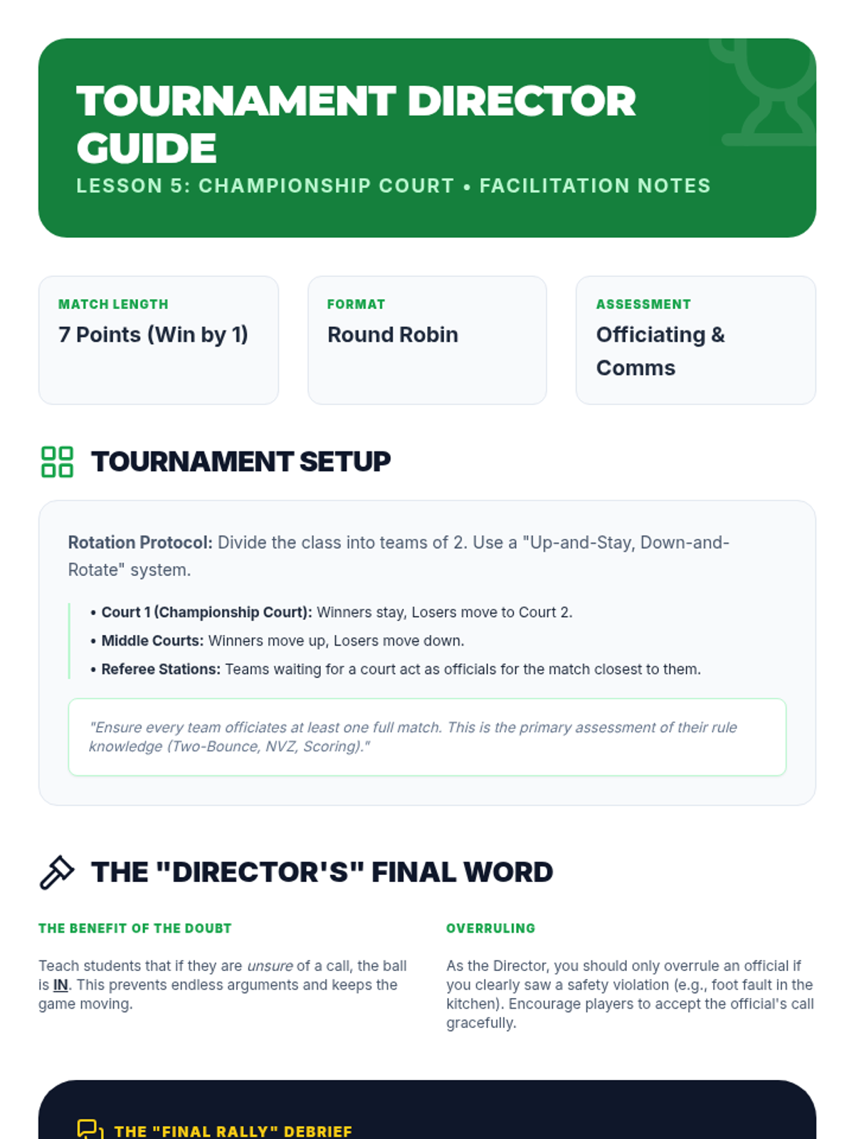 A round-robin doubles tournament serves as the final assessment. Students rotate between playing and officiating, applying their knowledge of rules and sportsmanship in a competitive environment.