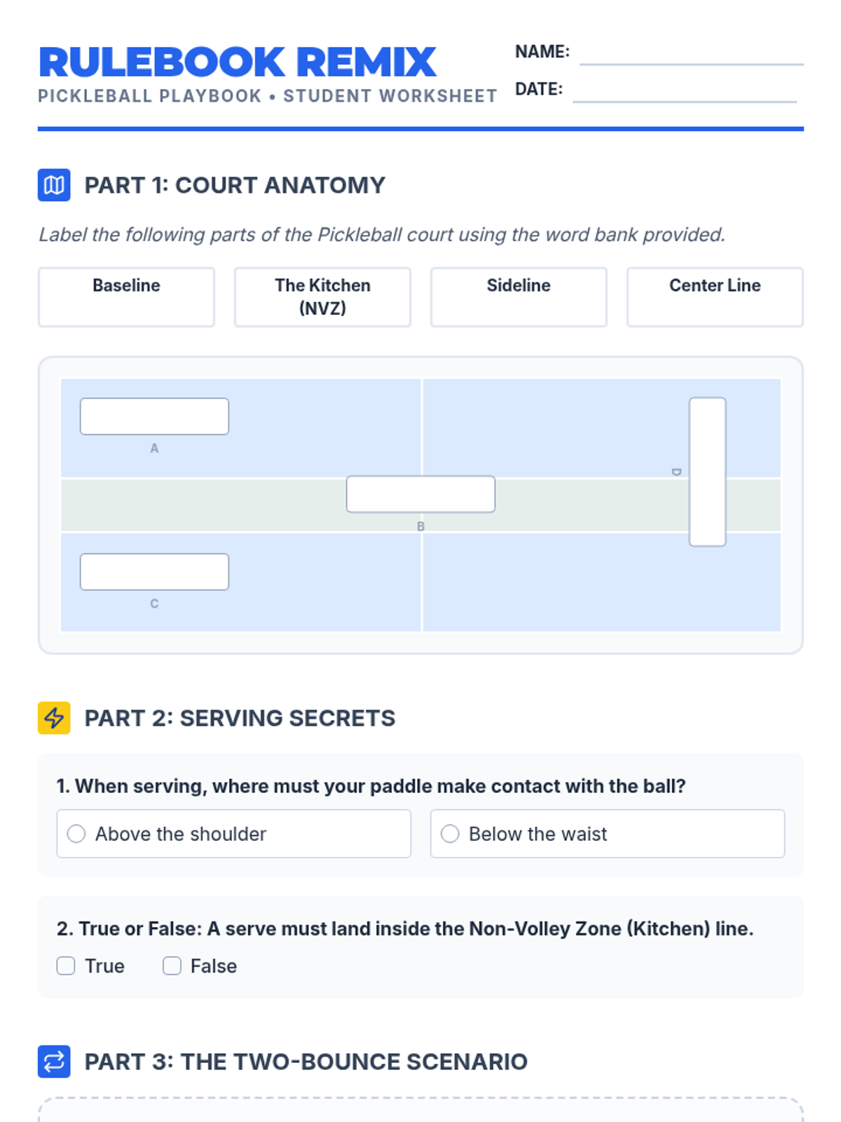 The unit concludes with students applying their skills in a doubles tournament format, learning rotation systems (front-back/side-by-side) and practicing official officiating and scoring.