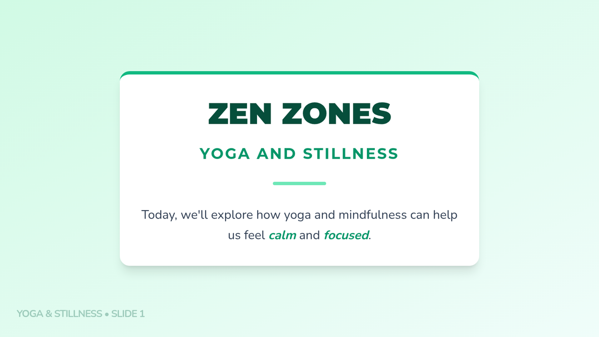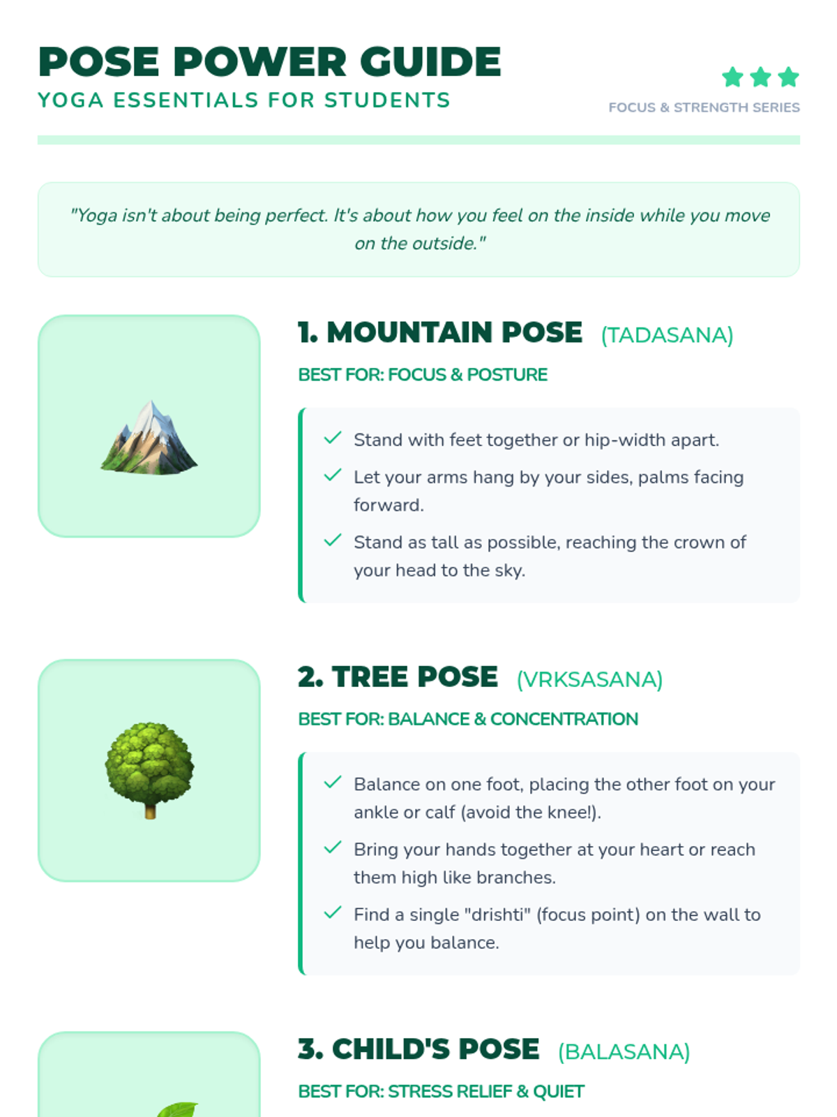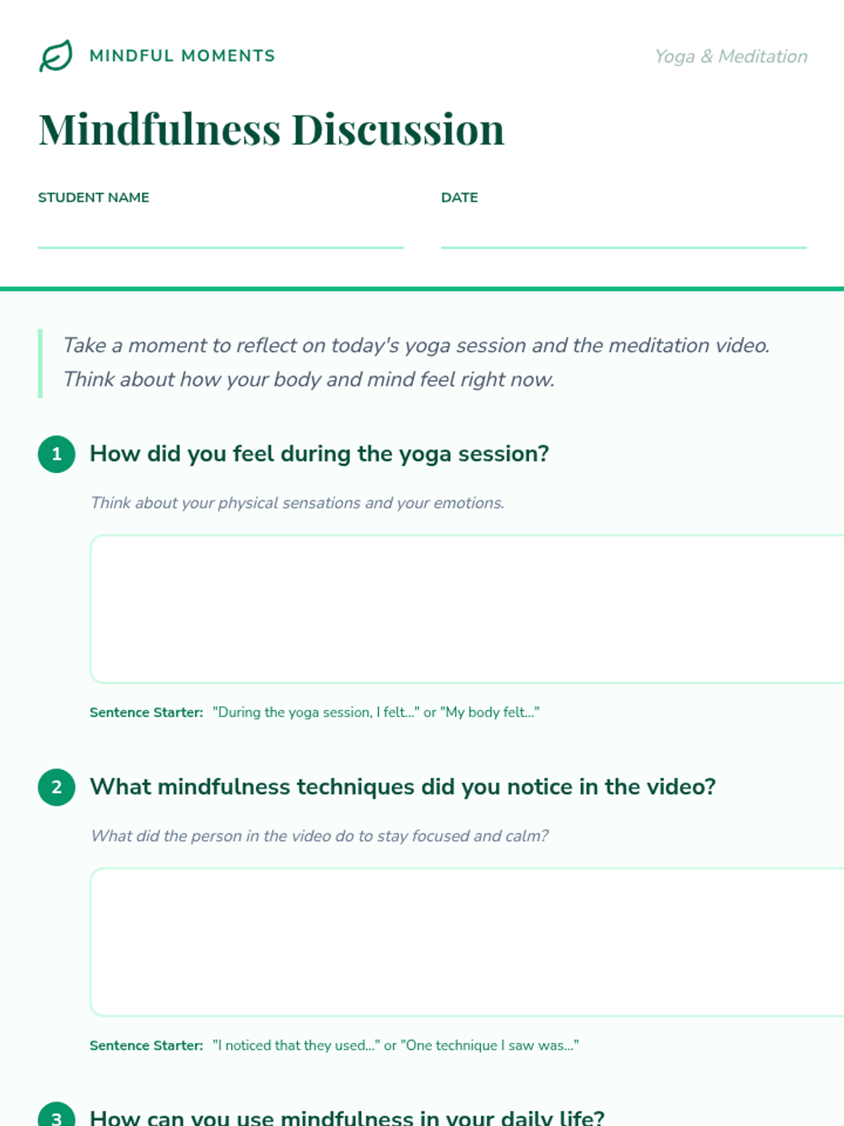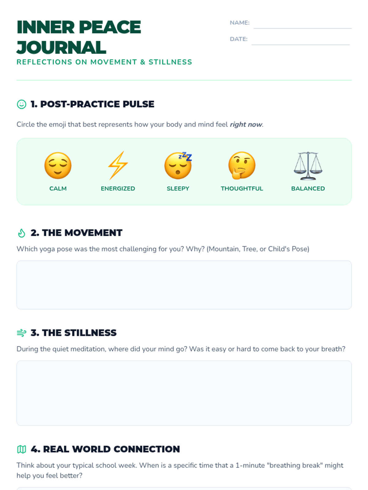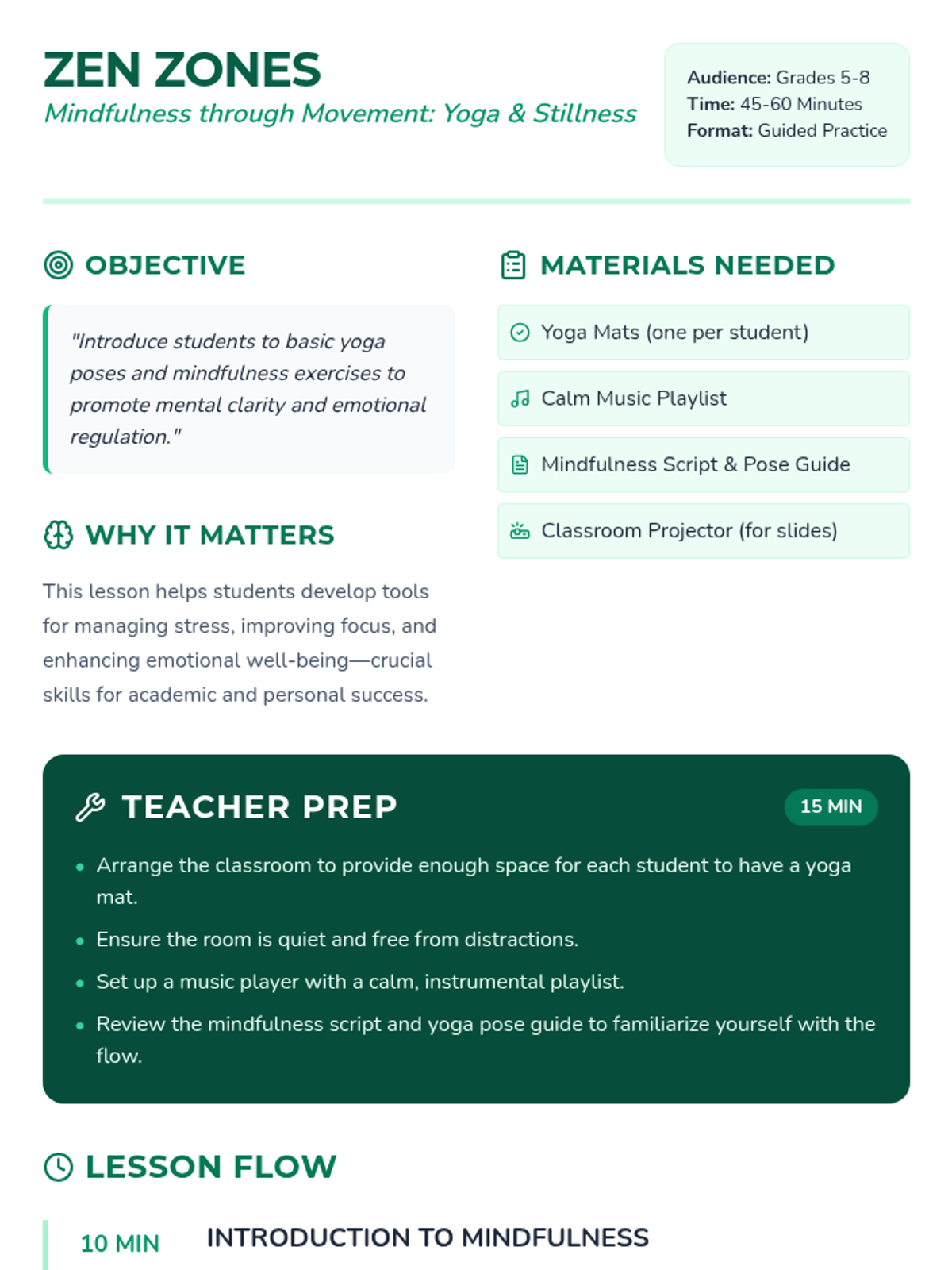 A lesson that combines yoga poses with mindfulness and reflection to help students manage stress, improve focus, and develop mental clarity through physical movement and breathing.