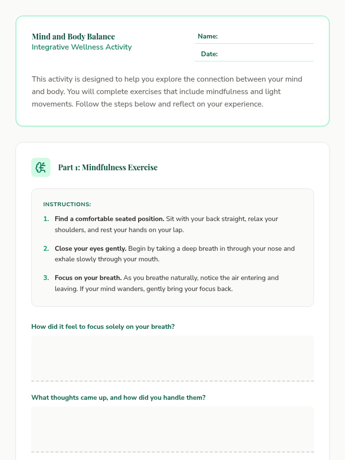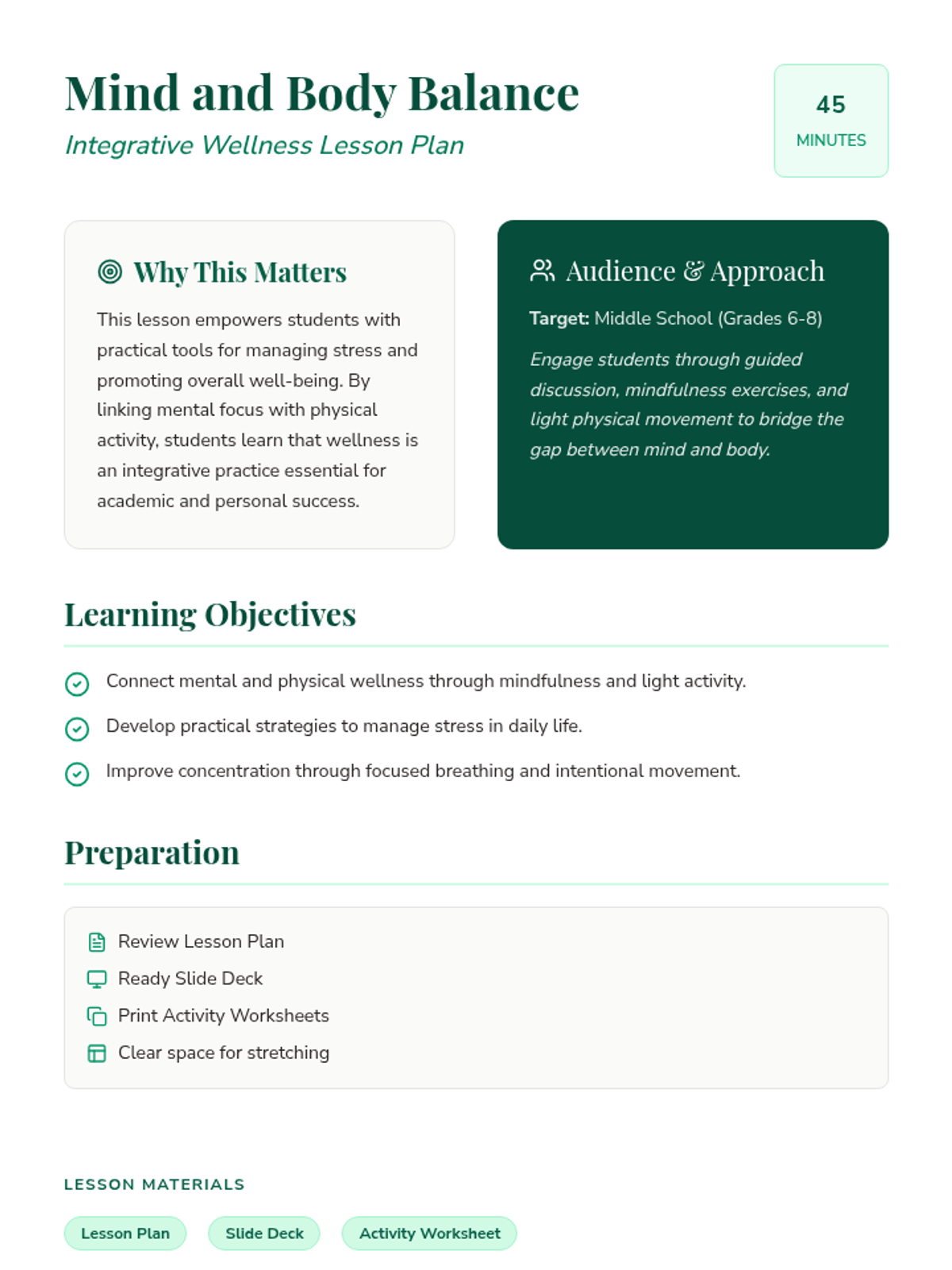 A comprehensive lesson designed to help middle school students understand the connection between mental and physical health through mindfulness and light movement. Students will learn practical stress management tools and strategies to improve daily concentration.