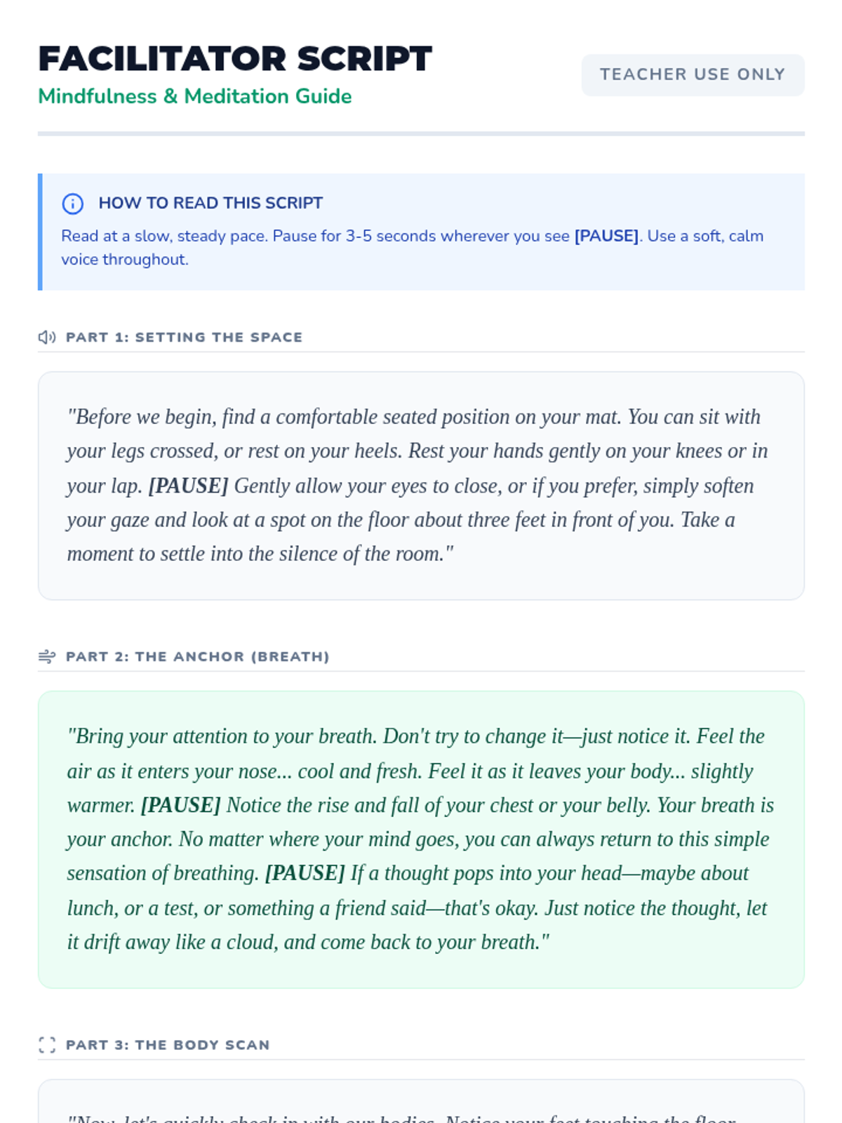 In this culminating lesson, students simulate high-pressure scenarios (mock test-taking or public speaking prep) and apply their breathing toolkit. They reflect on which techniques were most effective for their personal physiology.