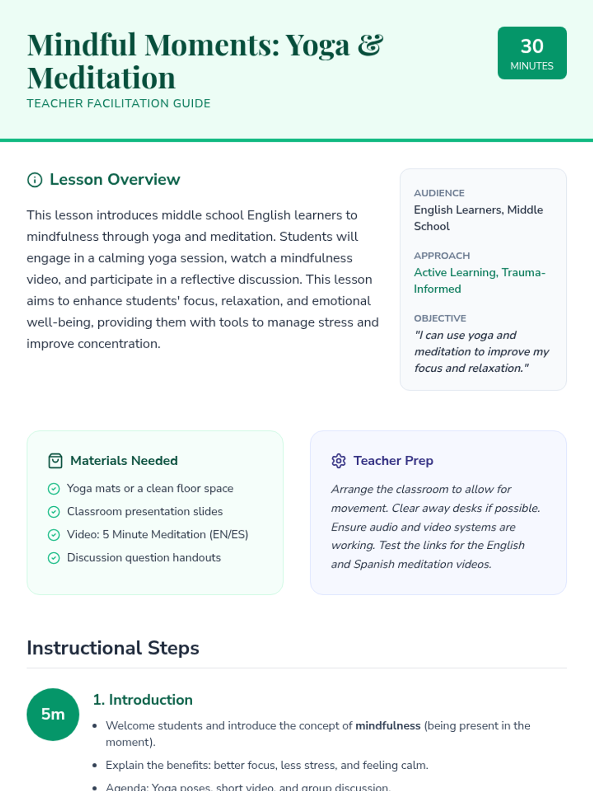 A middle school English Learner lesson introducing mindfulness through yoga and meditation to improve focus and emotional well-being.