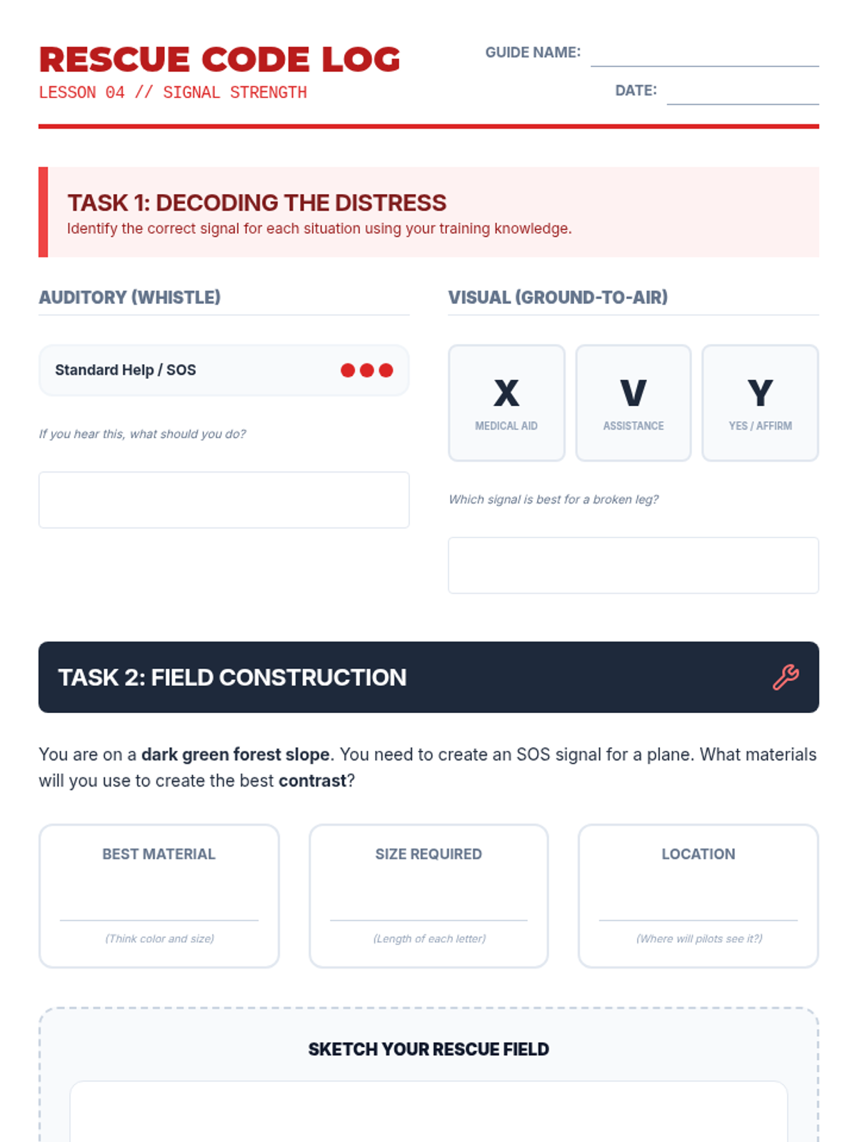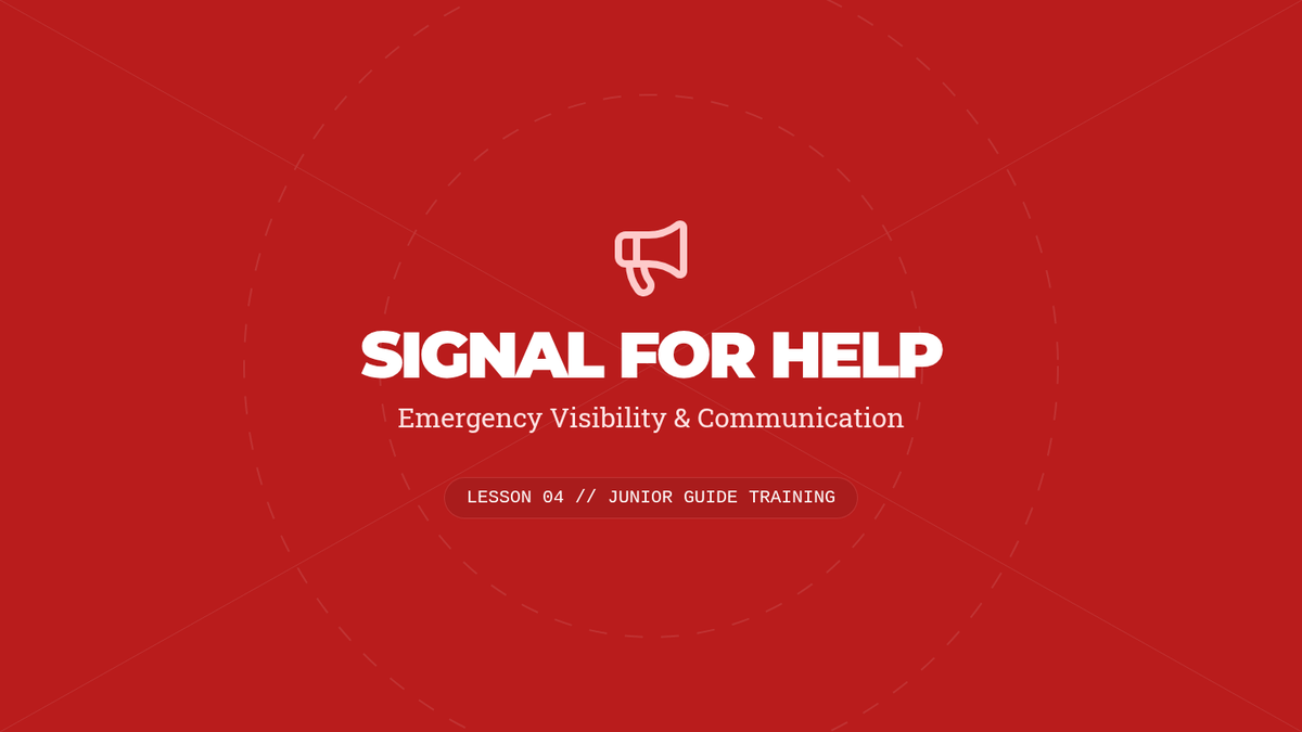 Teaches auditory and visual signaling methods, including ground-to-air signals and signal mirror use.