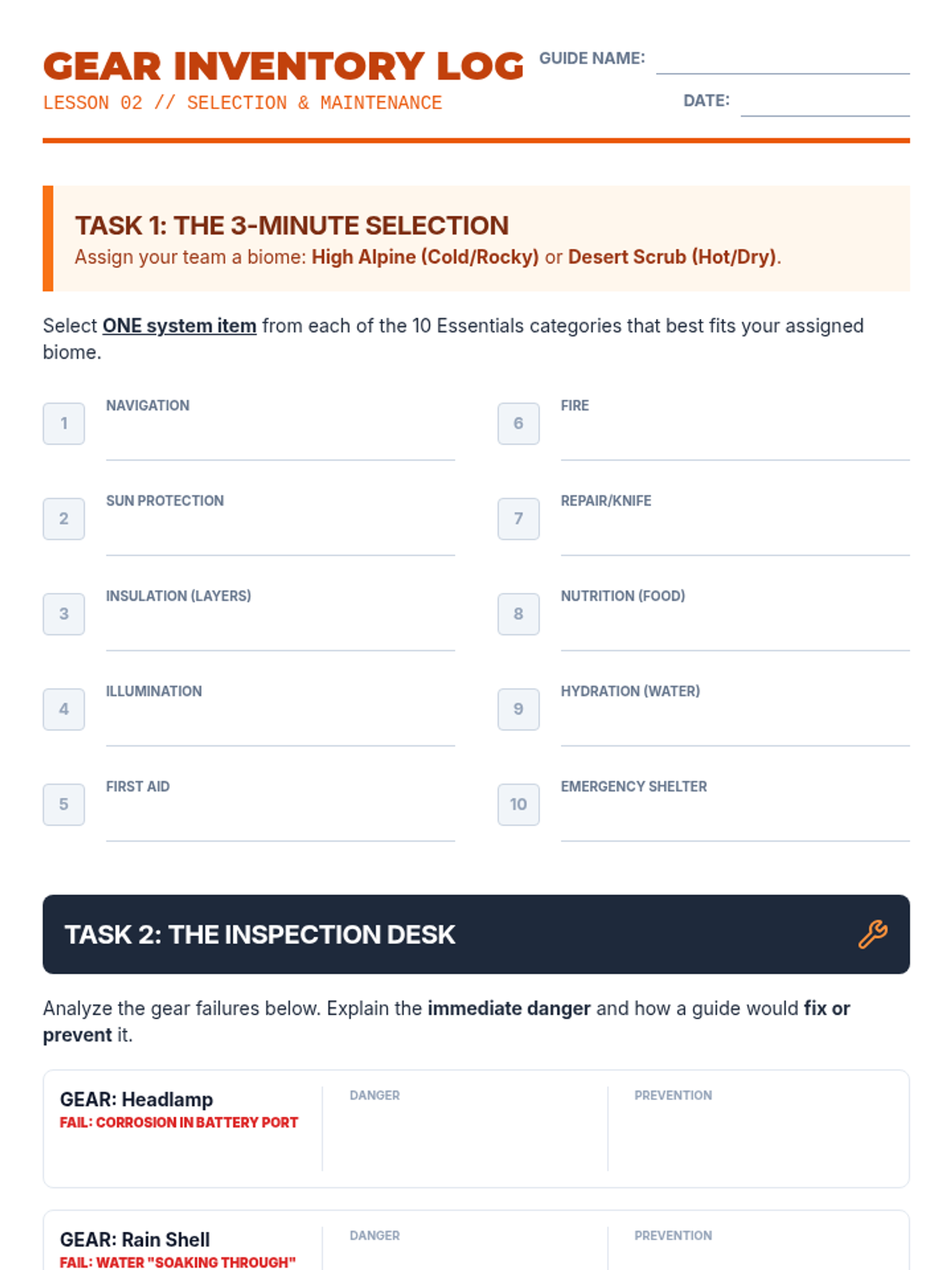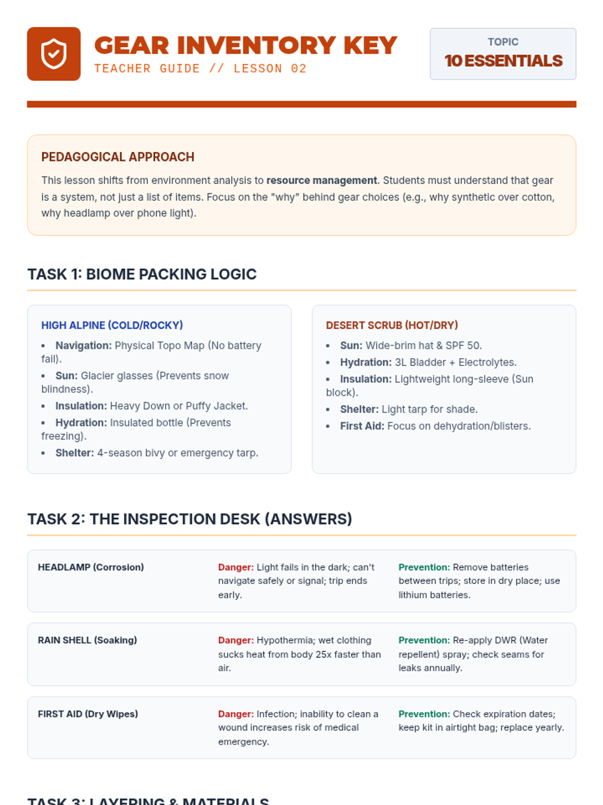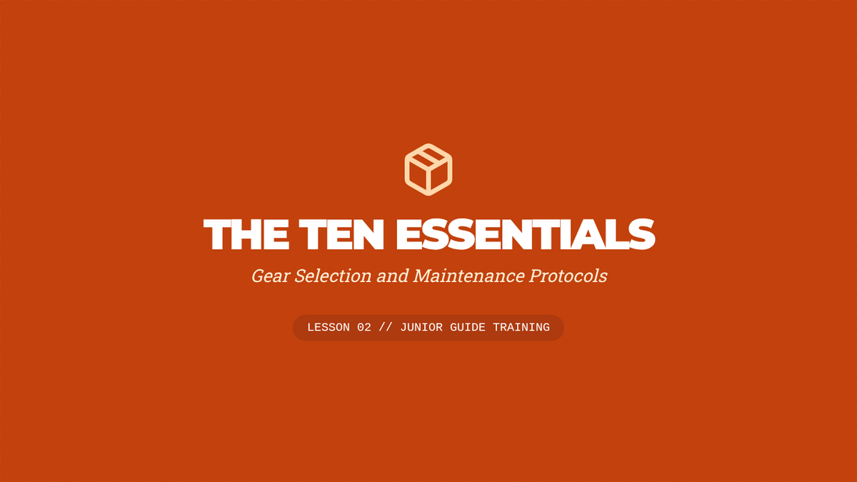 Focuses on the Ten Essentials, equipment maintenance, and proper layering for different biomes.