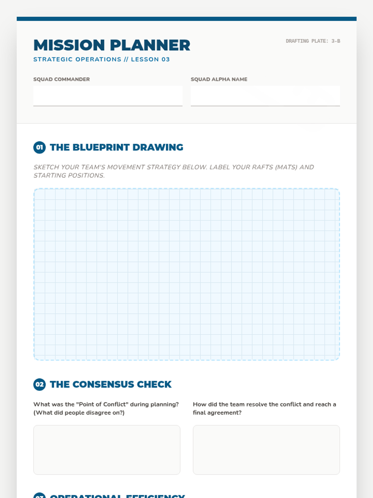 Emphasizes the planning phase and consensus building through the 'River Crossing' simulation.