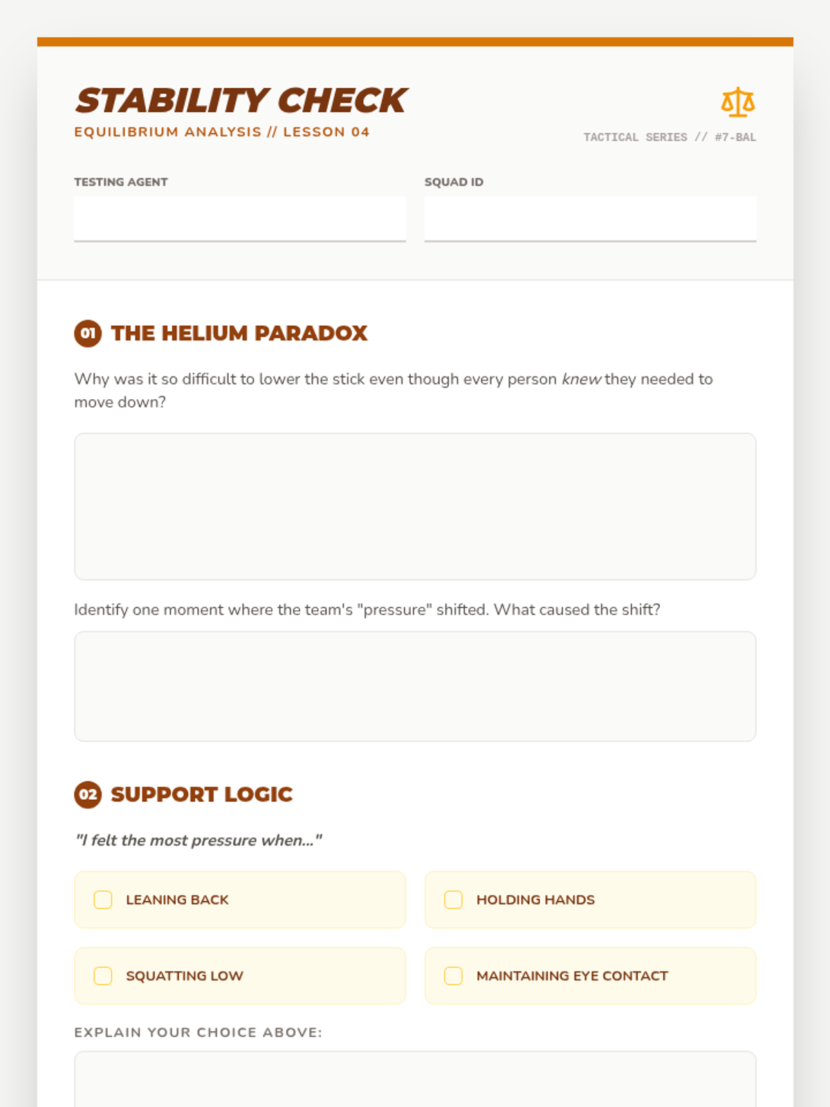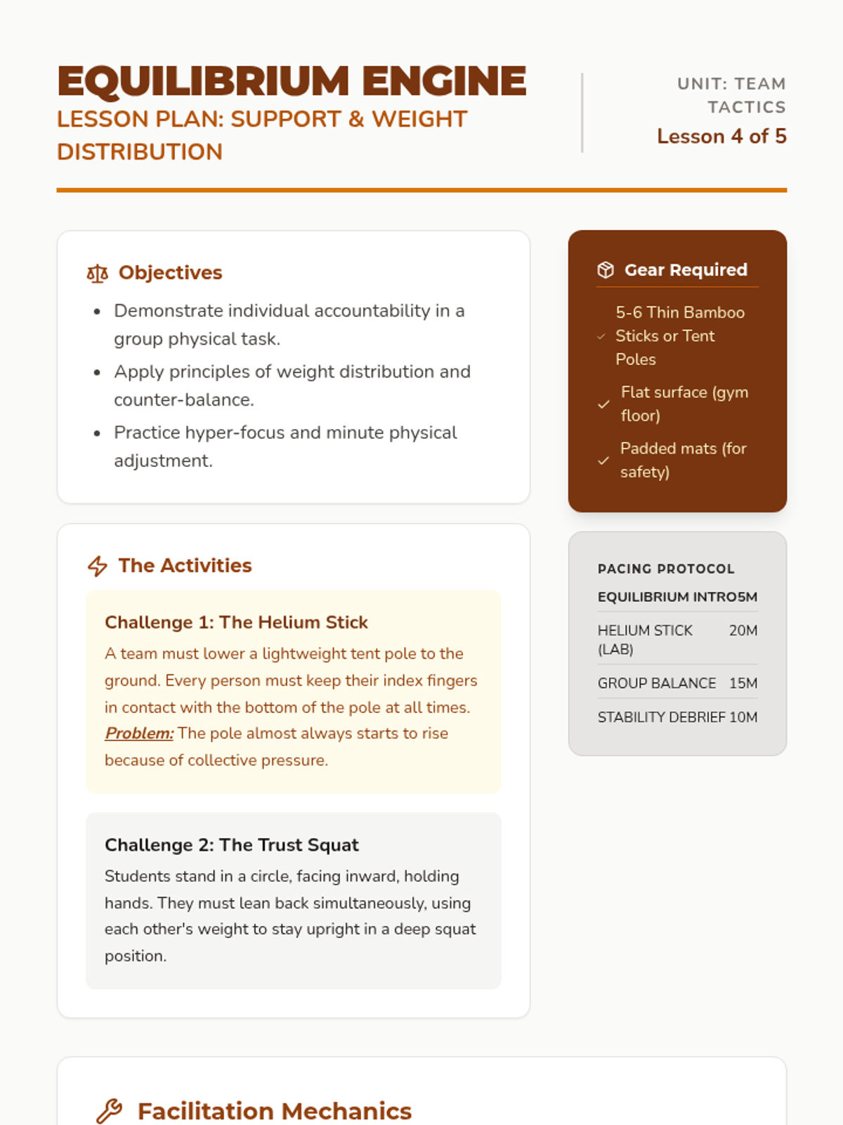 Explores physical support, weight distribution, and individual accountability through collaborative balance tasks.