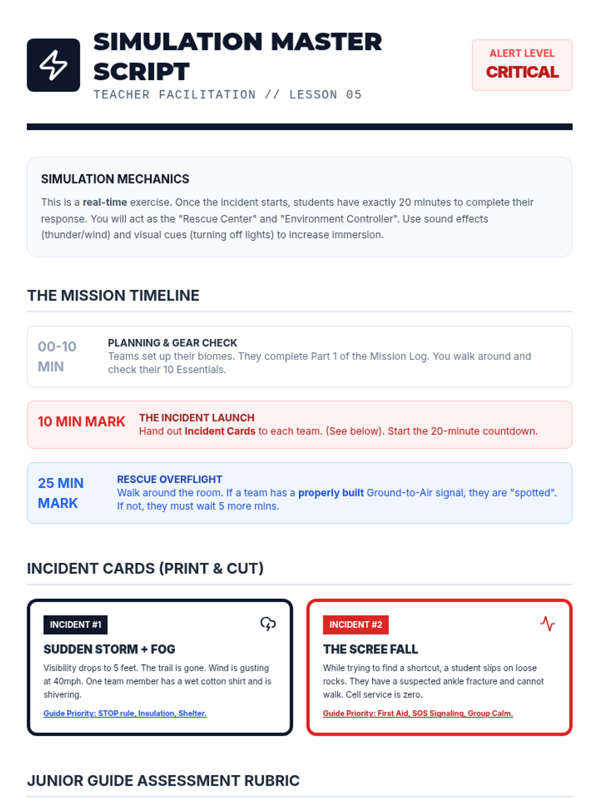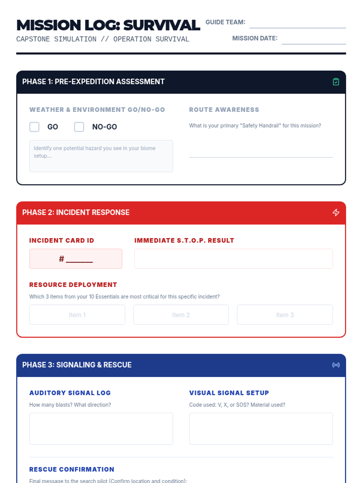 A capstone simulation where teams must manage a sudden weather shift and injury using all previously learned protocols.
