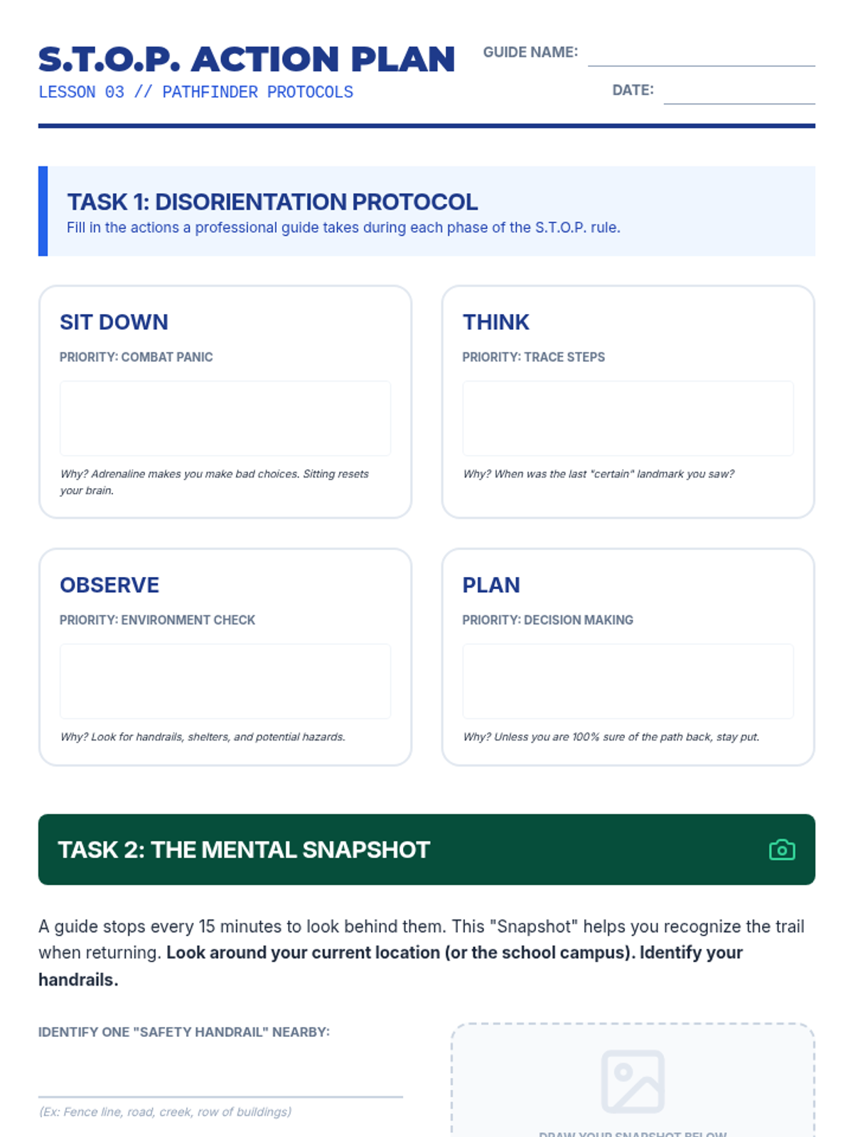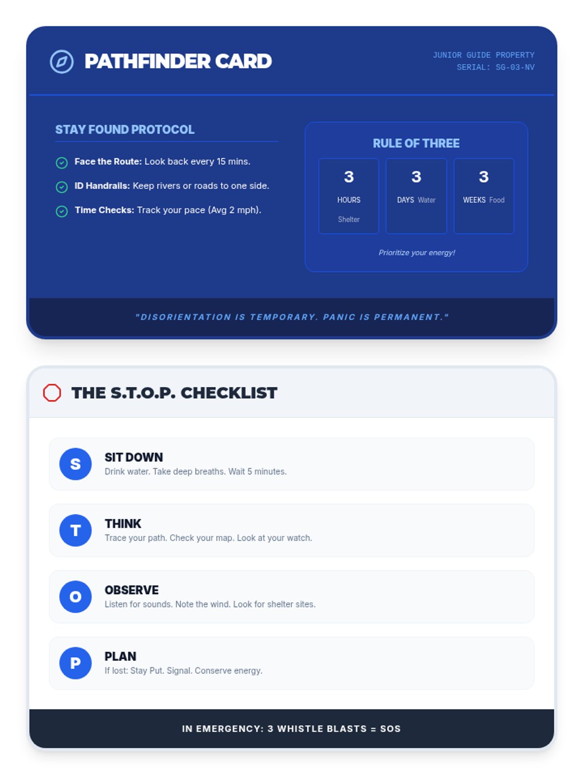 Introduces the S.T.O.P. rule and basic situational awareness to prevent and manage getting lost.