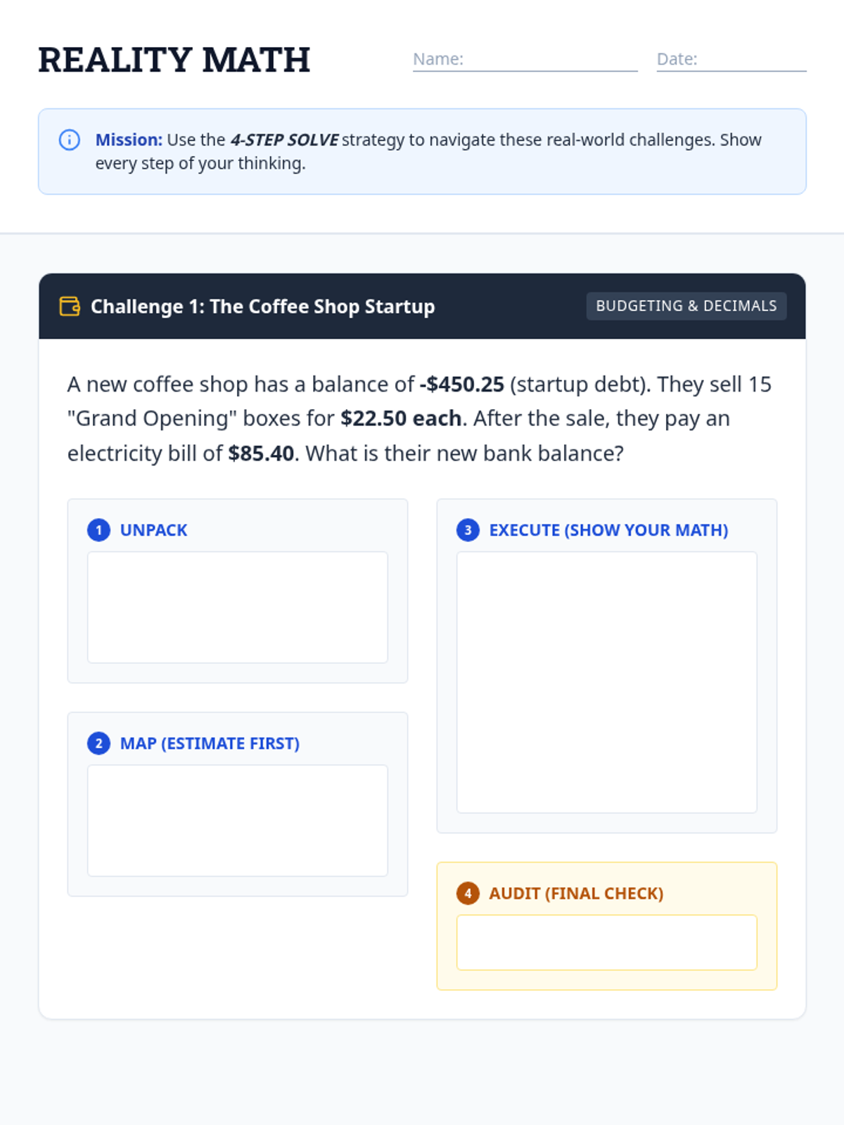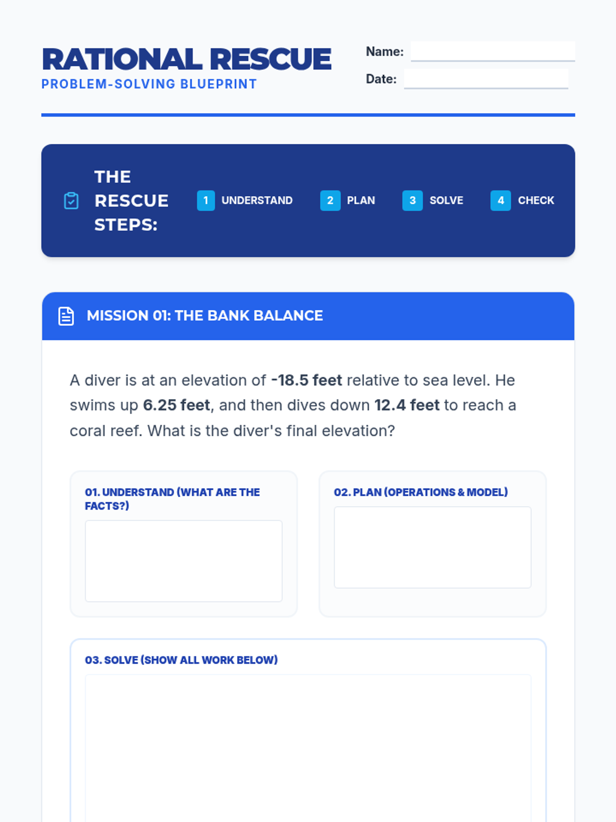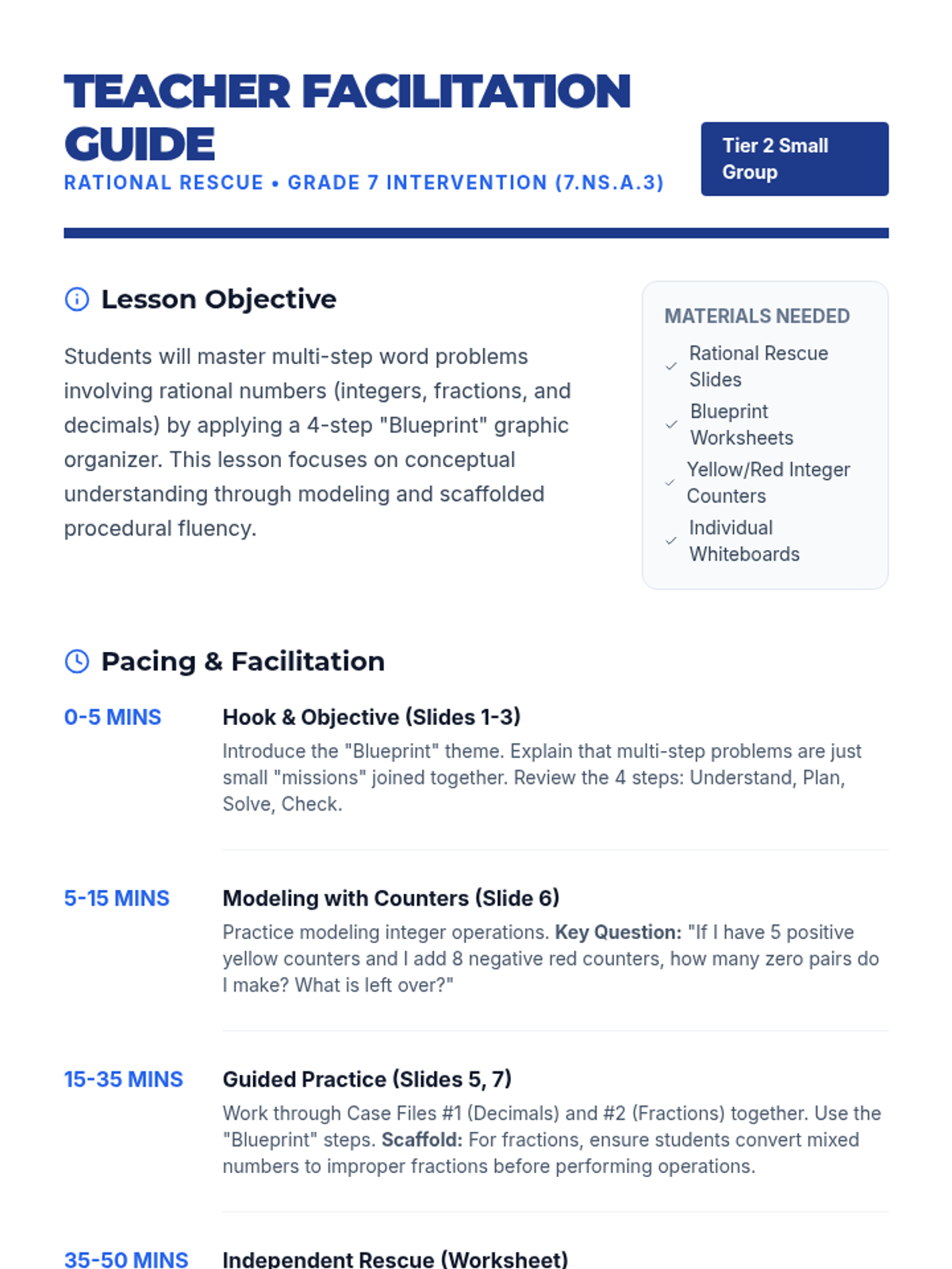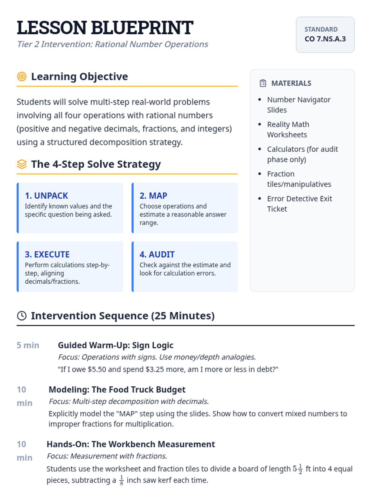 A Tier 2 intervention lesson focused on mastering multi-step problems with rational numbers using scaffolded graphic organizers and concrete modeling. Students will develop a 'blueprint' for tackling complex word problems involving decimals, fractions, and integers.