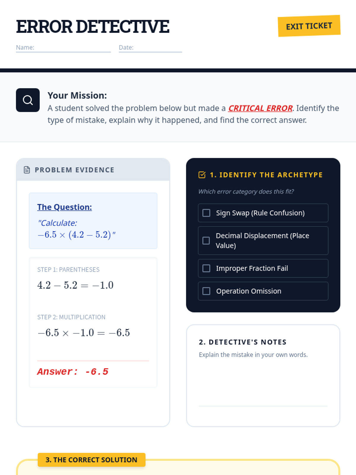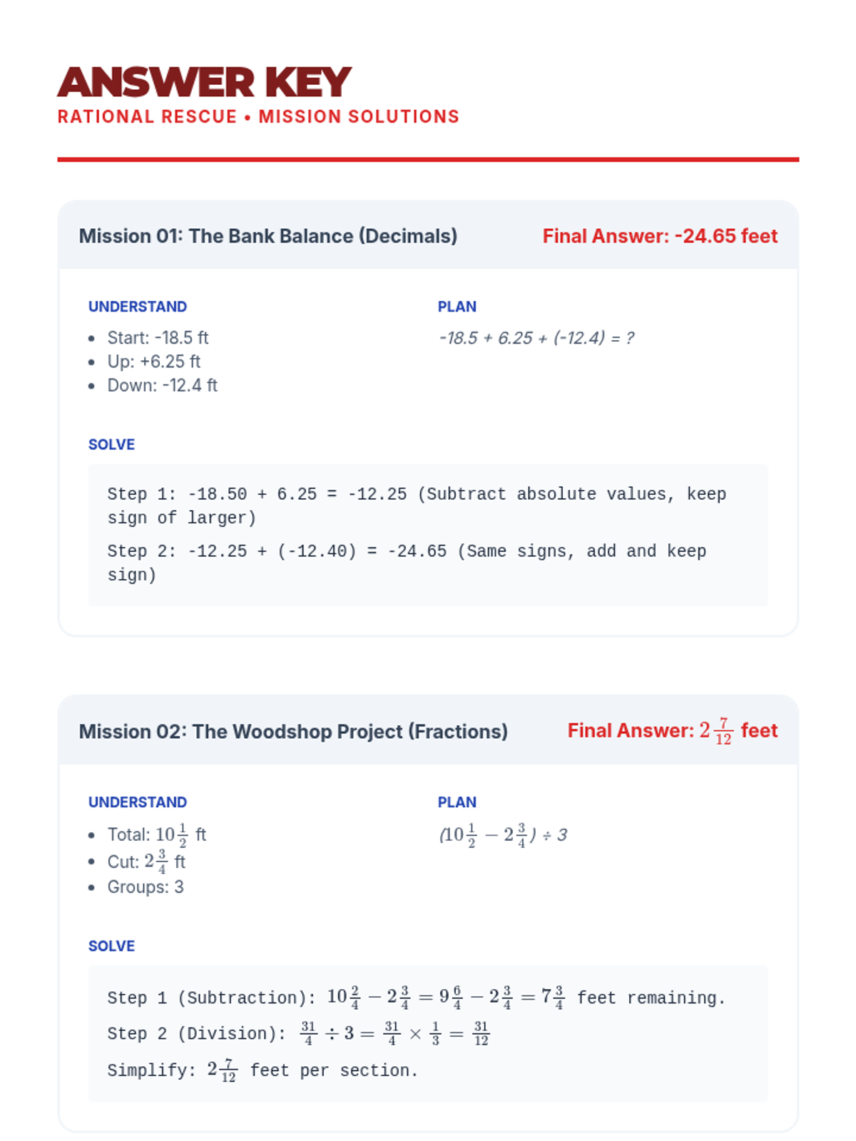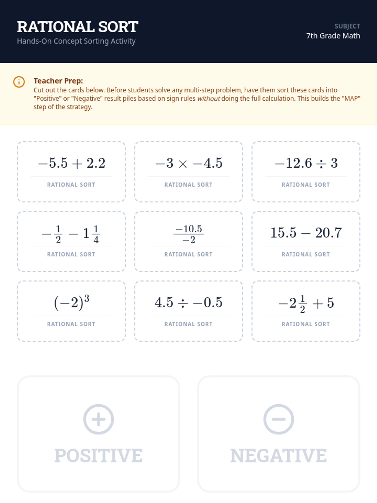 A comprehensive guide and practice set for mastering the four basic operations with integers, fractions, and decimals. Students will use reference sheets and practice problems to solidify their understanding of rational number arithmetic.