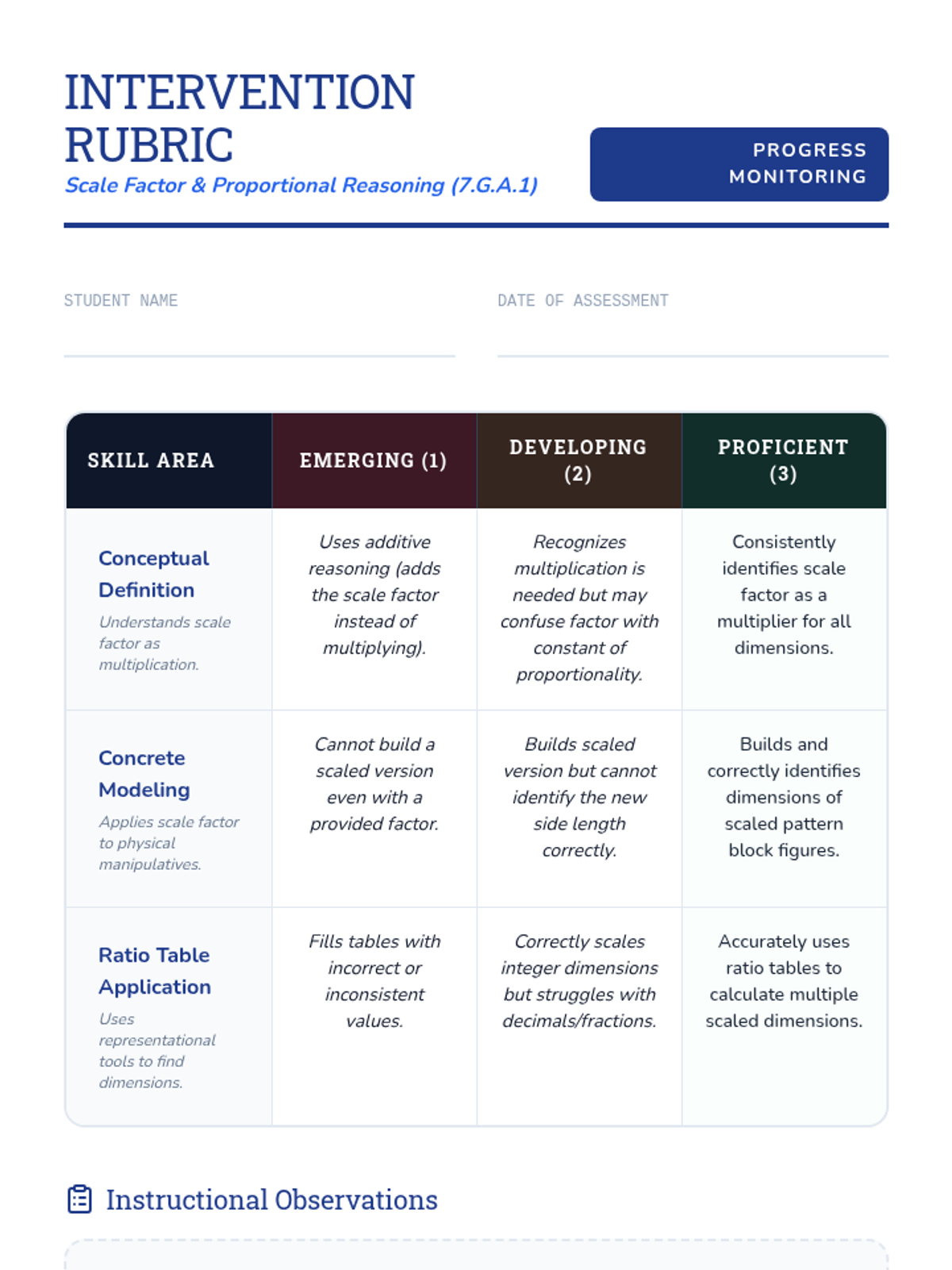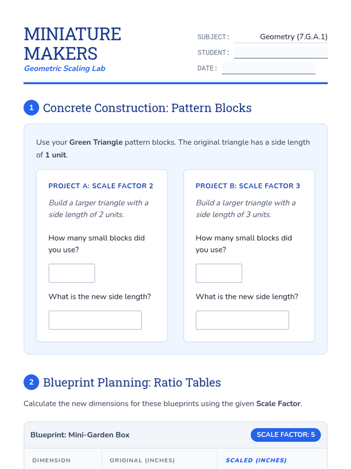 A Tier 2 intervention lesson focusing on scale factor through concrete manipulatives (pattern blocks) and representational ratio tables, aligned with CO Standard 7.G.A.1.