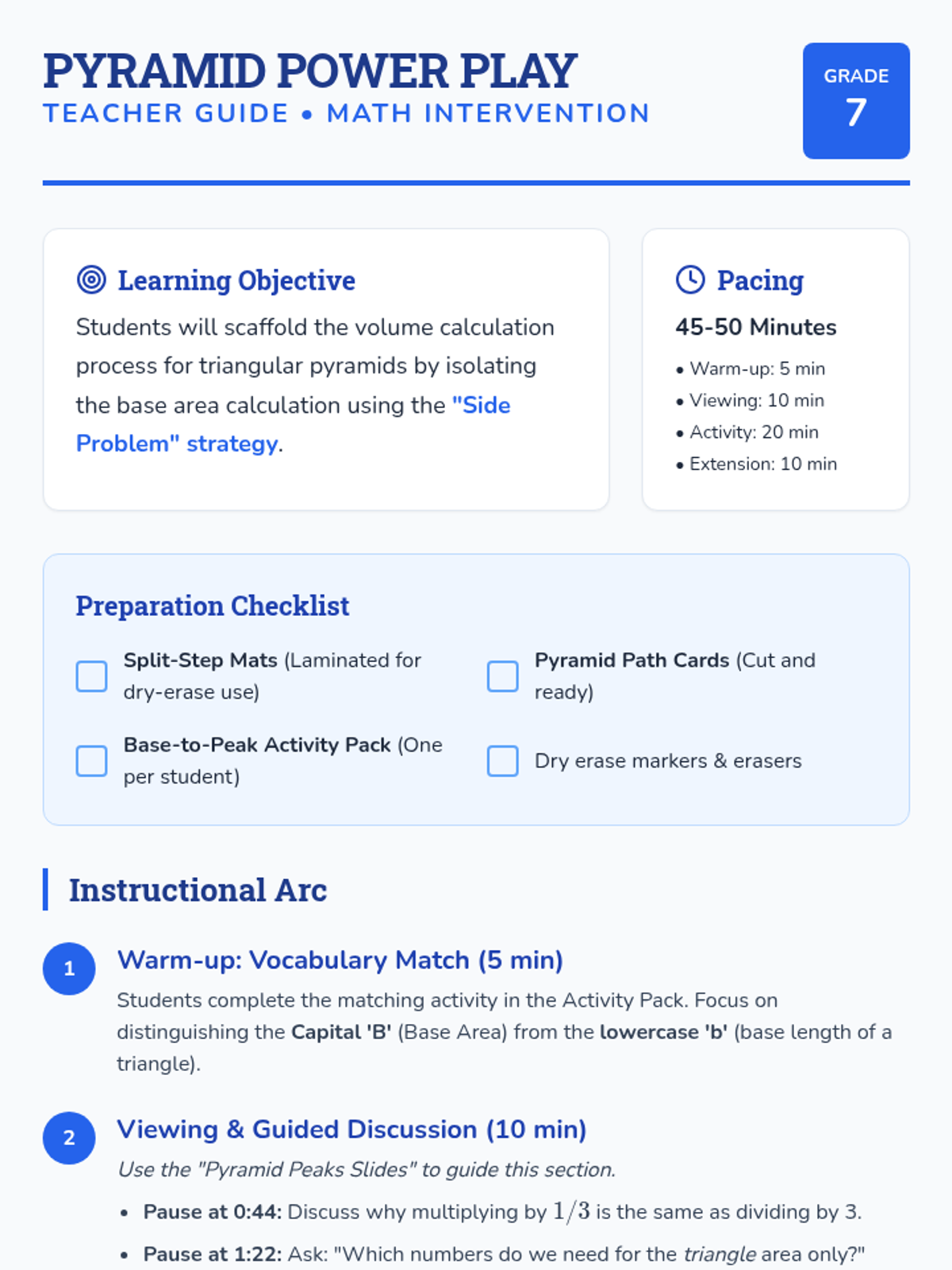 A scaffolded intervention lesson focusing on isolating the base area calculation ('The Side Problem') to find the volume of triangular pyramids. Students use a structured 'Two-Step Mat' to physically separate the math steps as modeled in the instructional video.