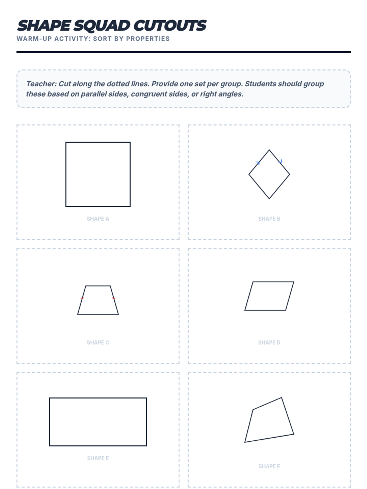 Strengthens geometric reasoning through 'Shape Sort' tasks, focusing on the properties and classification of polygons.