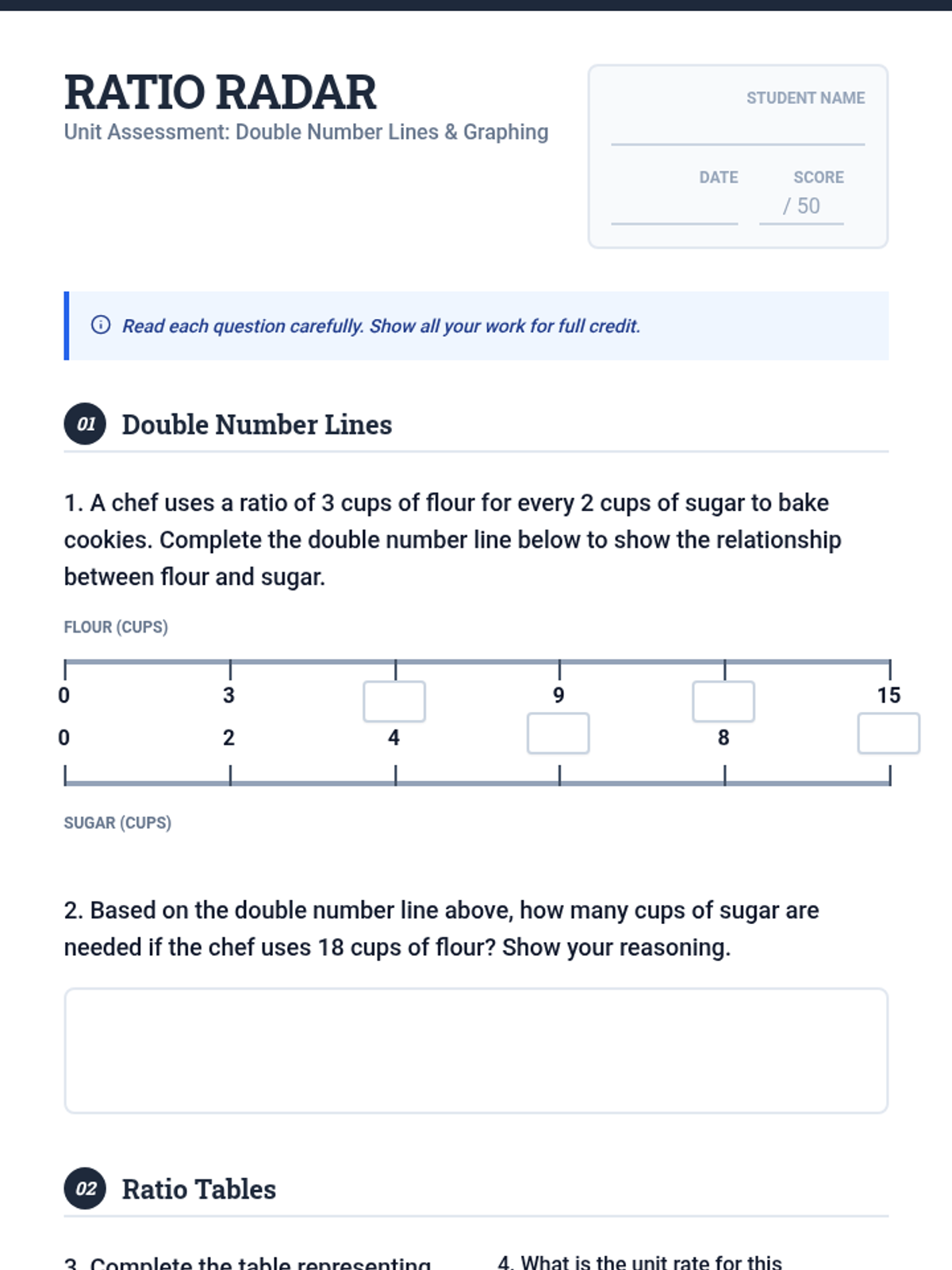 A comprehensive assessment covering double number lines, ratio tables, and coordinate plane graphing for 7th grade ratio relationships.