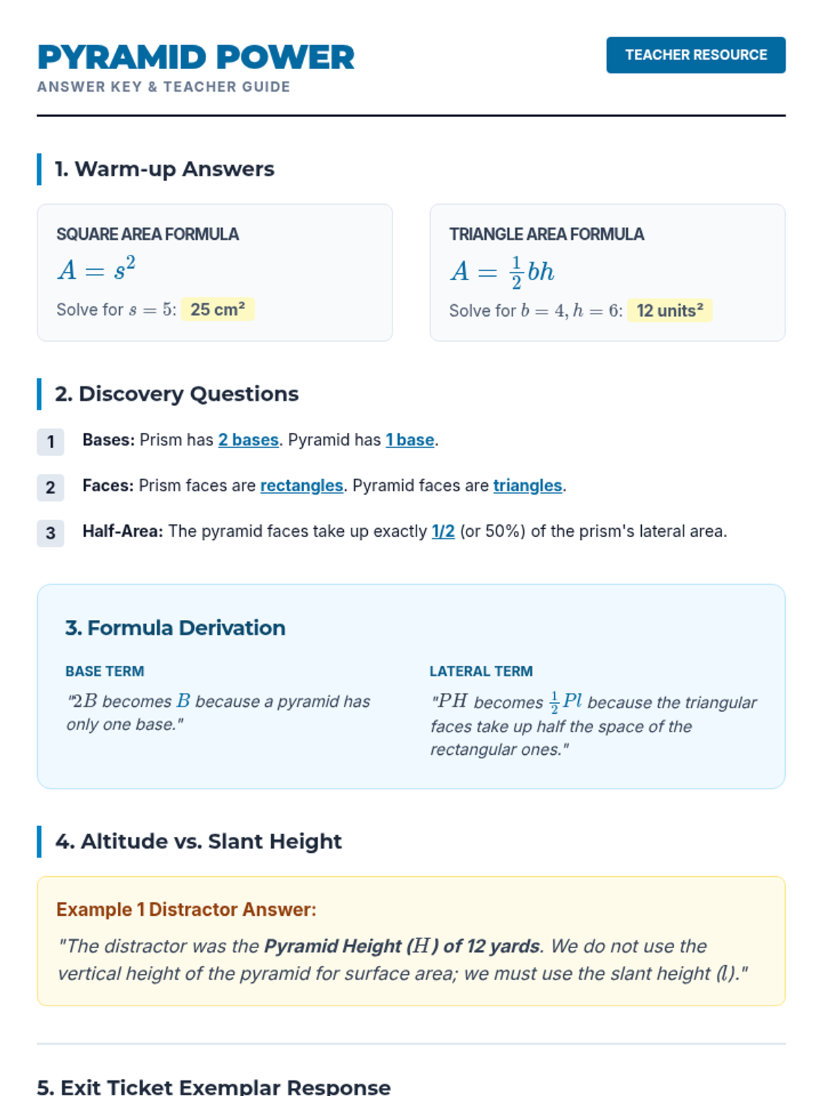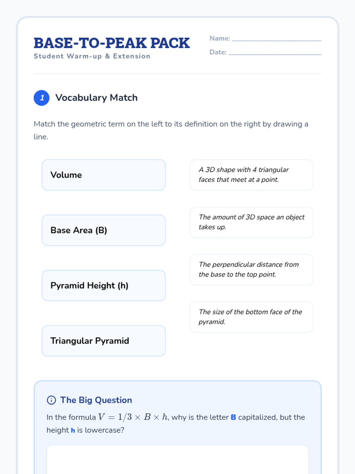 A 7th-grade math lesson focused on calculating the volume of square-based pyramids. Students move from conceptual prediction to formula application and algebraic problem-solving using the formula V = 1/3Bh.
