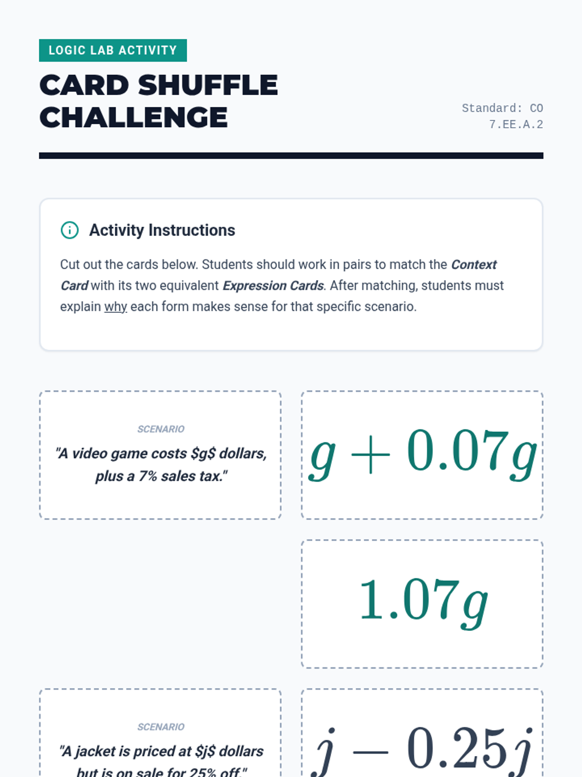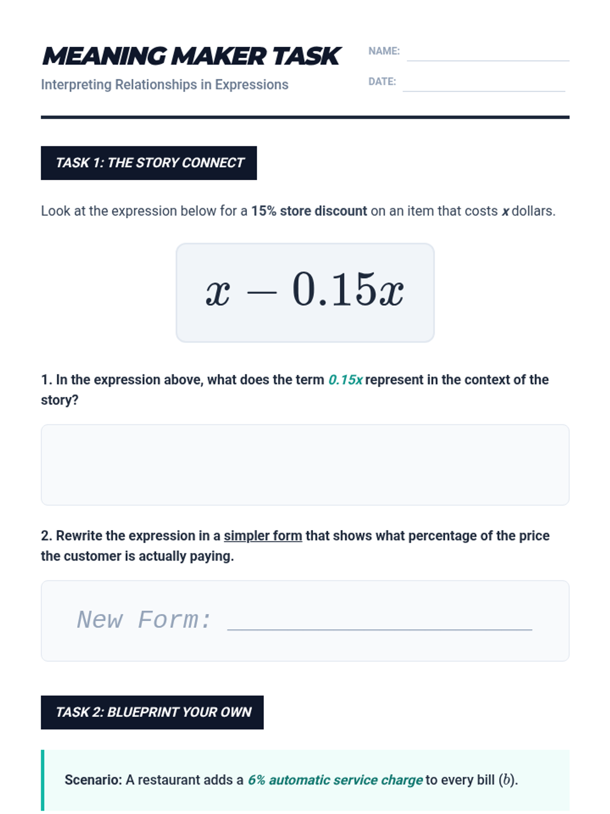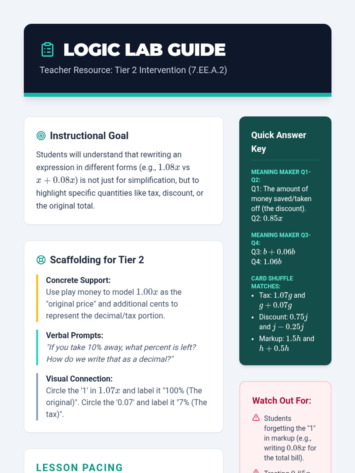 A Tier 2 intervention lesson focused on understanding how different forms of linear expressions represent specific relationships in real-world contexts, such as taxes, discounts, and geometry.