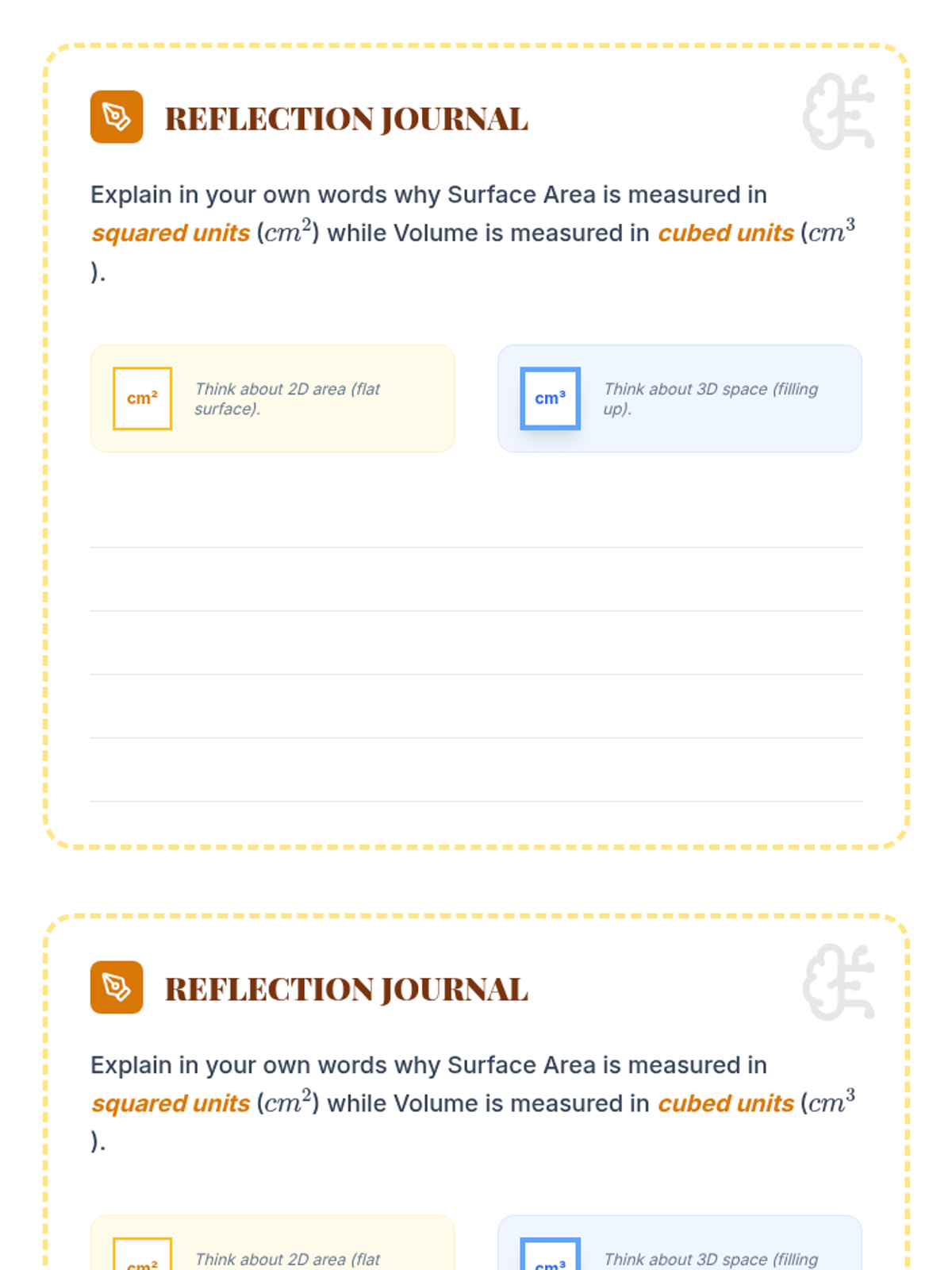 A comprehensive lesson focused exclusively on calculating the surface area of right prisms and composite 3D objects. Students learn to master the calculation of 5 and 6-faced prisms and the "Hidden Face" subtraction method for composite structures.