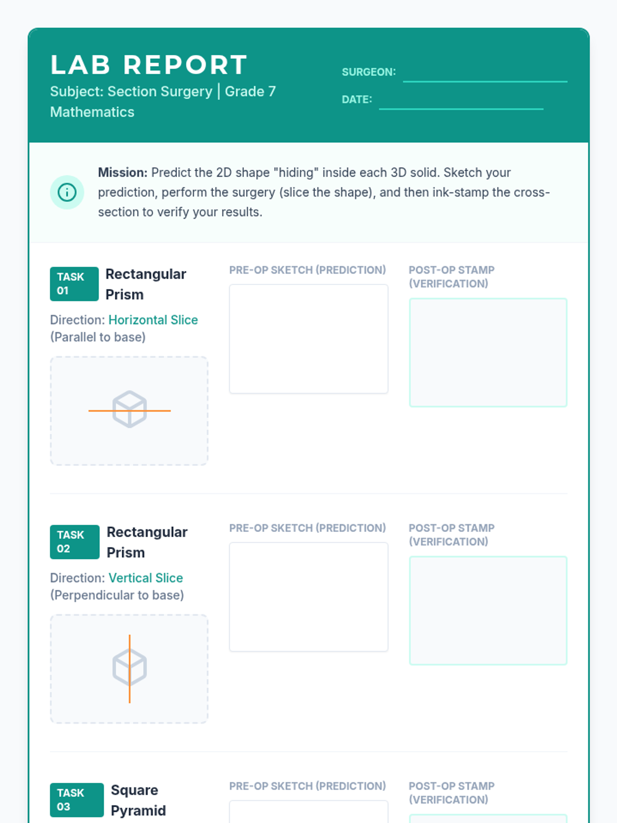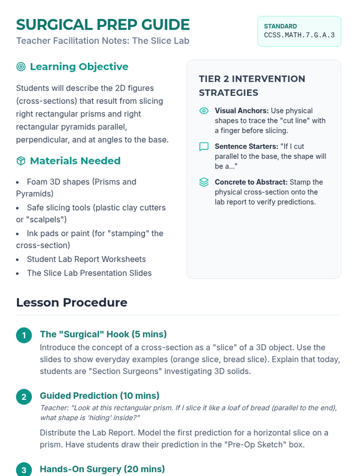 A Tier 2 intervention lesson for 7th-grade students focusing on identifying and describing 2D cross-sections of right rectangular prisms and pyramids through hands-on 'surgical' slicing activities.