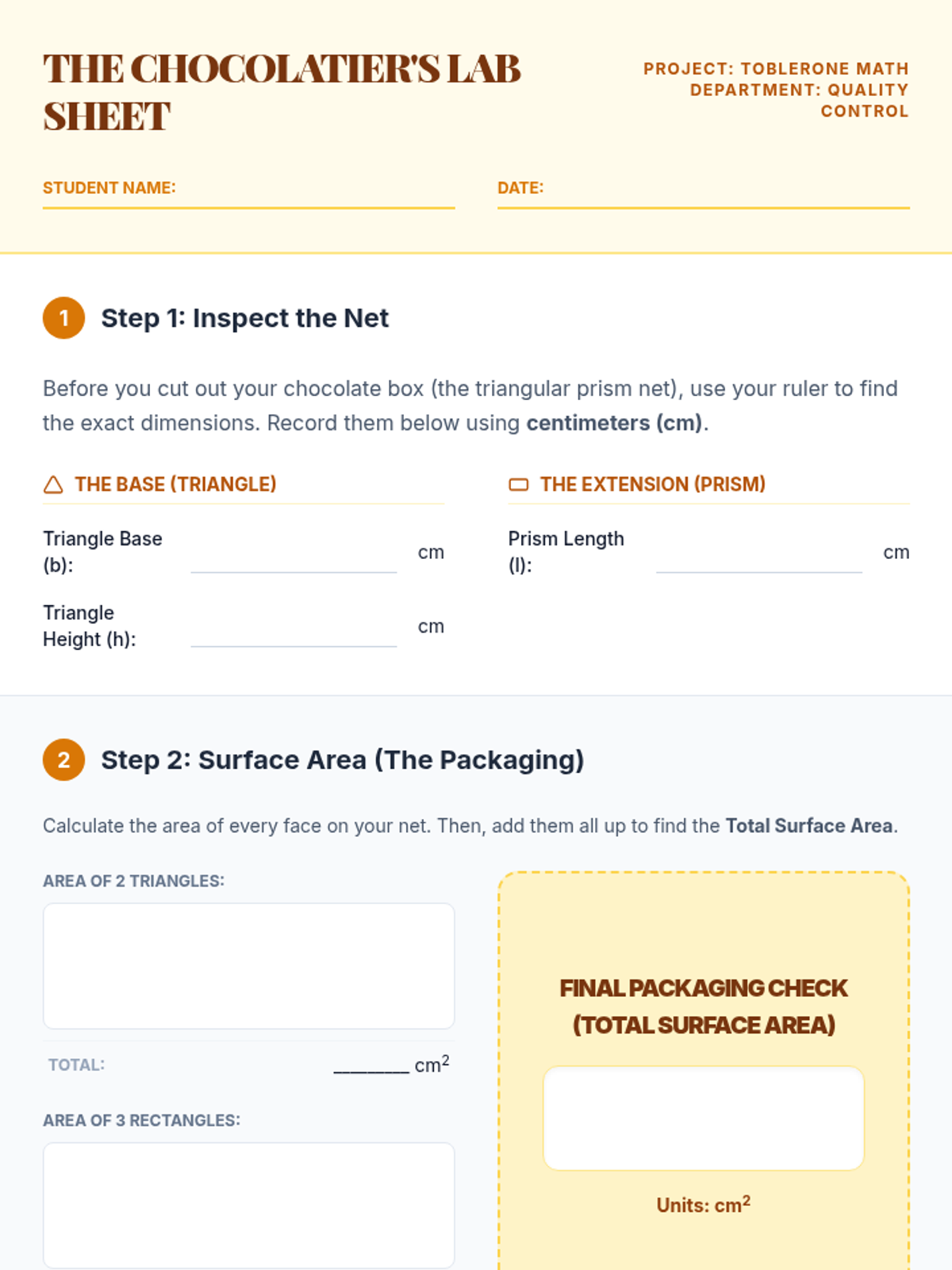 Students act as "Prism Architects" to design product packaging that minimizes surface area while maintaining a fixed volume. They apply surface area formulas to compare different geometric designs and identify the most cost-effective solution.