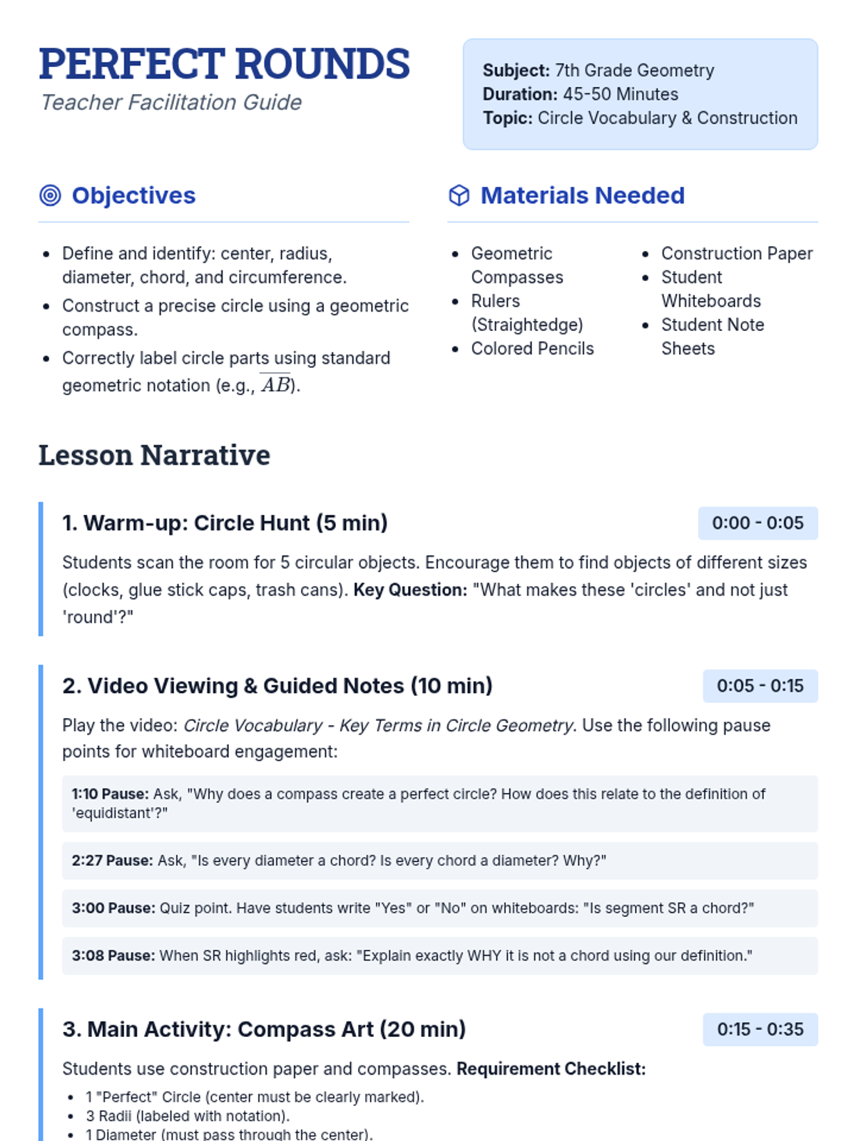 A foundational geometry lesson where students explore circle vocabulary through a video-guided hunt and precise geometric construction using compasses.