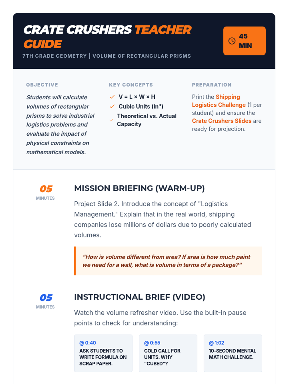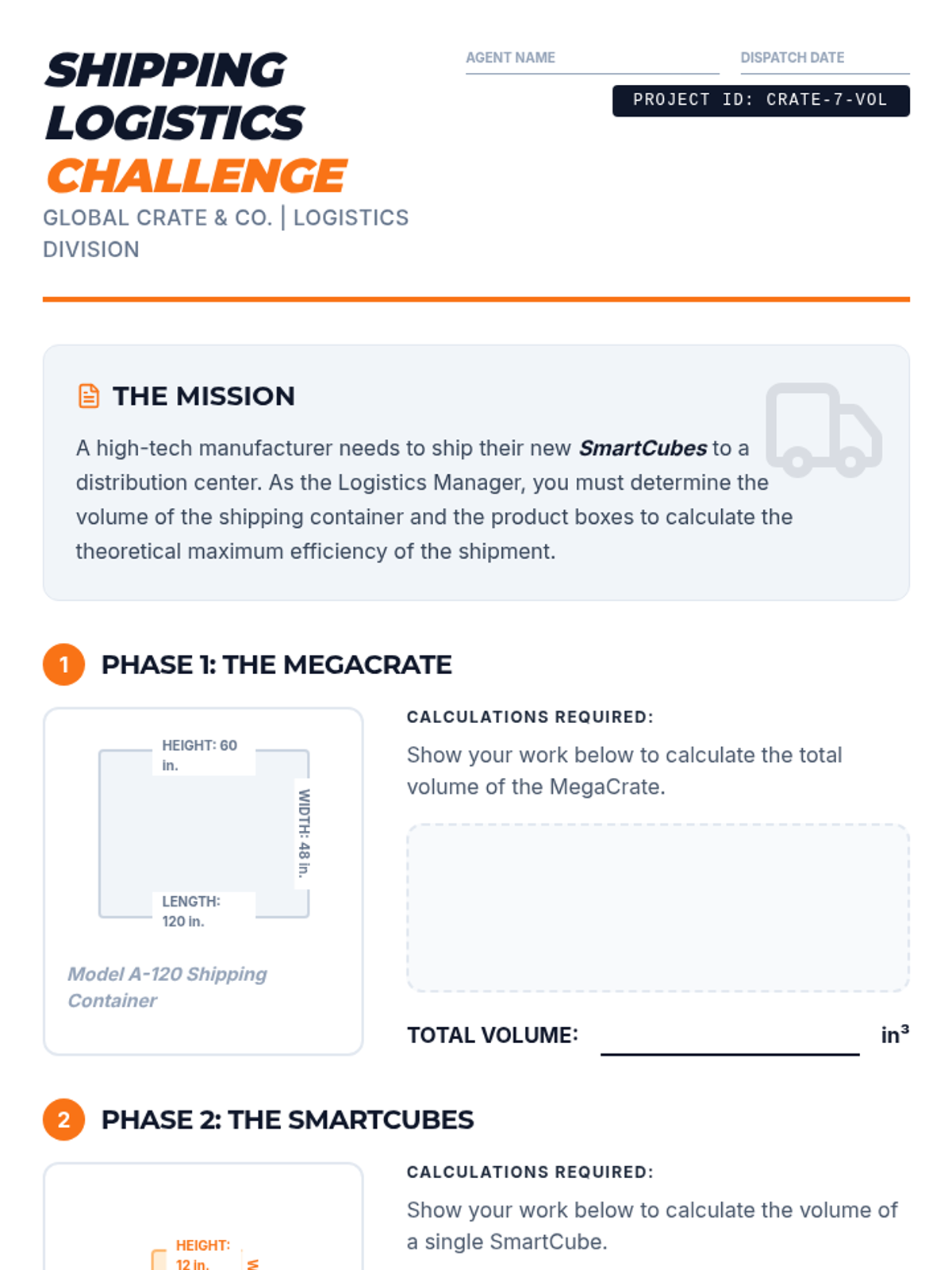 Students step into the role of shipping logistics managers to solve real-world volume problems. Using the formula for rectangular prisms, they calculate the capacity of shipping crates and analyze how orientation and 'wasted space' affect actual storage capacity.