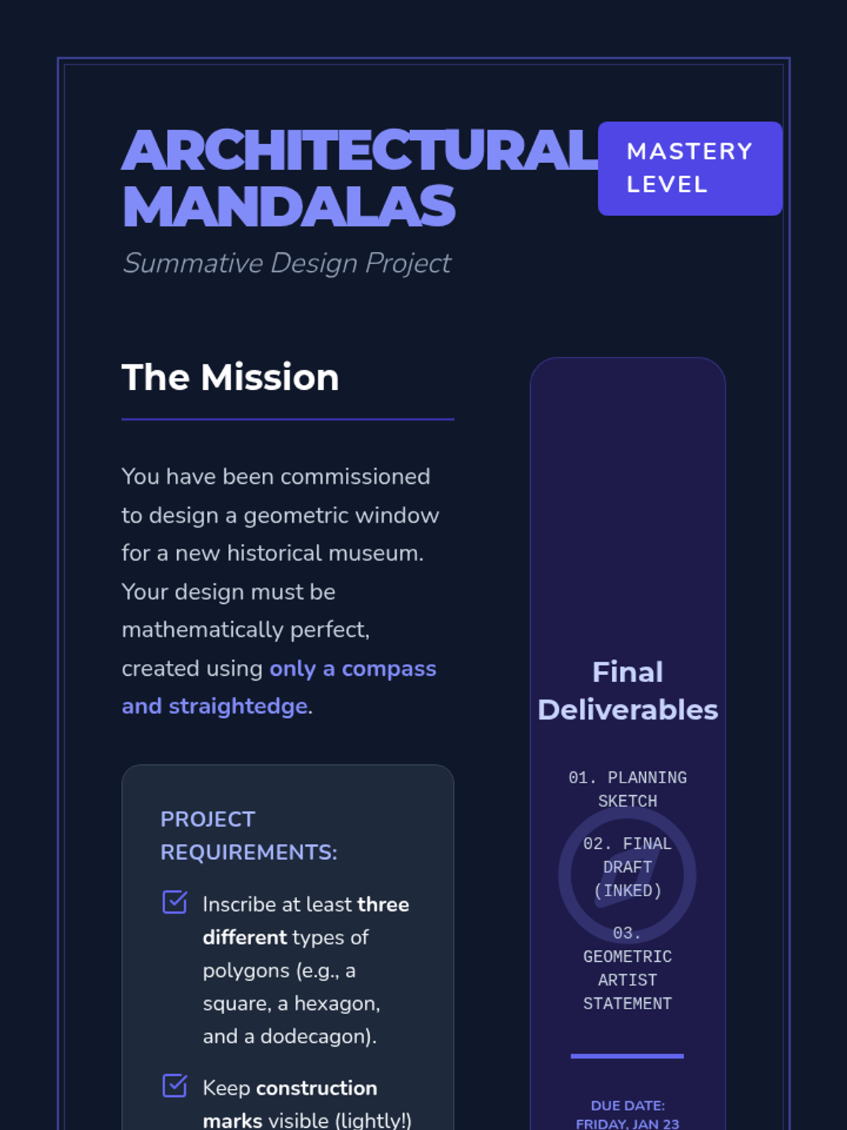 Students synthesize all polygon construction techniques to create a complex, symmetrical mandala.