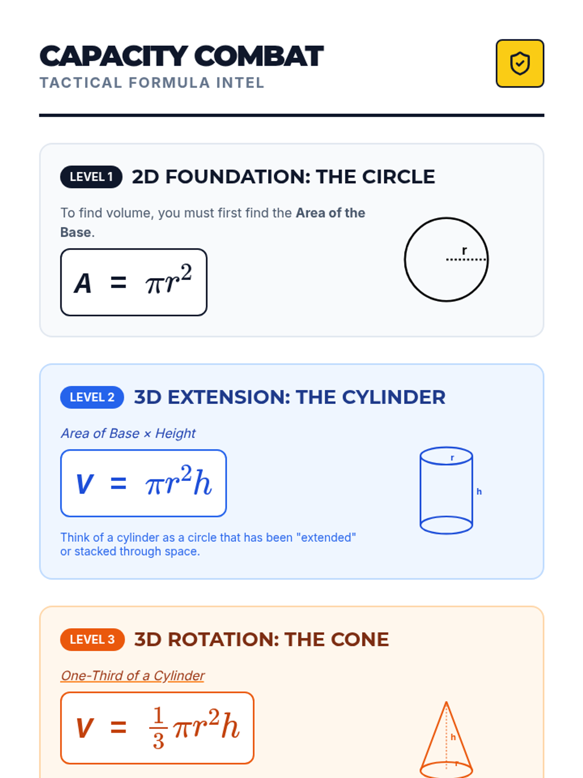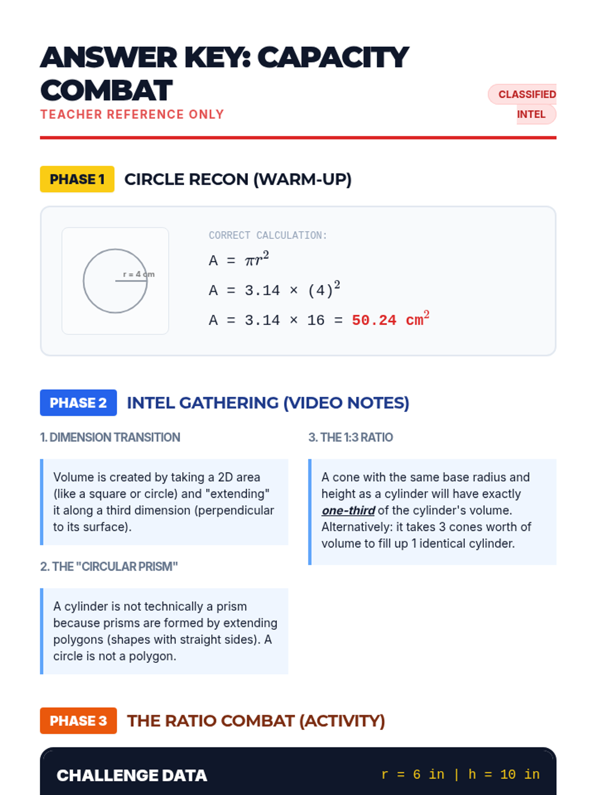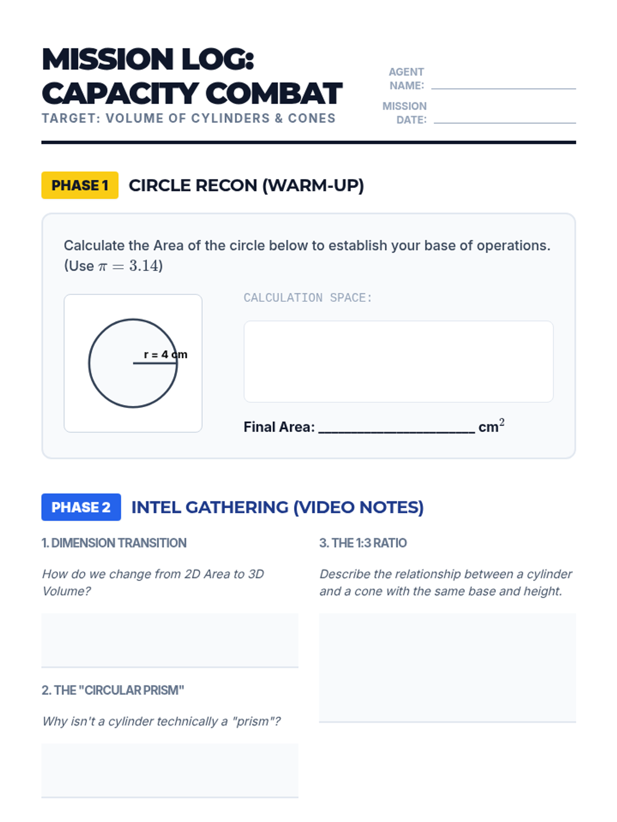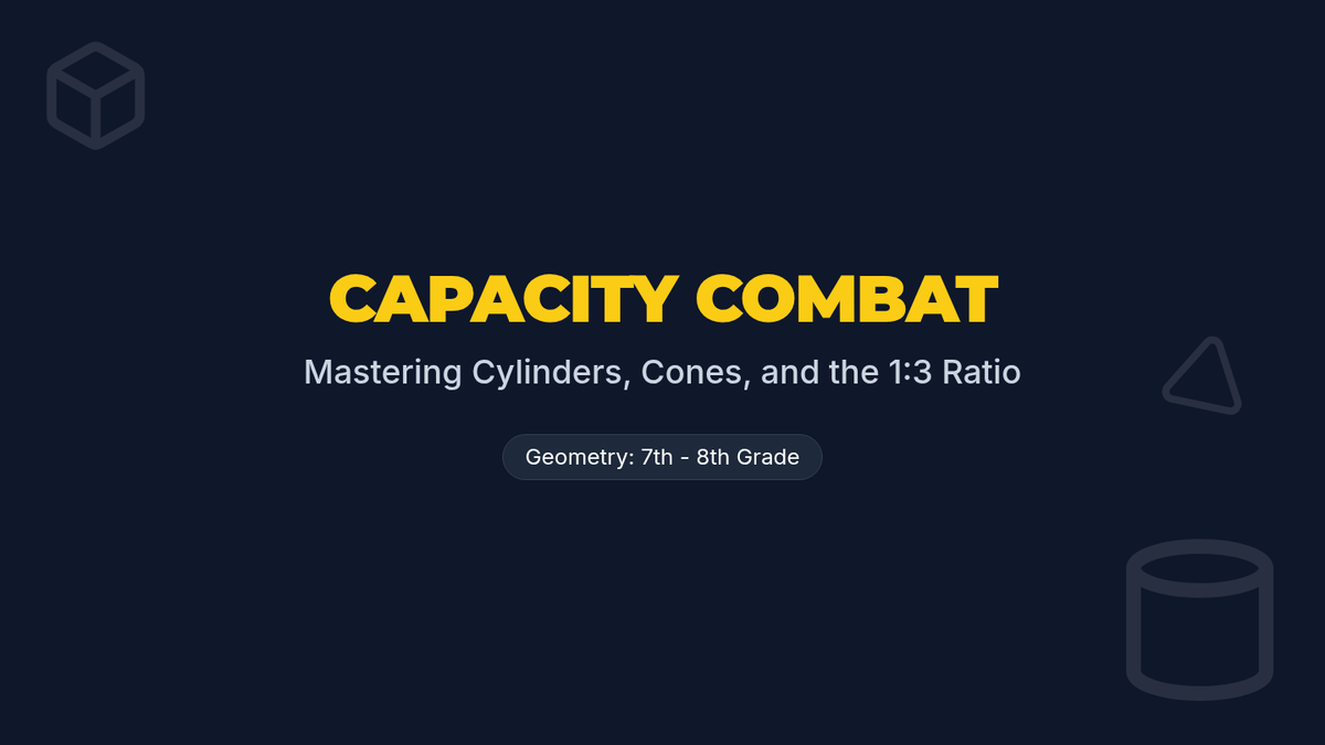 A high-energy geometry lesson where students master the volume of cylinders and cones, discovering the 1:3 relationship through calculation and video analysis.