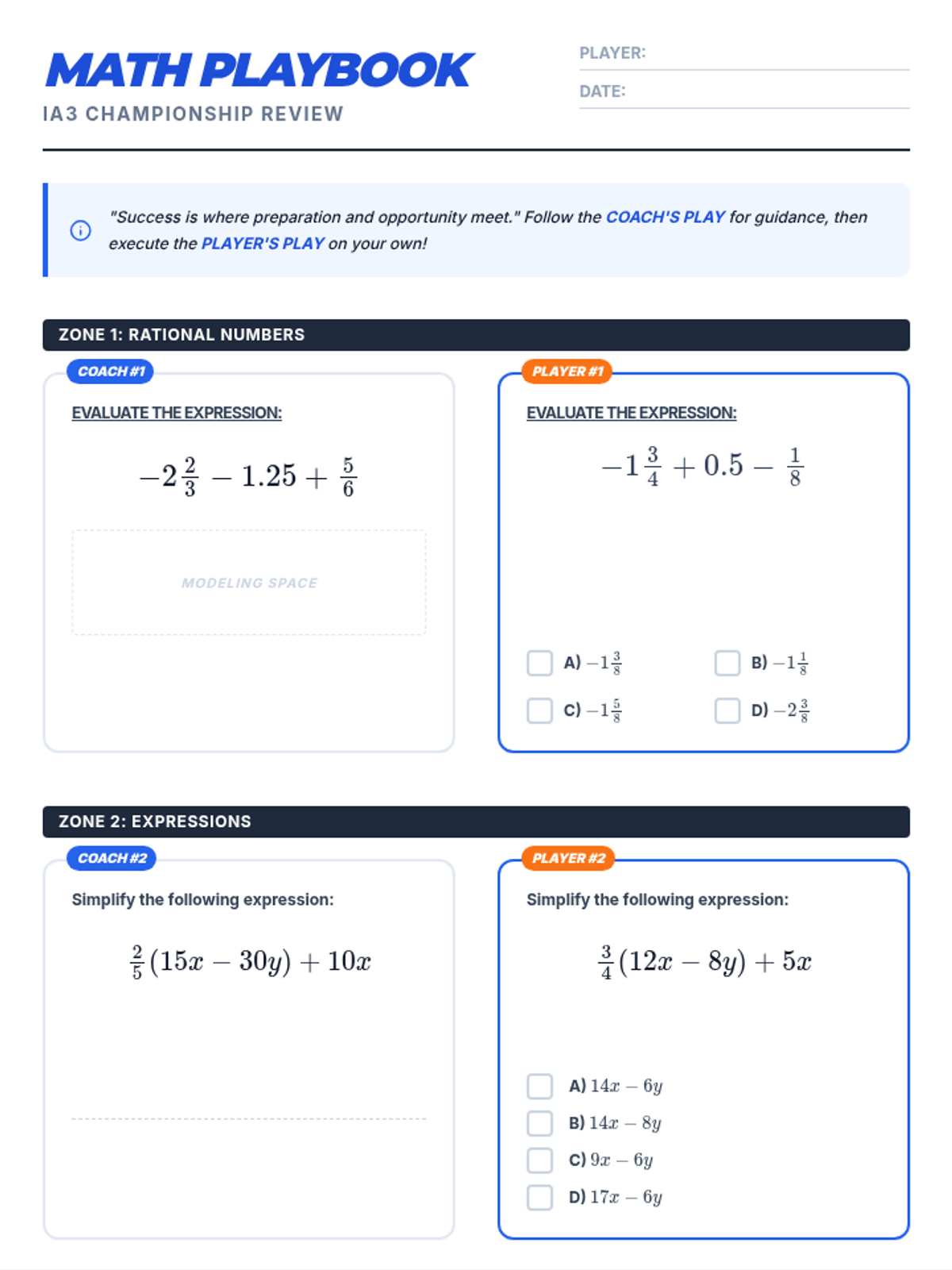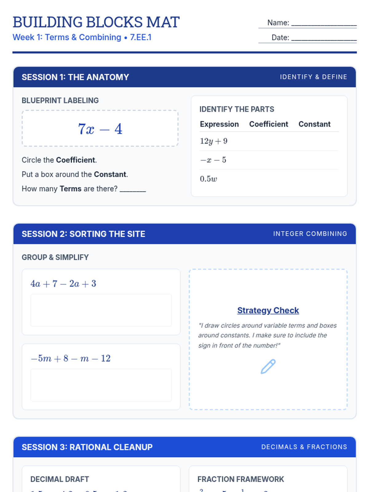 Focuses on translating real-world phrases into algebraic expressions and evaluating them using 'Contemplate then Calculate' strategies.