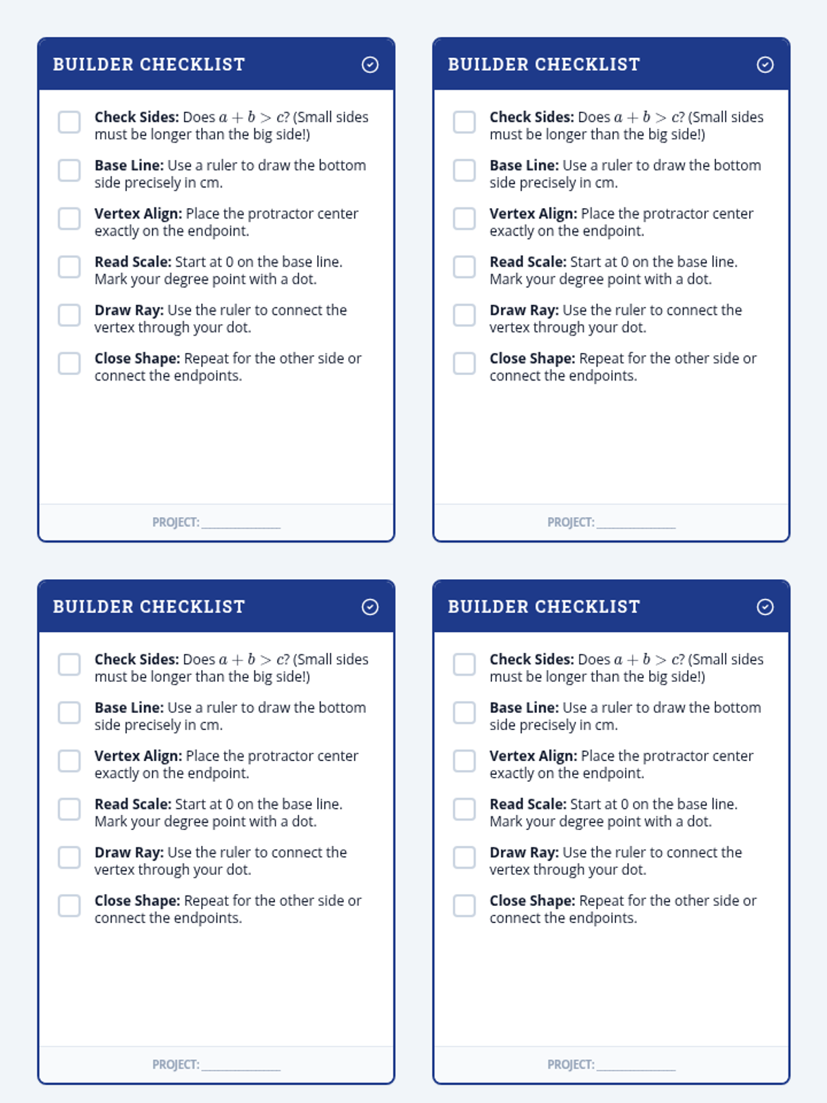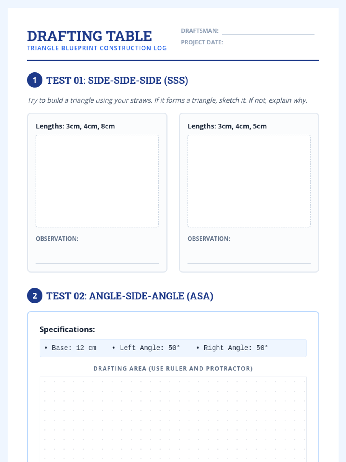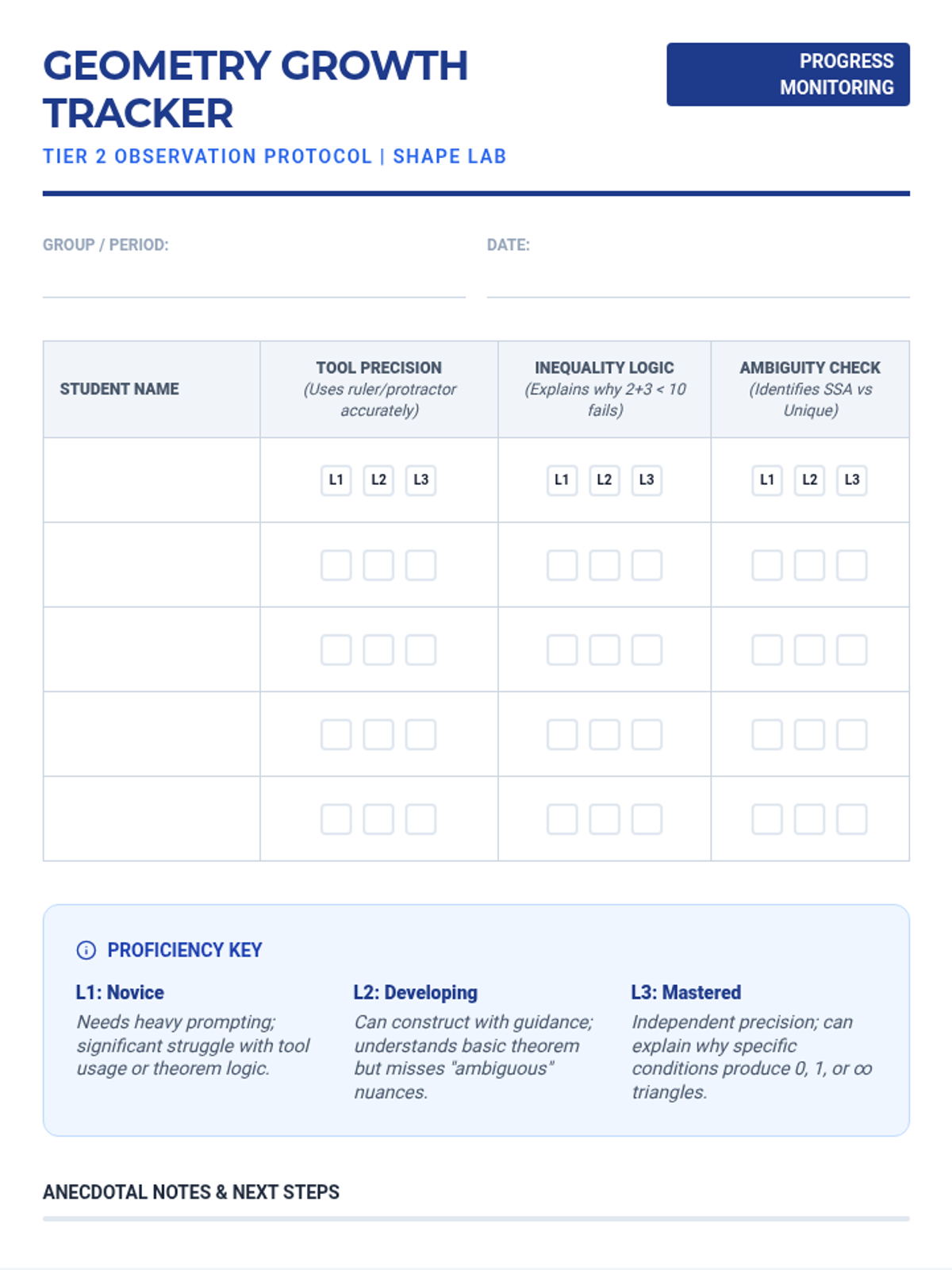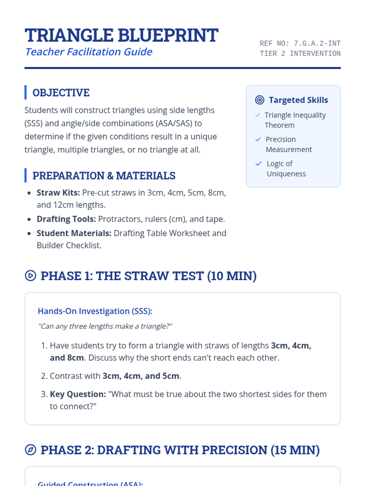 A Tier 2 intervention lesson focused on the construction of triangles using rulers and protractors. Students explore how different side and angle conditions lead to unique, multiple, or no triangles through scaffolded, hands-on architectural tasks.