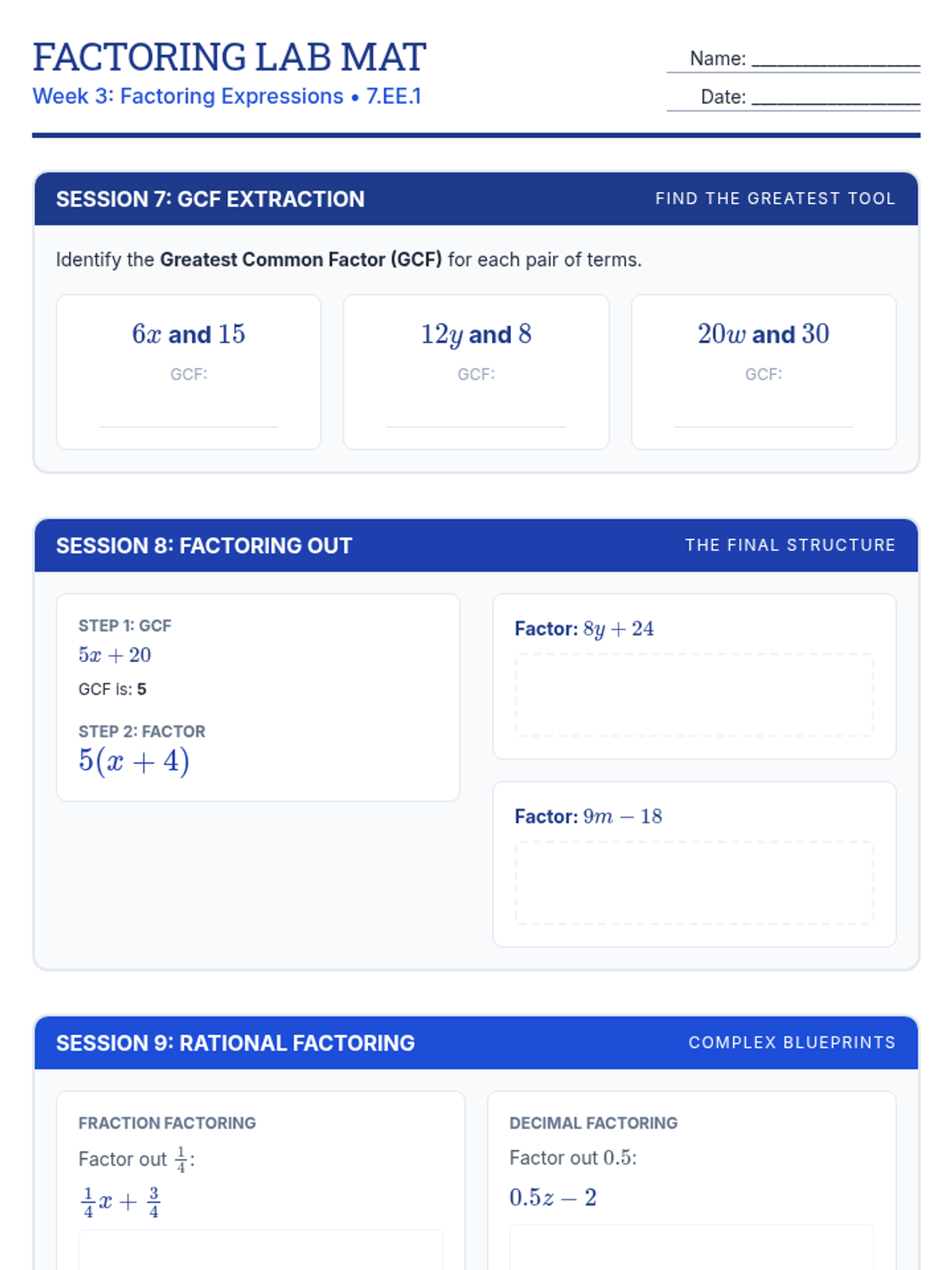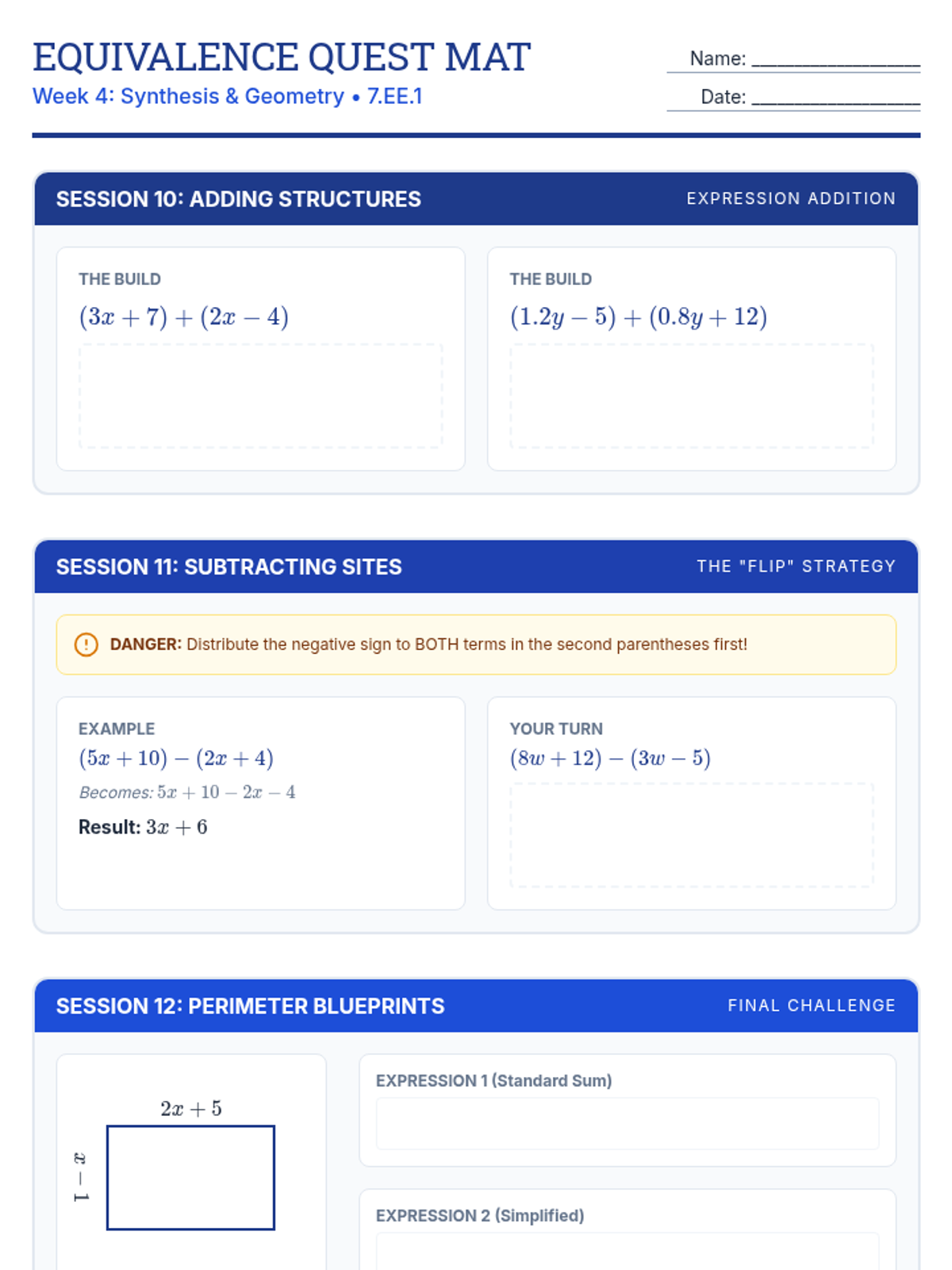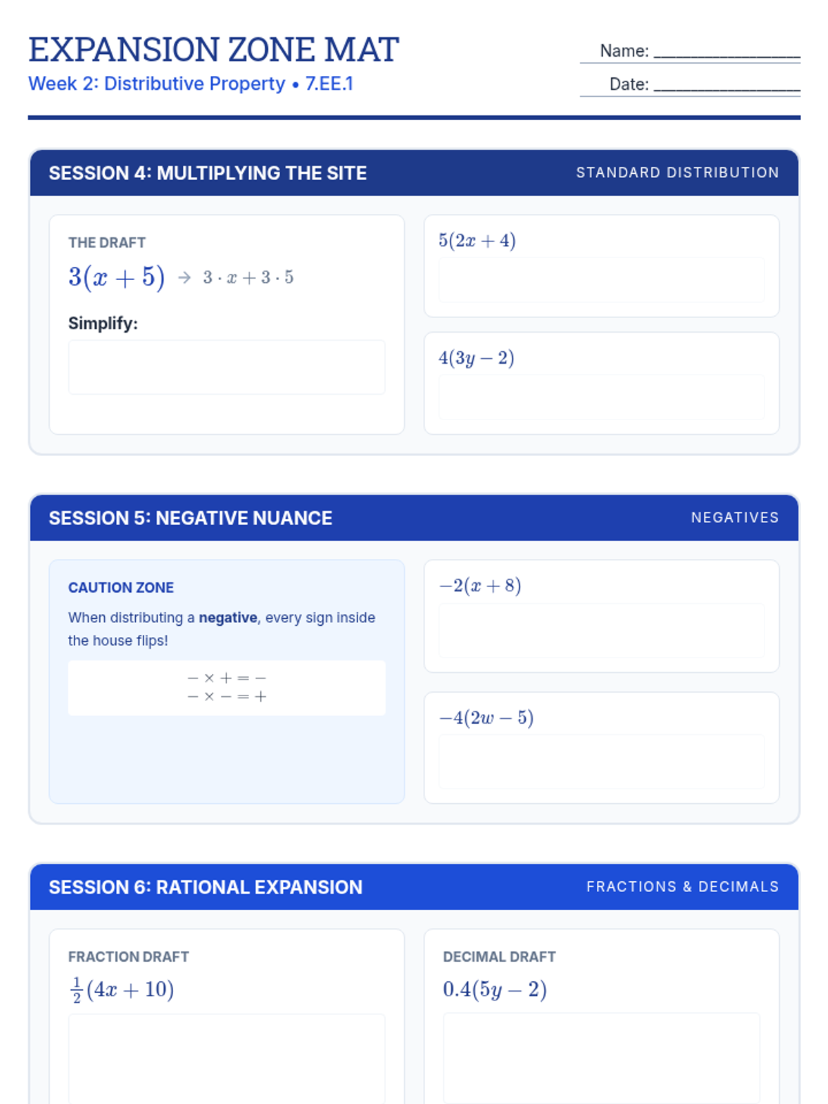 Focuses on expanding linear expressions using the distributive property, including work with negative numbers and rational coefficients.
