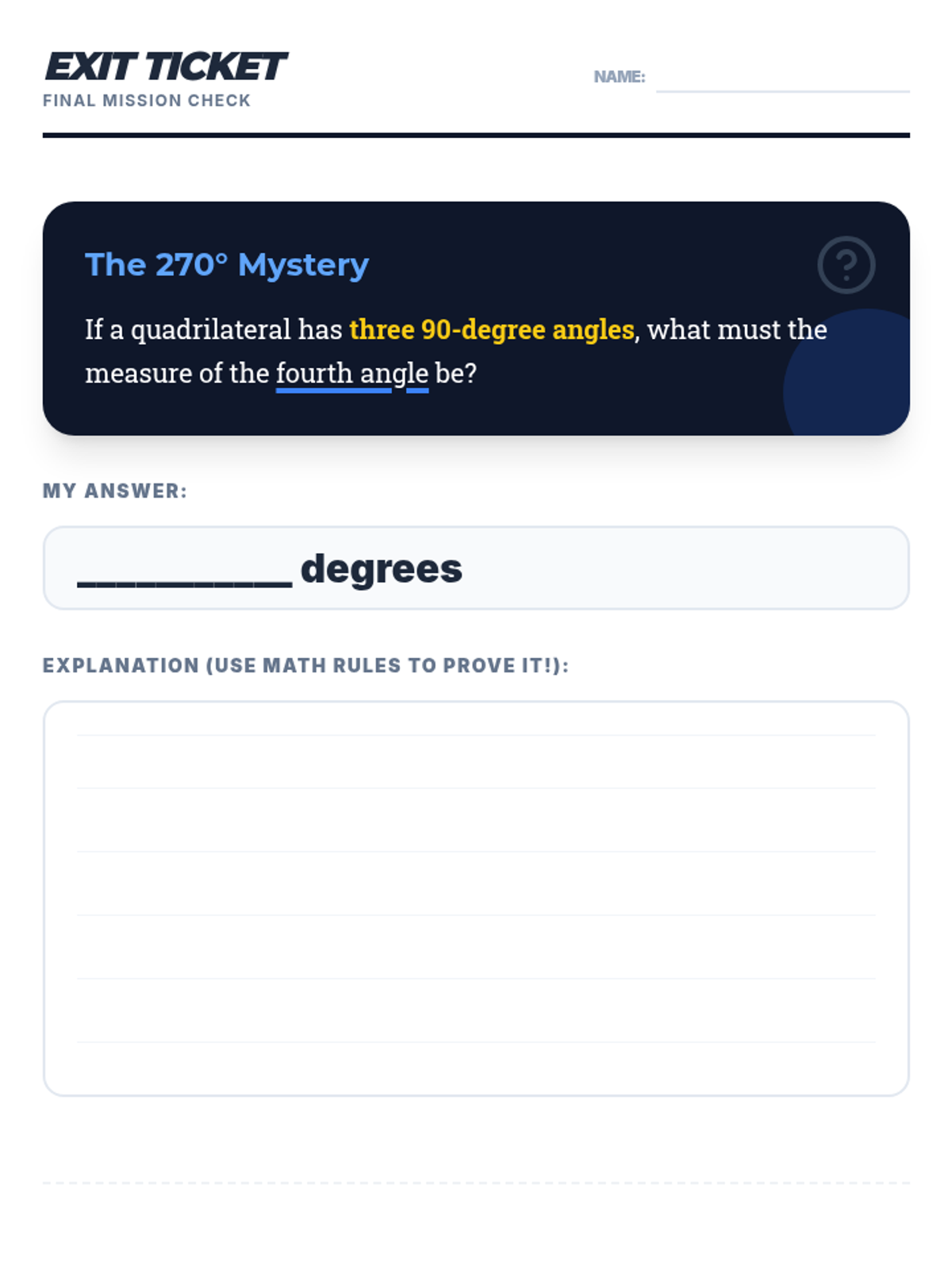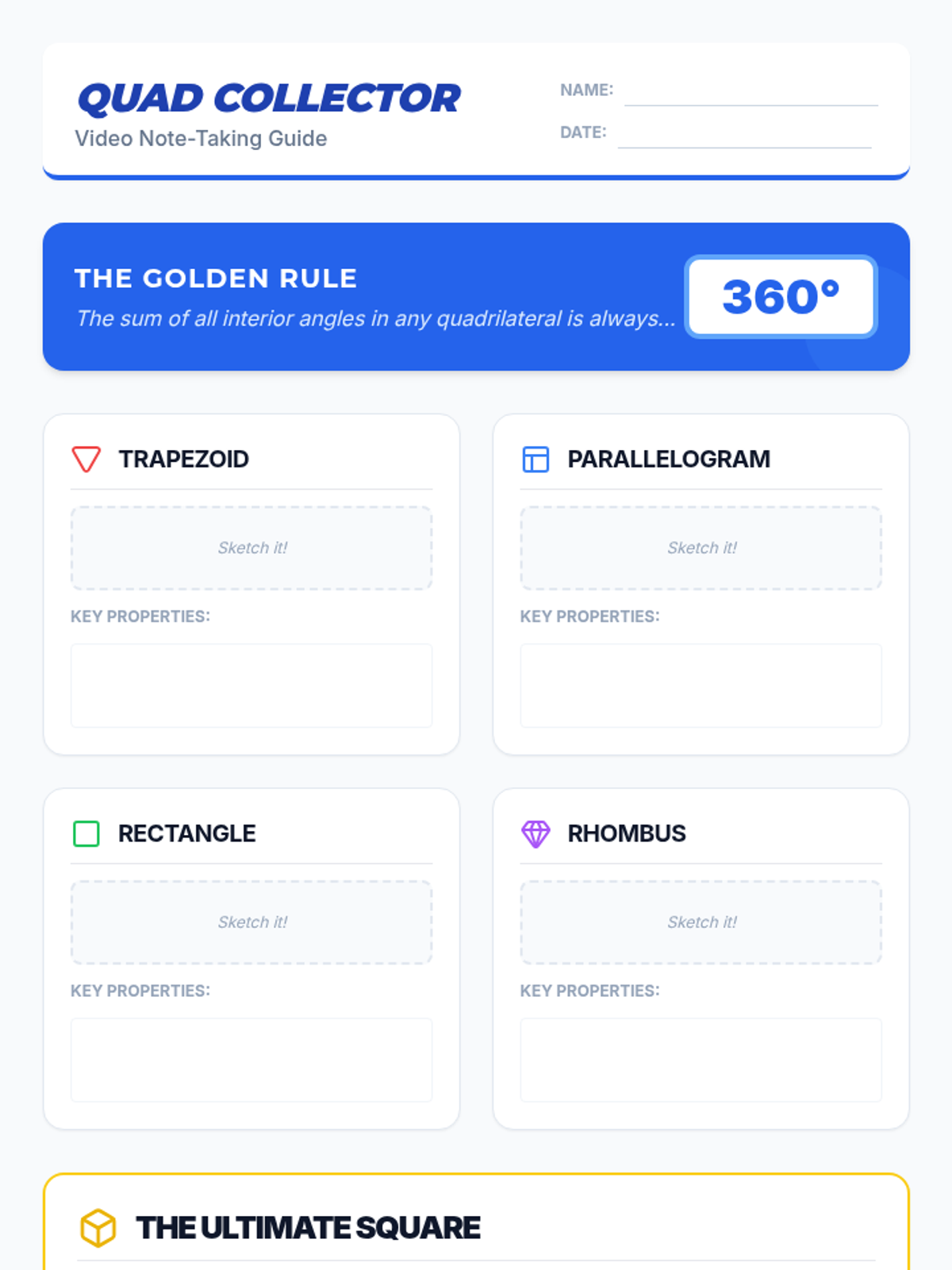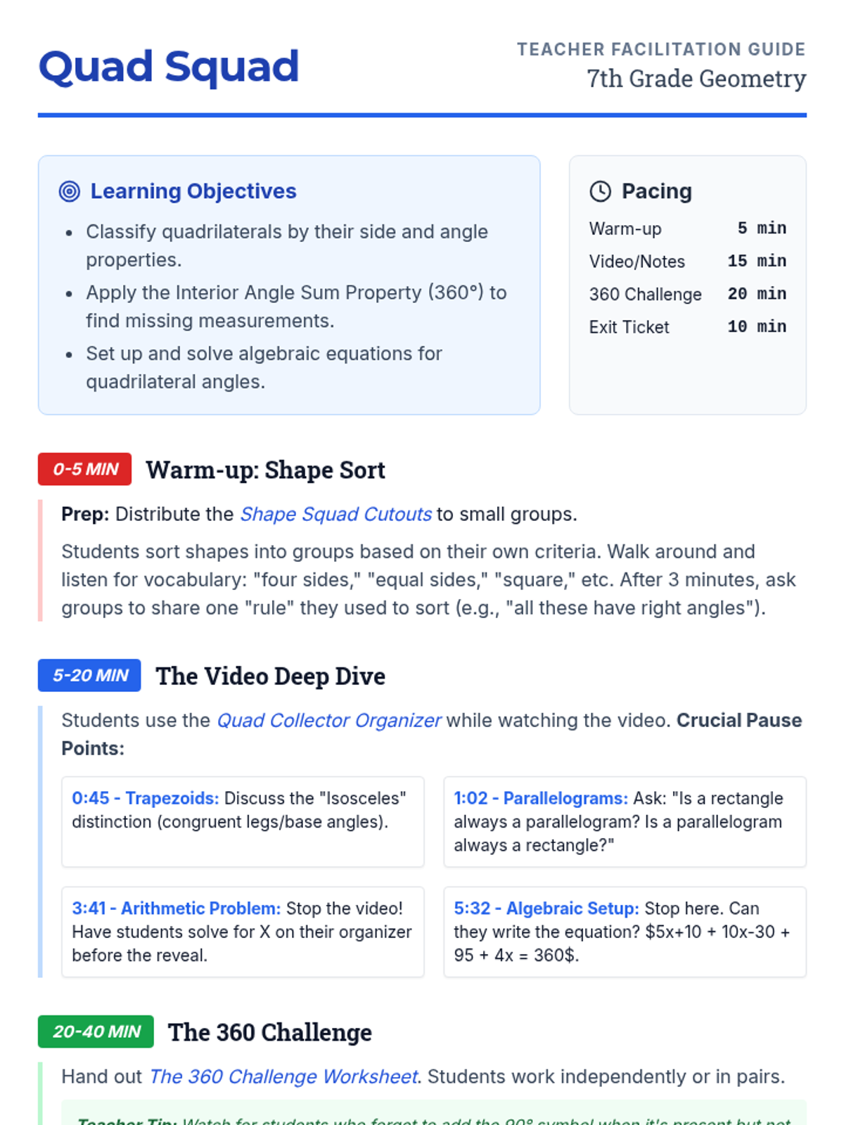 Students will classify quadrilaterals based on their properties (parallel sides, congruent sides, right angles) and calculate missing interior angles using the 360-degree sum property. The lesson includes a hands-on sorting warm-up, a guided video note-taking session, and a problem-solving challenge.