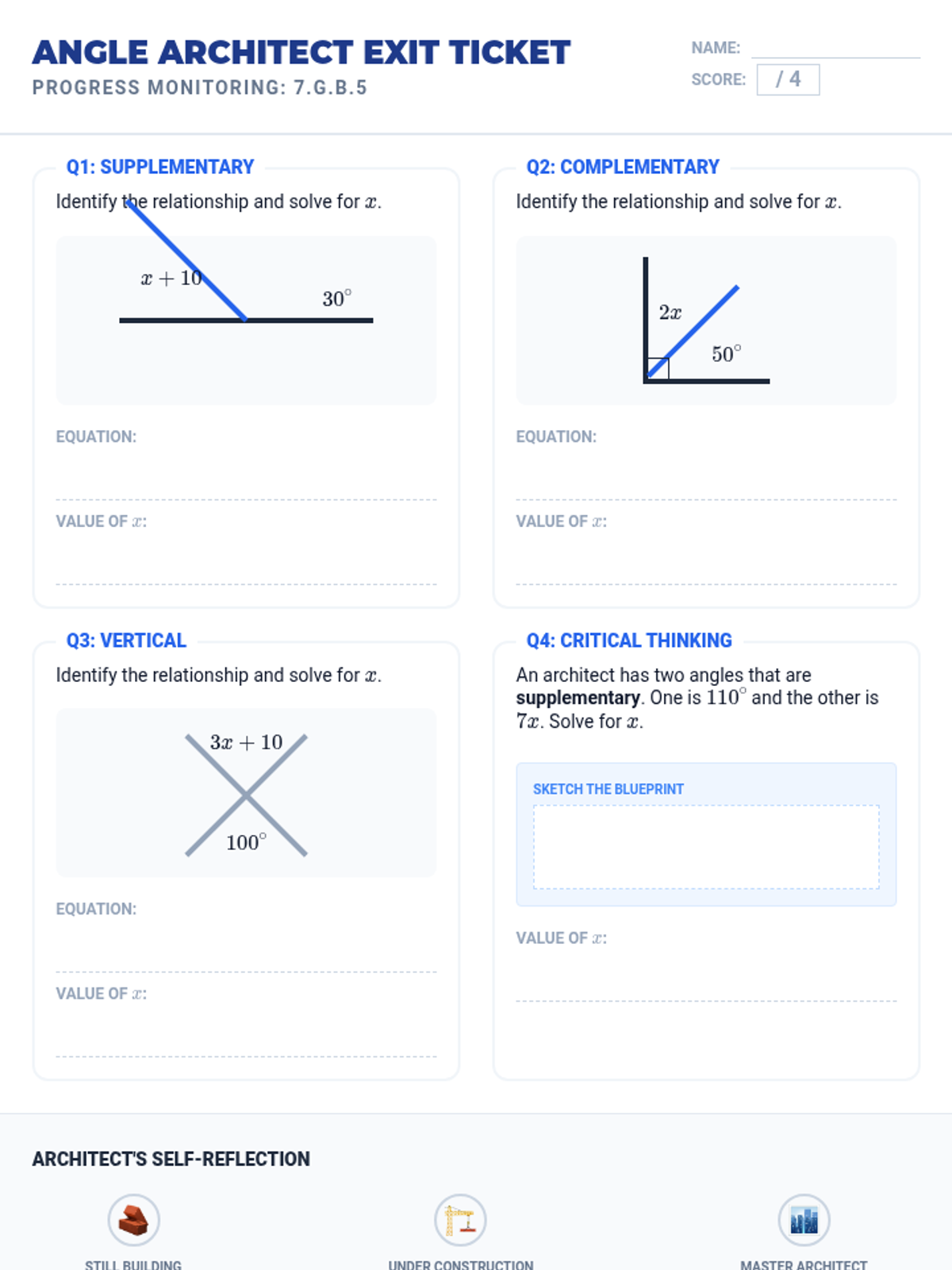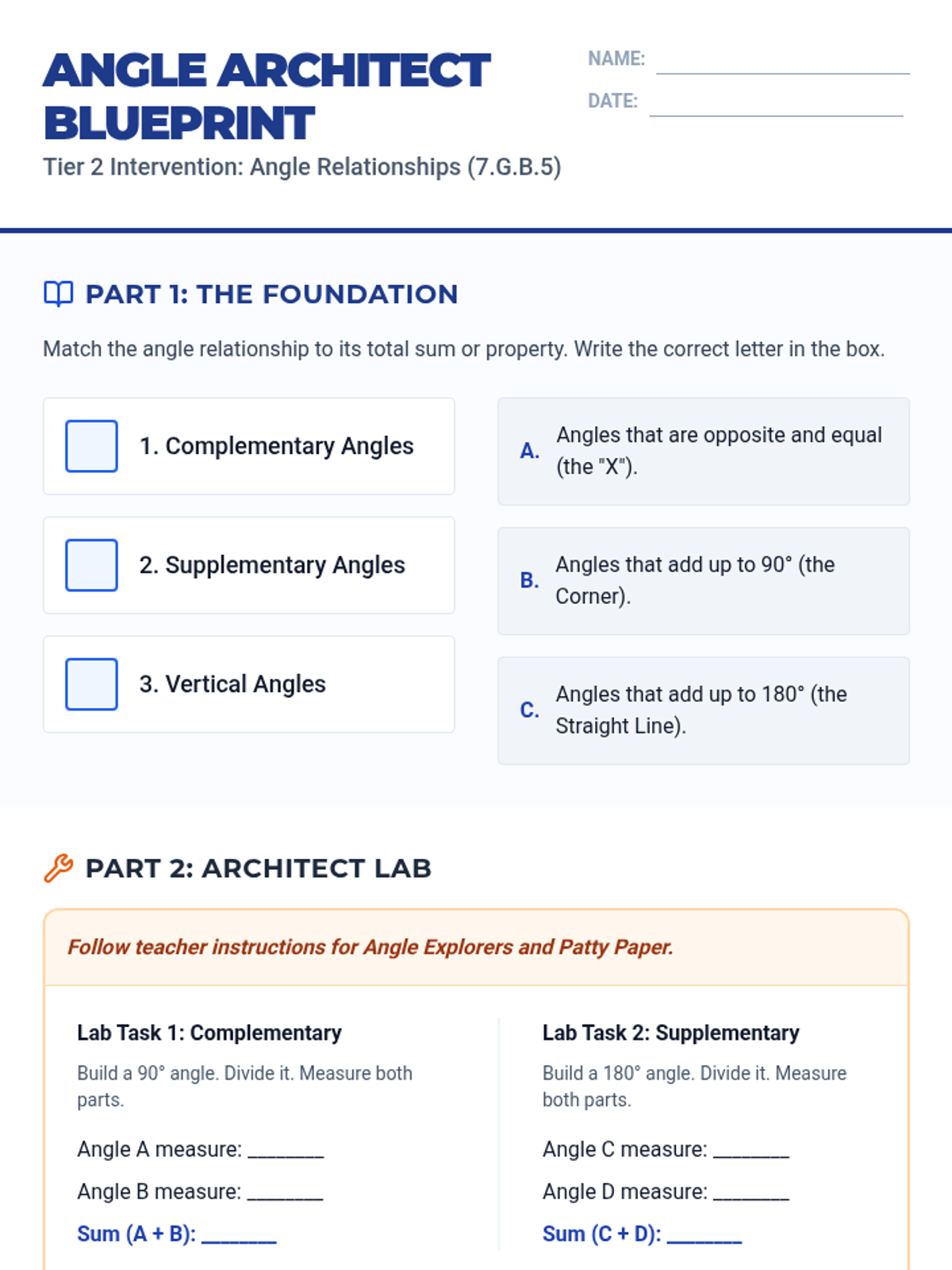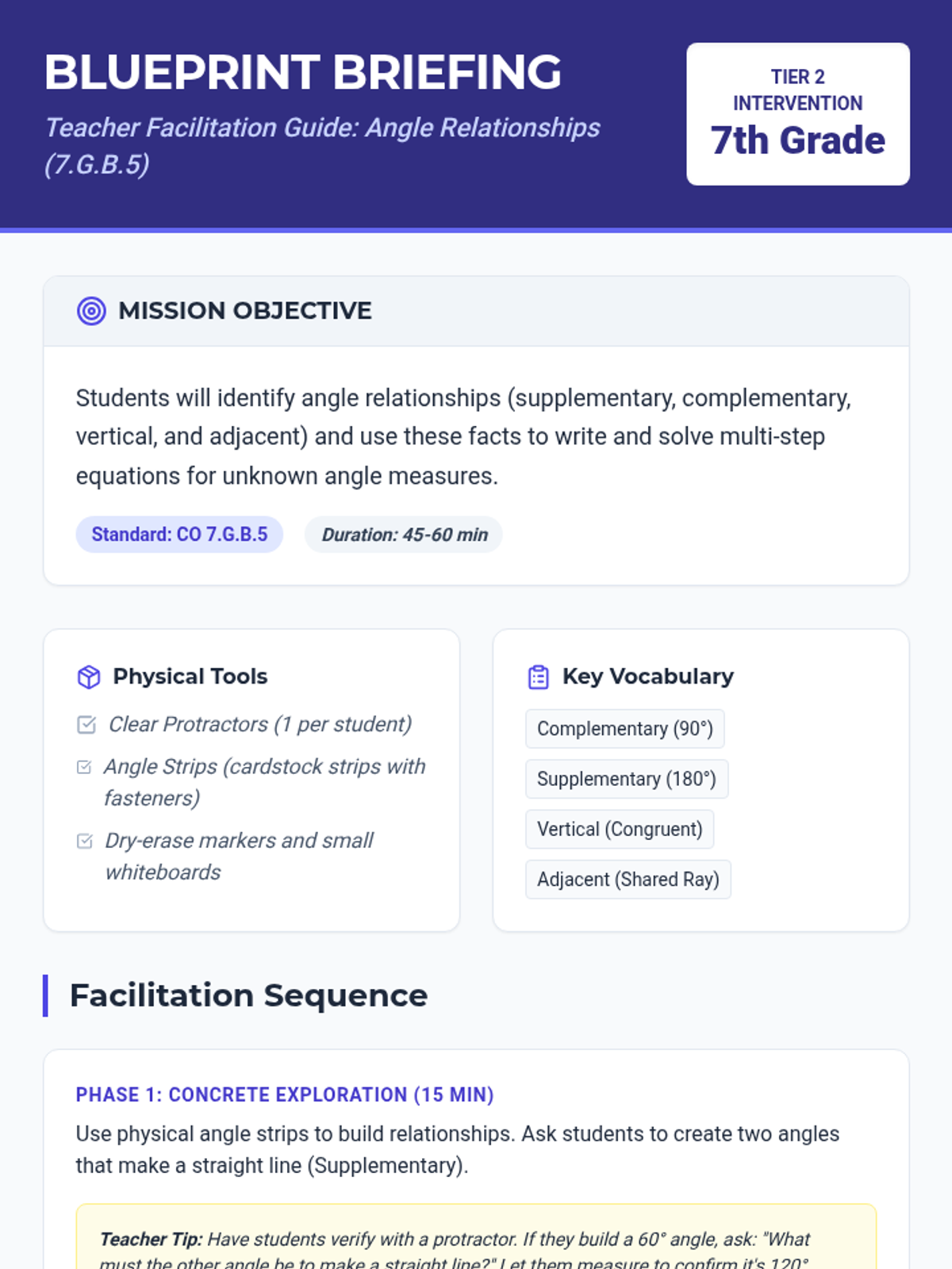 A Tier 2 intervention lesson focusing on the geometric relationships of supplementary, complementary, vertical, and adjacent angles to solve for unknown variables. Includes hands-on scaffolding with protractors and guided algebraic modeling.