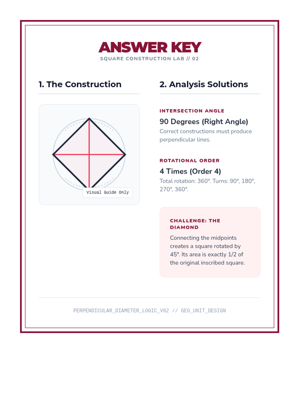 Students use perpendicular bisector techniques to draw perpendicular diameters in a circle. By connecting the endpoints, they construct a perfect inscribed square and analyze its 90-degree rotational symmetry.
