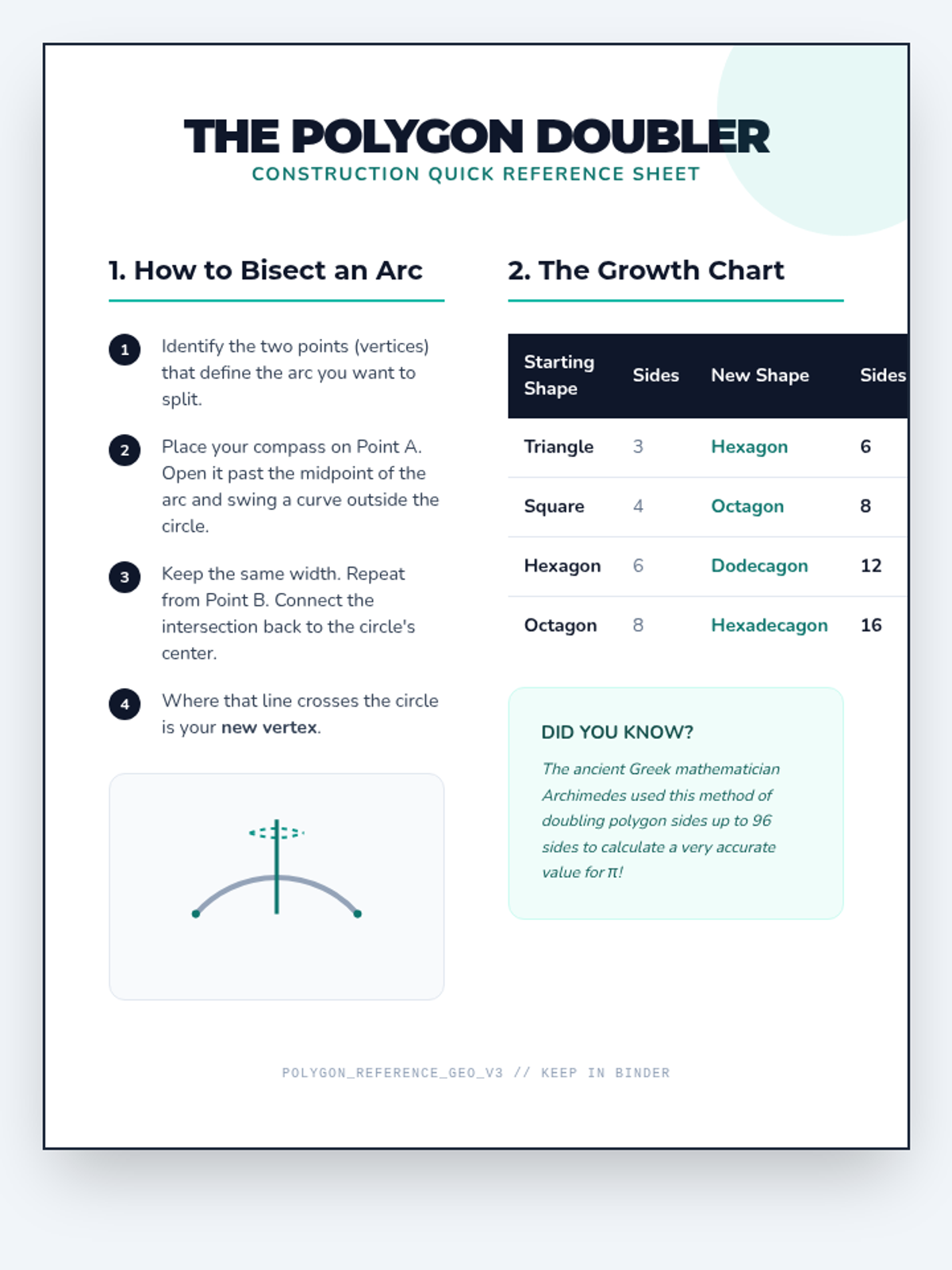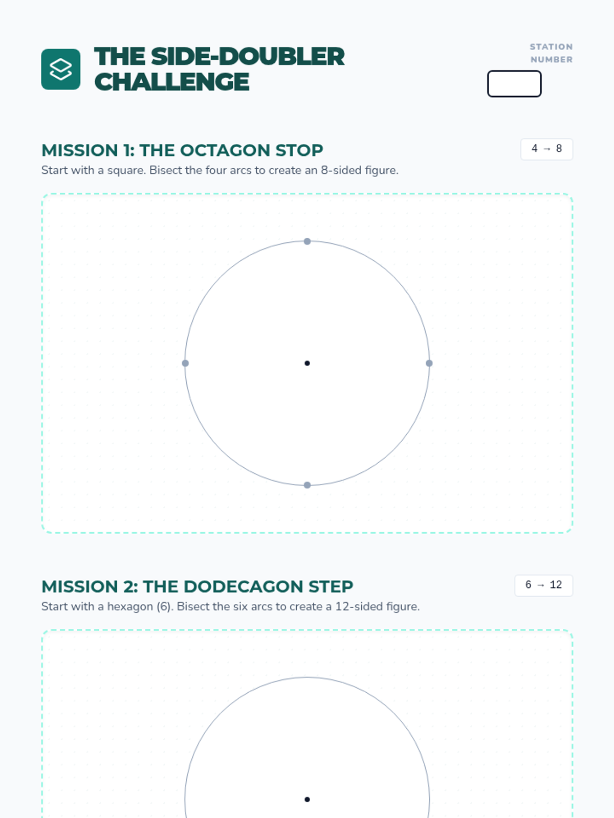 Students learn to bisect arcs to double the number of sides in their polygons. They construct octagons and dodecagons, observing how the figure increasingly resembles the parent circle.