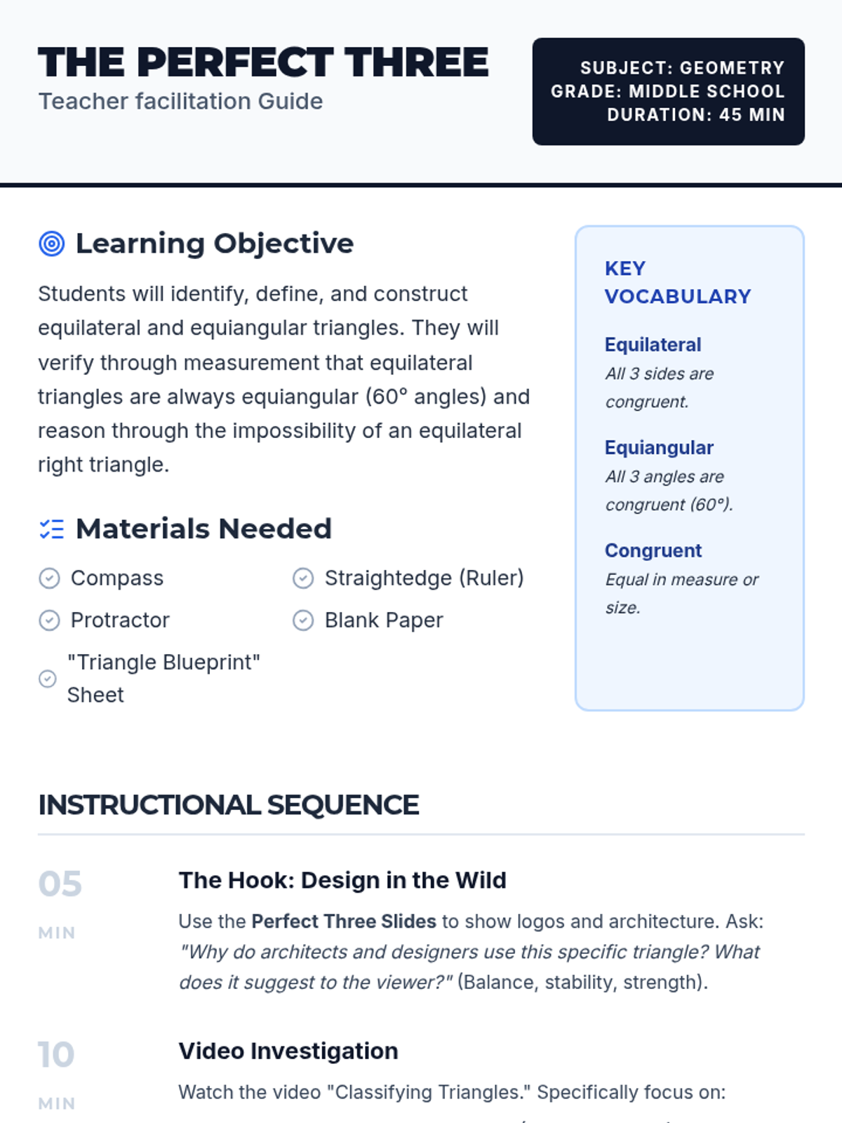 A geometry lesson for middle schoolers exploring the unique properties of equilateral and equiangular triangles through architectural observation, video analysis, and hands-on compass-and-straightedge construction.