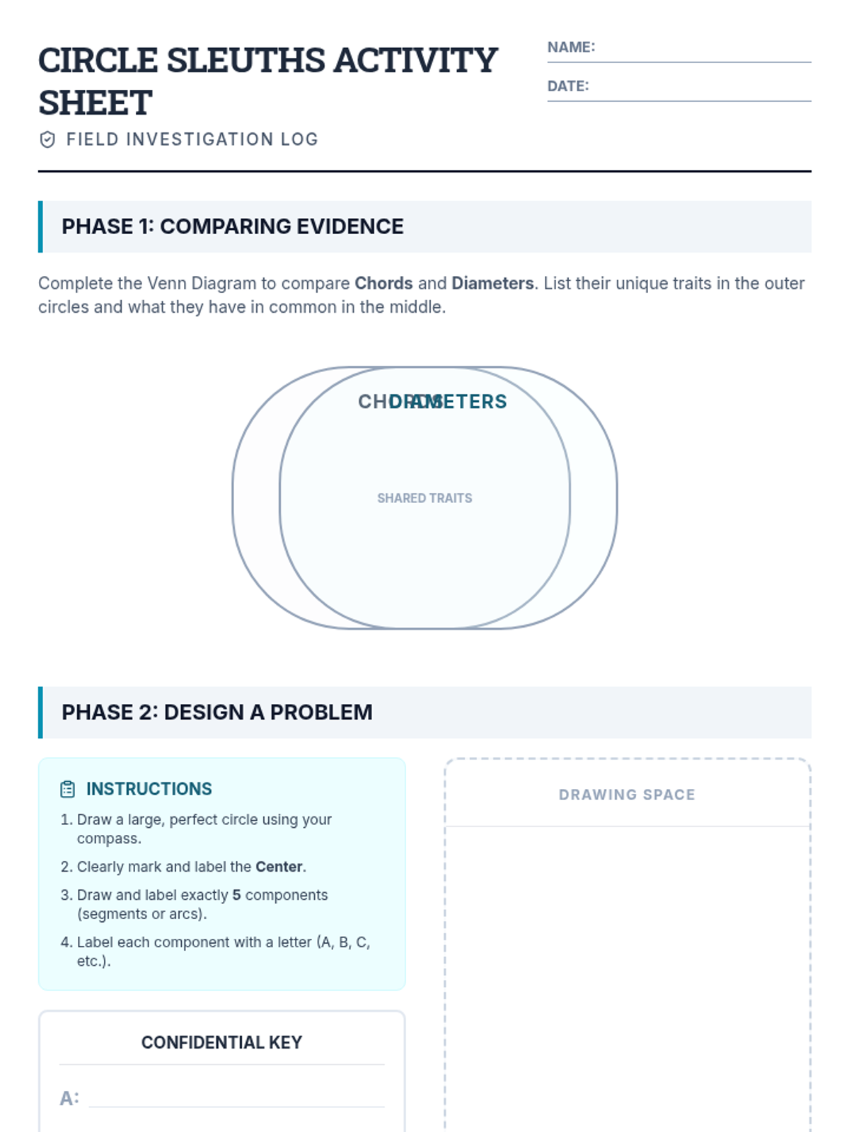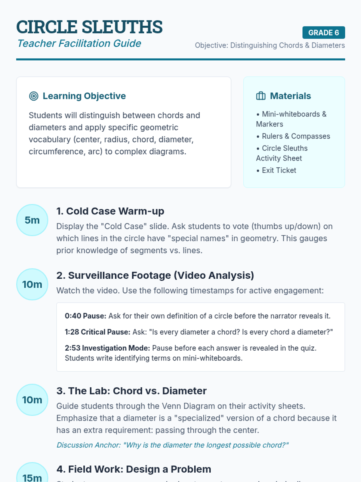 A detective-themed geometry lesson where students distinguish between chords and diameters through video analysis, Venn diagrams, and peer-to-peer problem design.