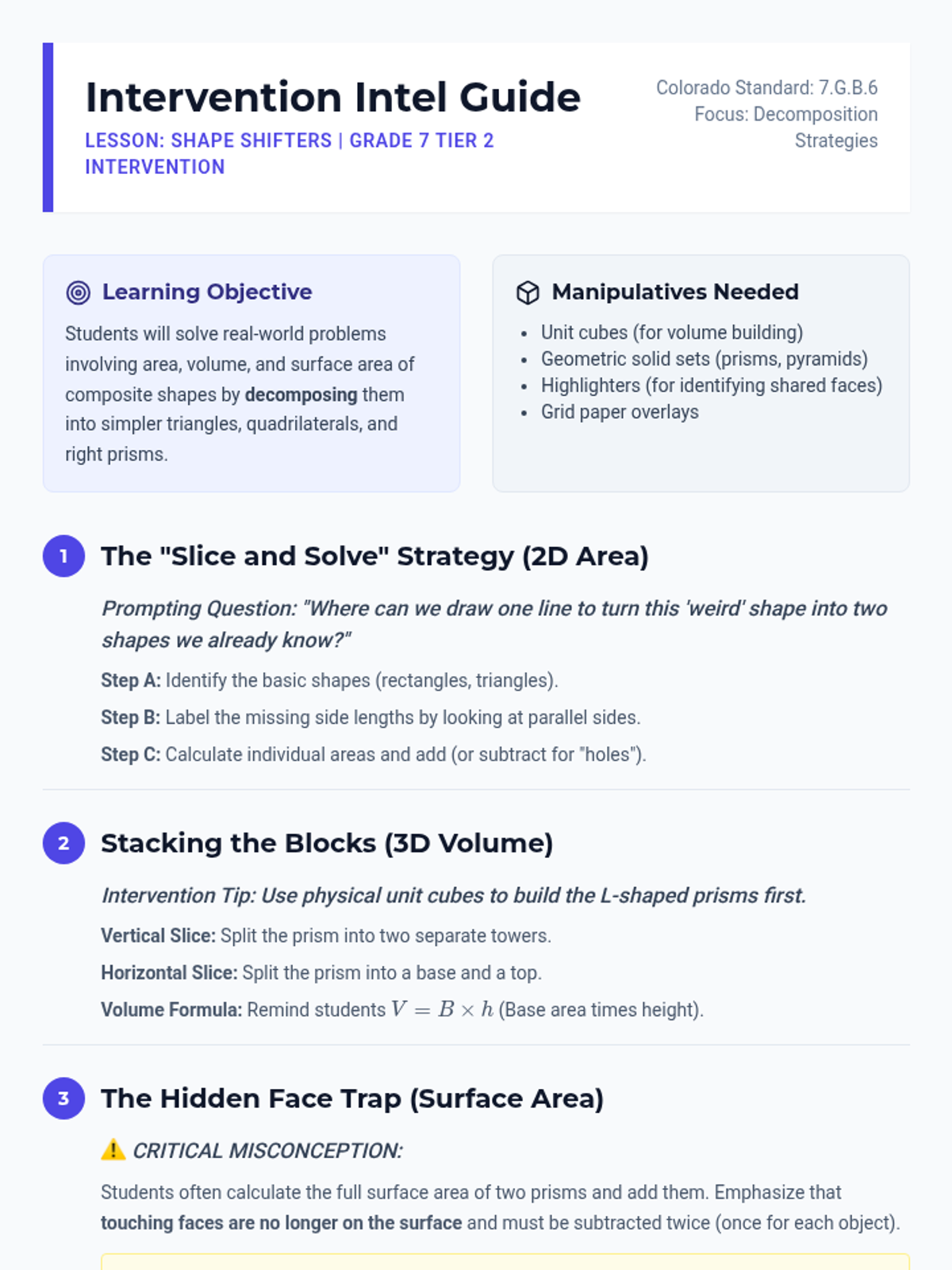 A targeted Tier 2 intervention lesson focusing on decomposing composite 2D and 3D shapes to find area, volume, and surface area, aligned with Colorado standard 7.G.B.6.