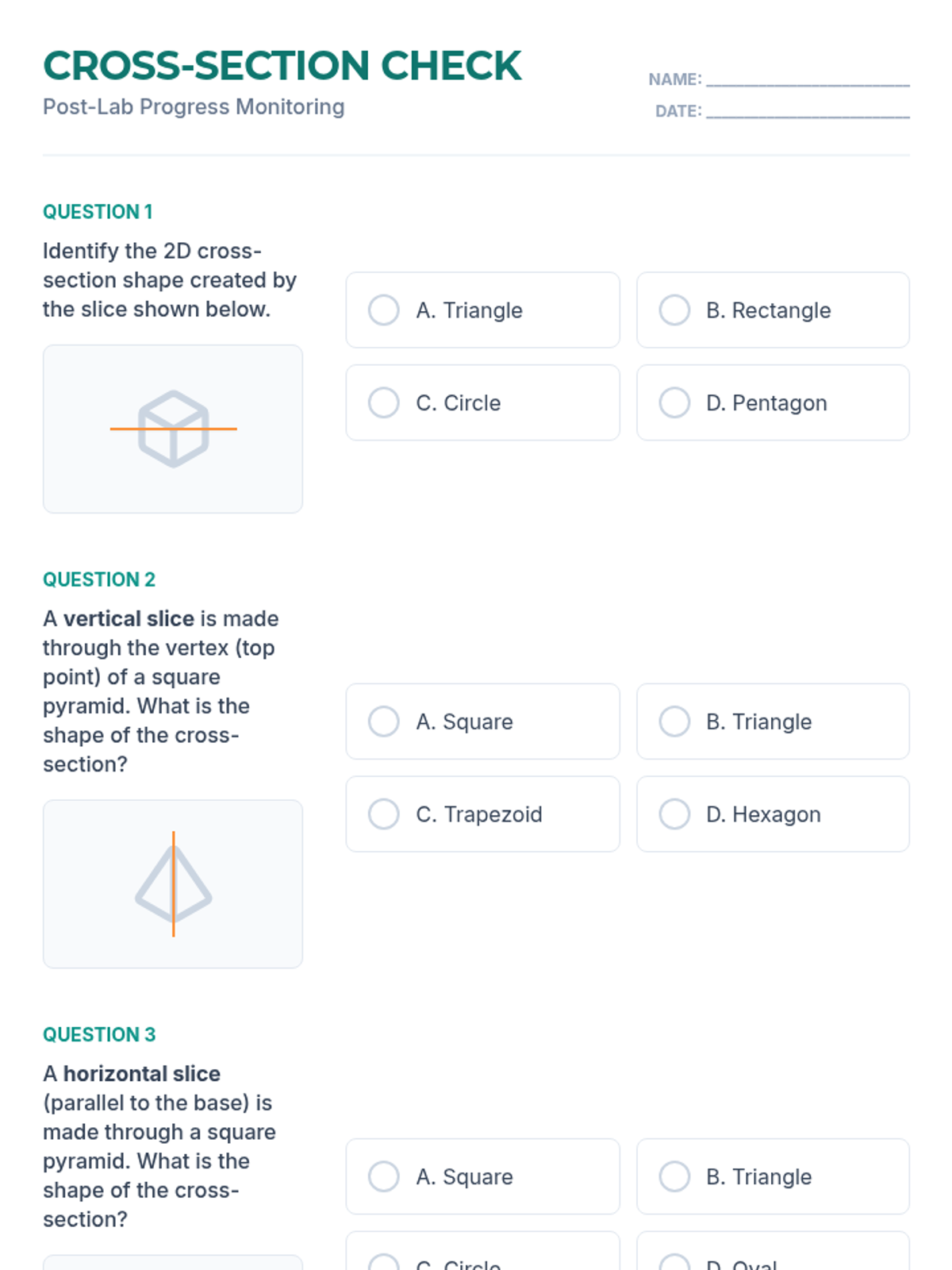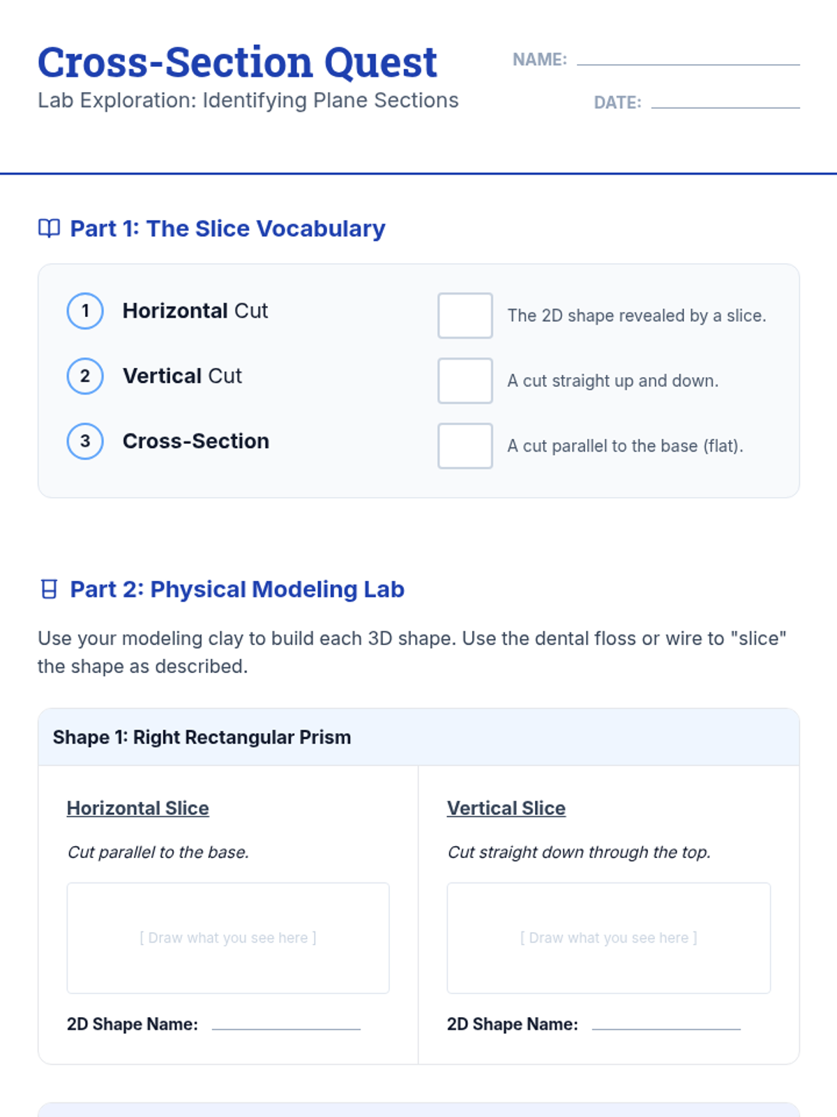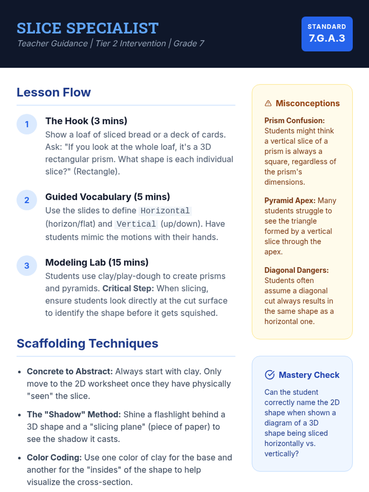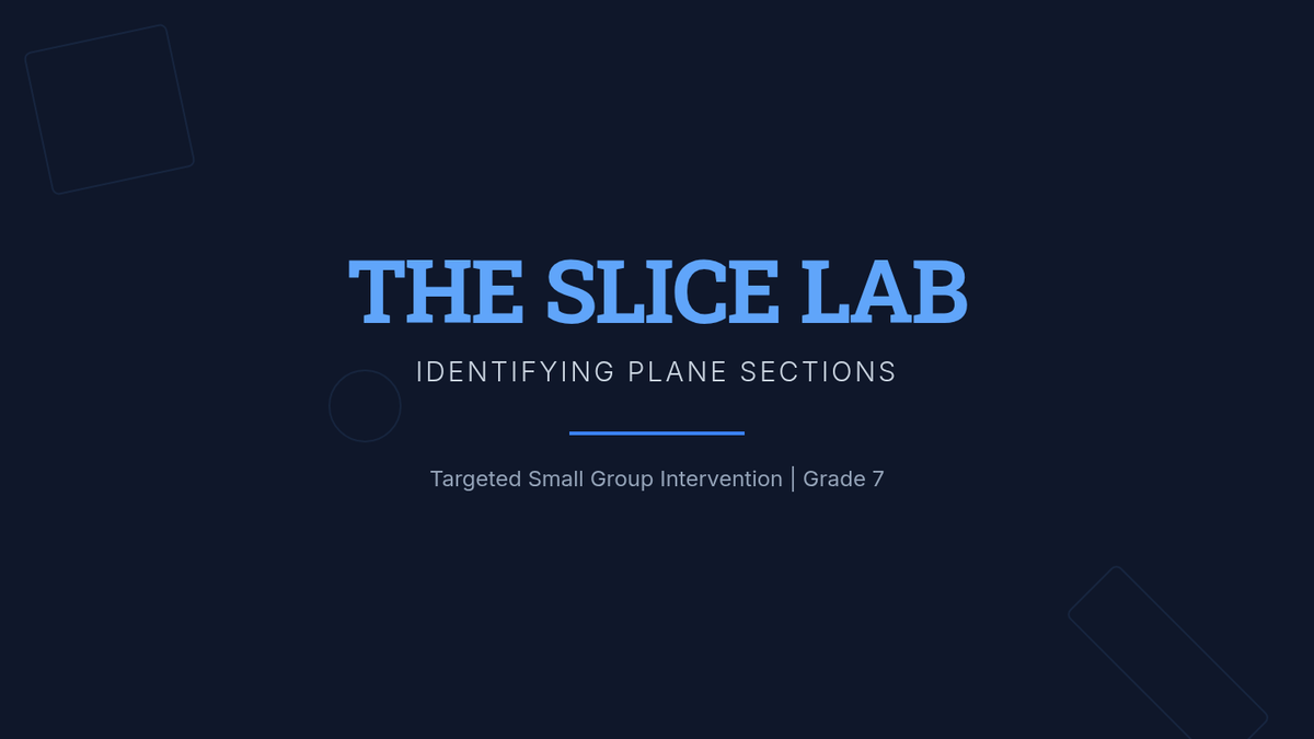 A Tier 2 small group intervention focused on identifying 2D cross-sections of right rectangular prisms and pyramids through hands-on modeling and visualization.