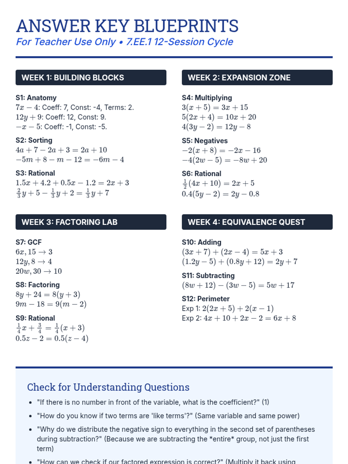 Covers simplifying linear expressions using distributive property and combining like terms, and solving multi-step equations involving rational numbers.