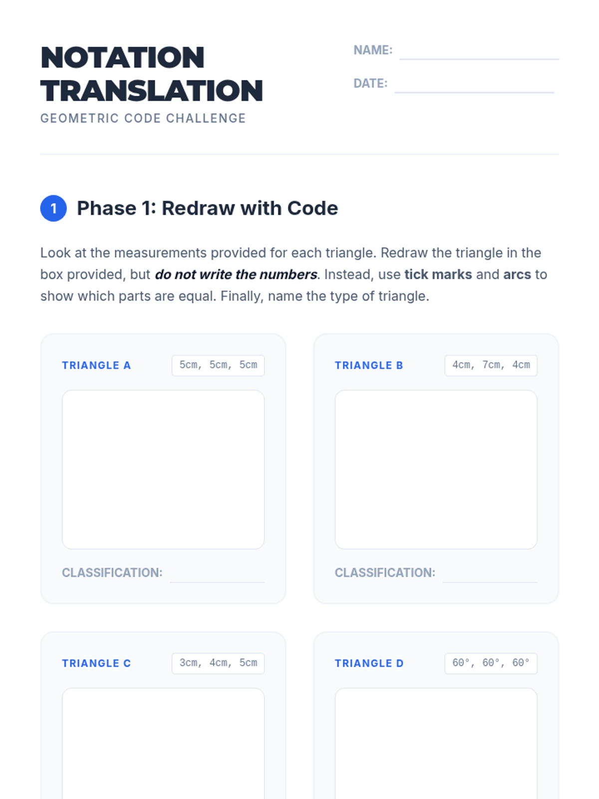 Students learn to read and write geometric notation, specifically tick marks for side length equality and arcs for angle equality, through video analysis and hands-on triangle classification.