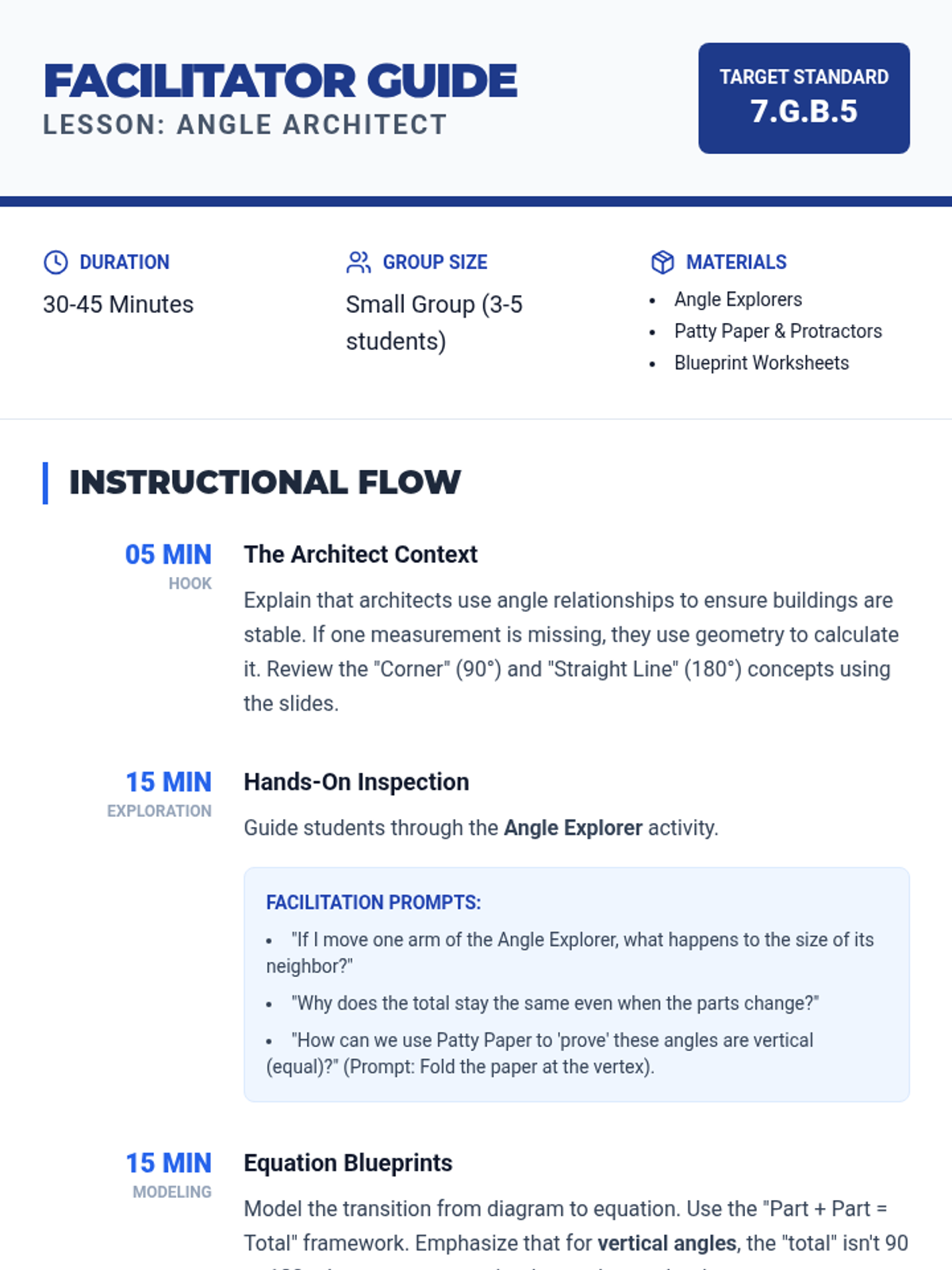 A Tier 2 intervention lesson focusing on the discovery of triangle angle sums and parallel line relationships through hands-on activities and visual models. Students will use physical triangle cutouts and protractors to explore geometry concepts in a small group setting.