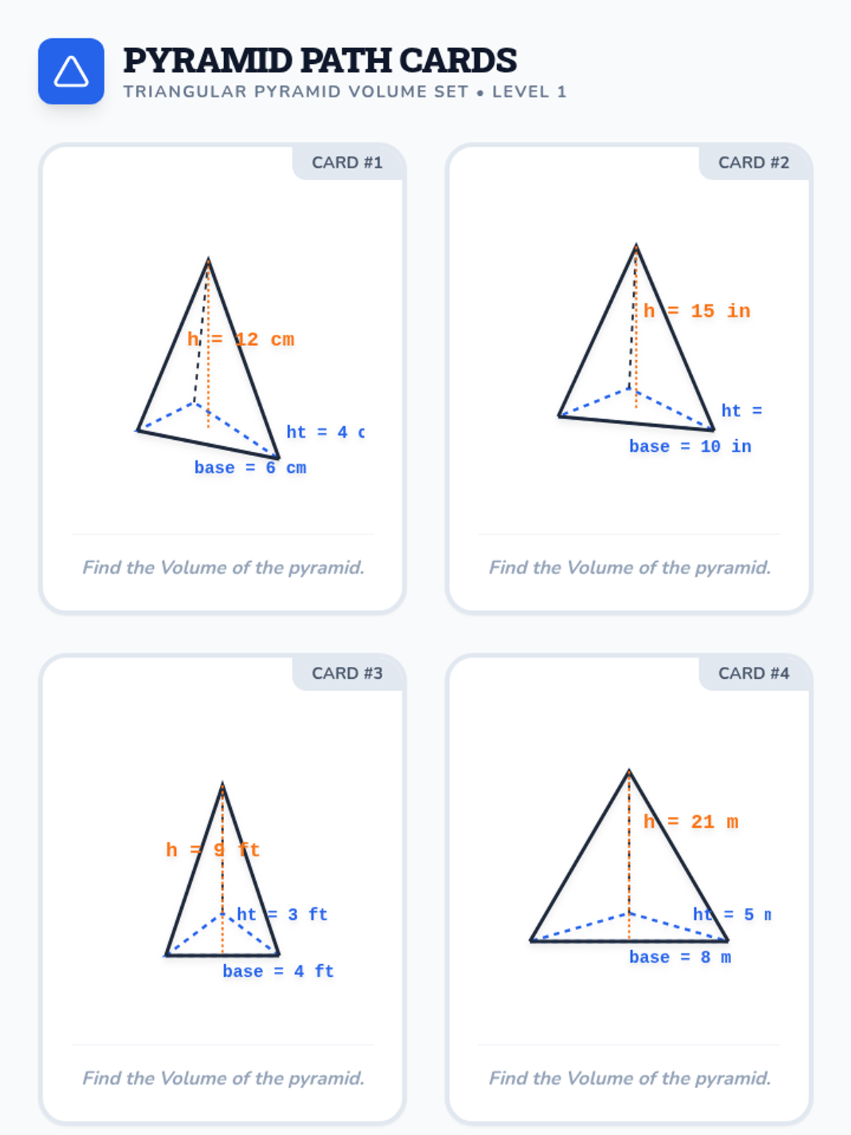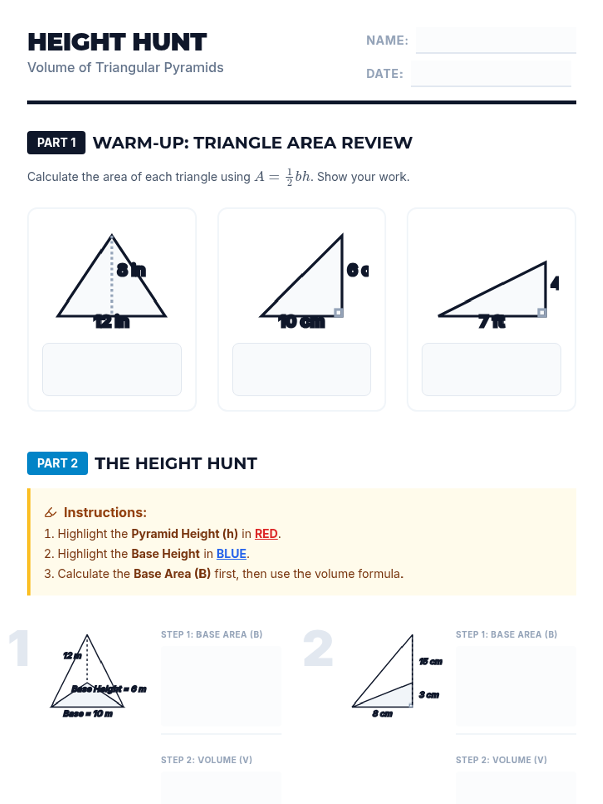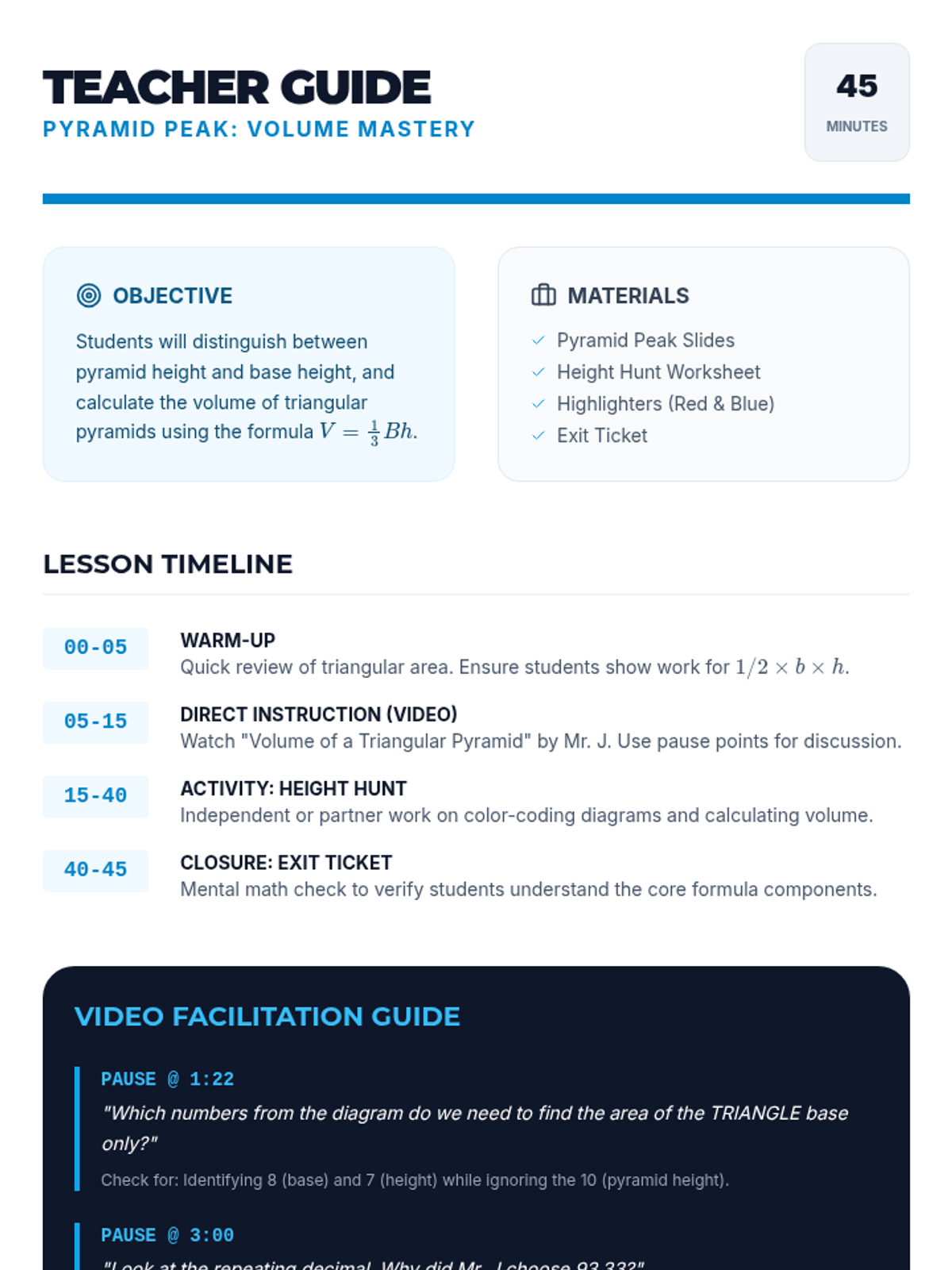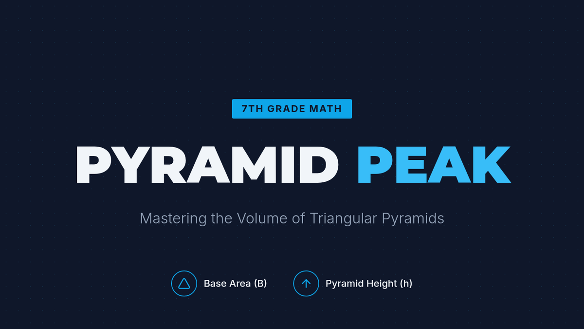 A comprehensive 7th-grade math lesson on calculating the volume of triangular pyramids, focusing on distinguishing between pyramid height and base height through visual identification and formula application.