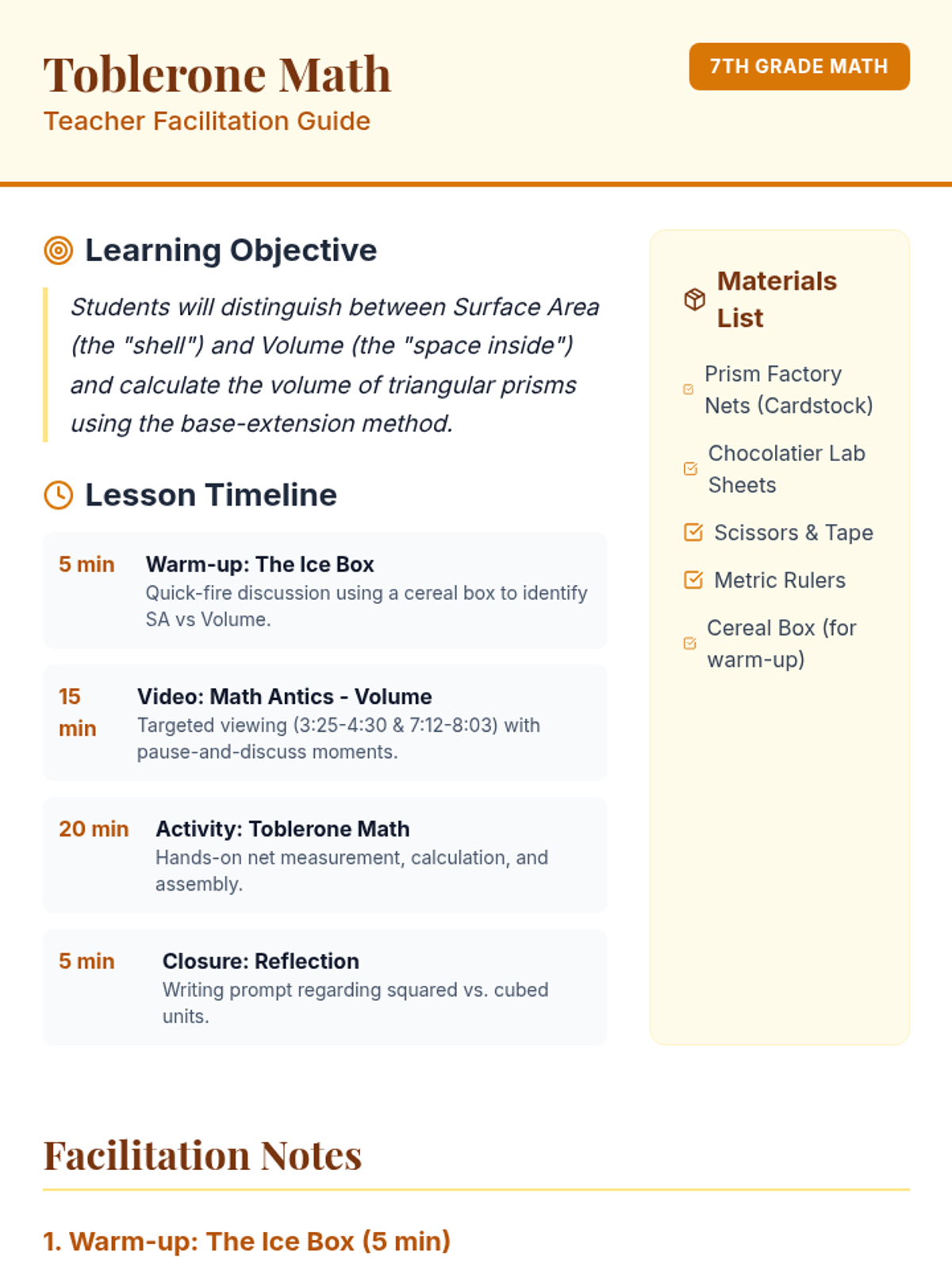 A targeted Tier 2 intervention lesson focusing on the relationship between 3D figures and their 2D nets. Students deconstruct real-world boxes to calculate surface area through face-by-face analysis and collaborative problem-solving.