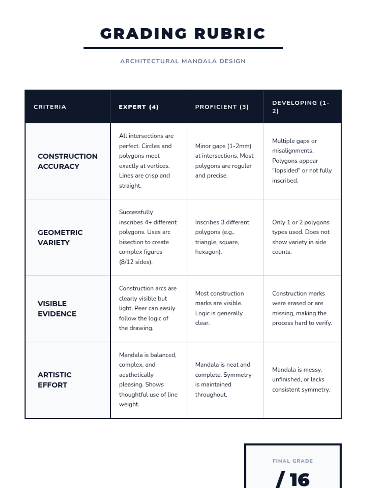 A culminating project where students design a geometric mandala using at least three different inscribed polygon constructions, maintaining visible construction marks to show their geometric proofs.