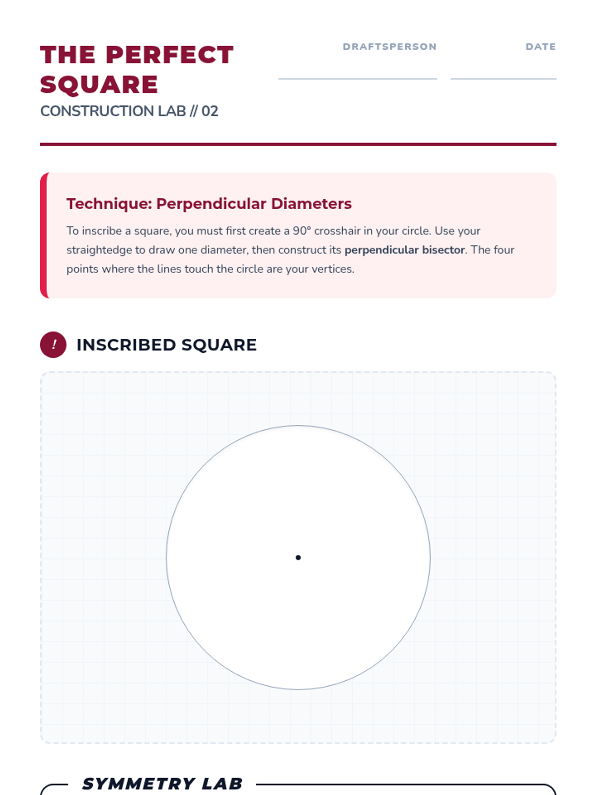 Students utilize perpendicular bisectors of the diameter to construct a perfect square inscribed in a circle.