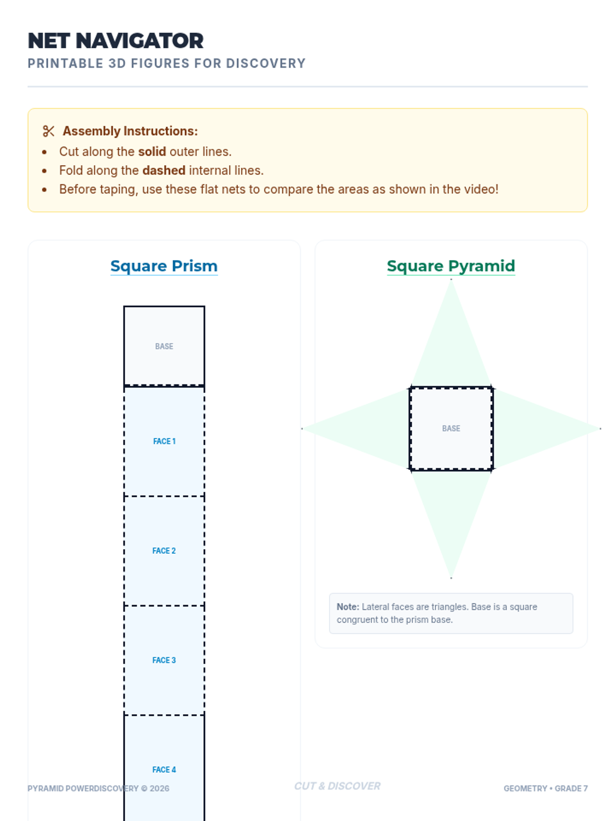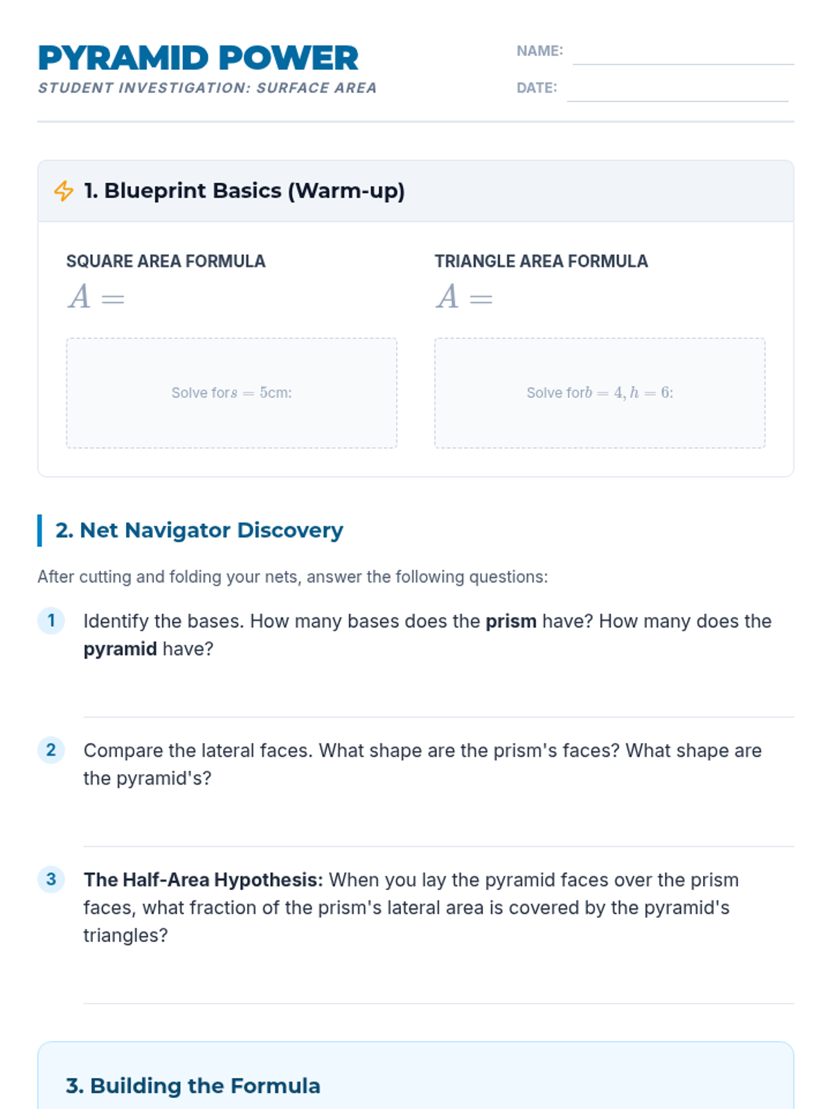 Connects 2D representations to 3D volumes by exploring nets of prisms and pyramids to calculate surface area conceptually.