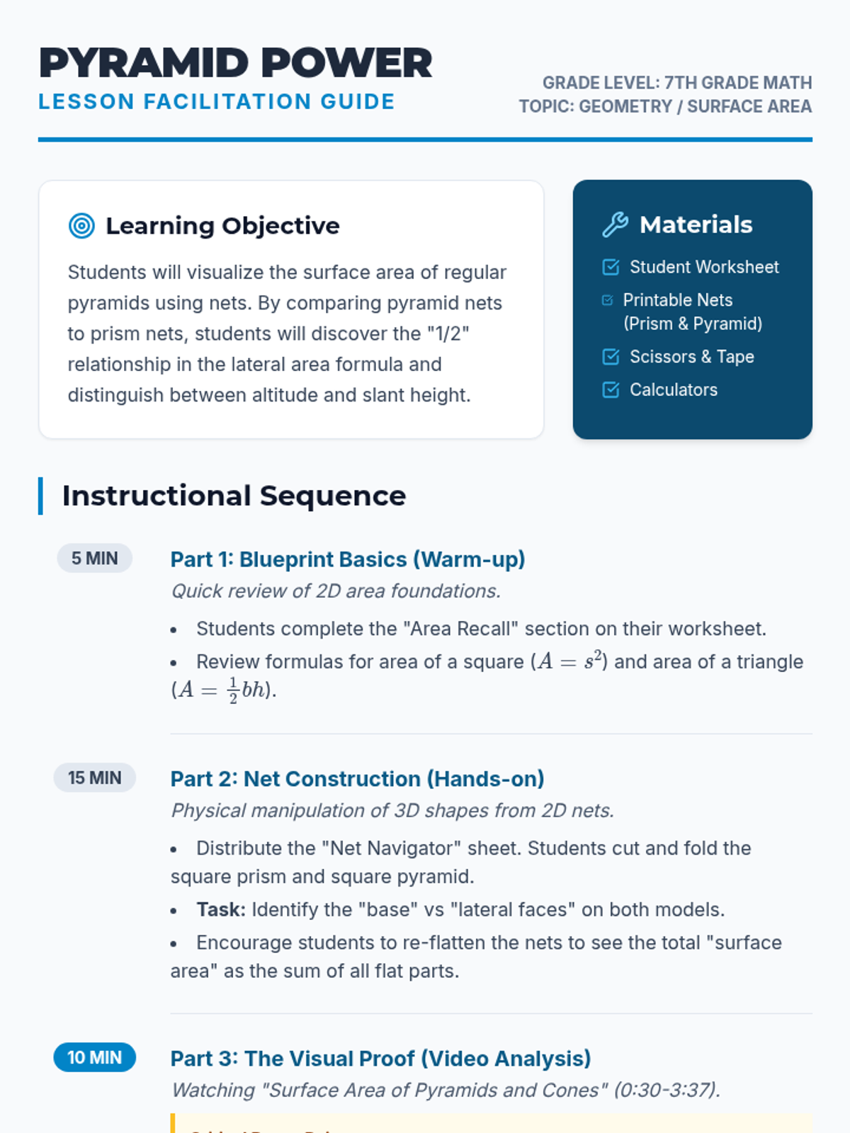 A targeted Tier 2 intervention lesson for 6th grade students on finding the surface area of prisms and pyramids by 'unfolding' them into nets. This lesson uses a construction blueprint theme to help students track and calculate the area of individual faces before summing them for the total surface area.