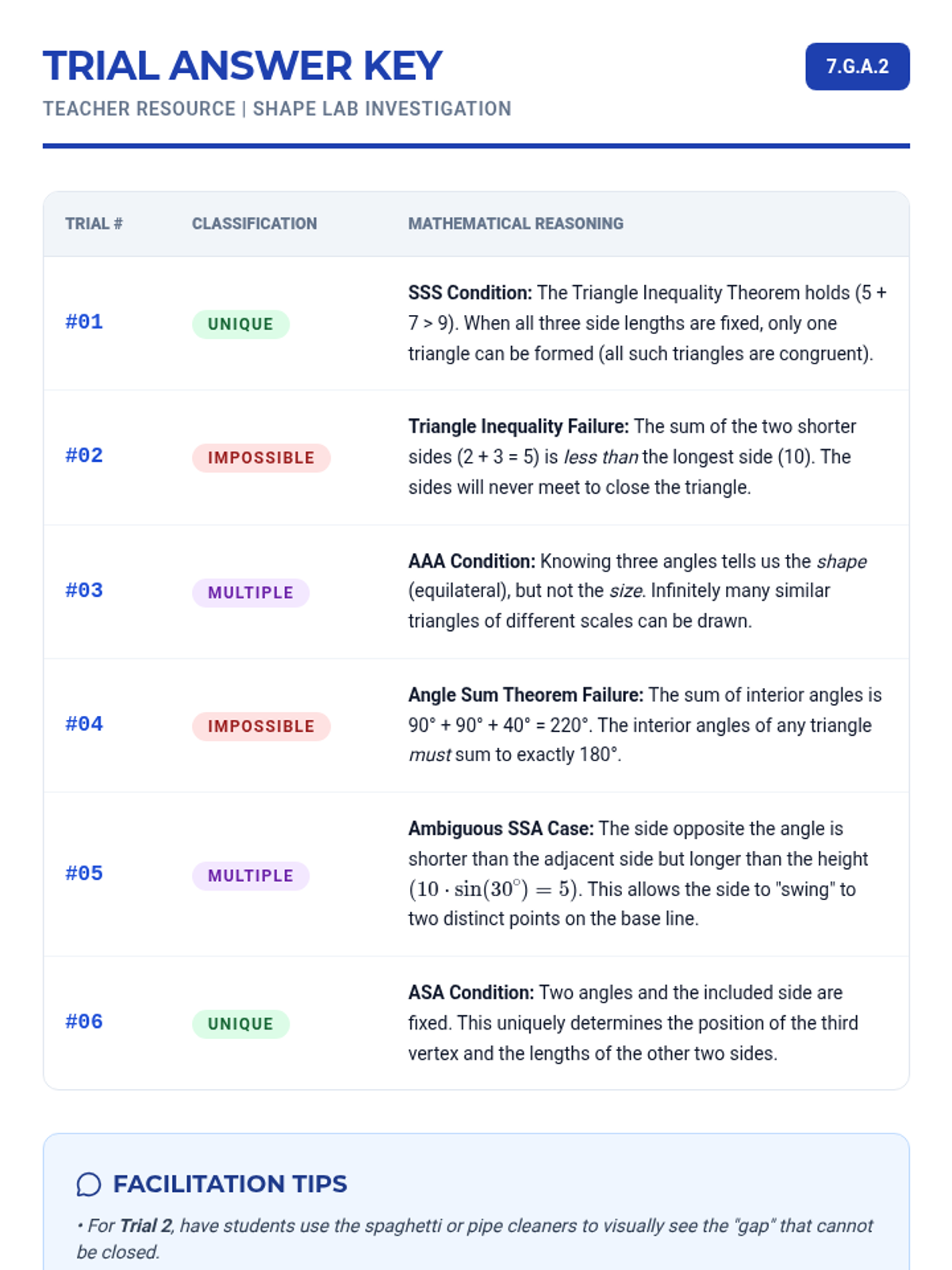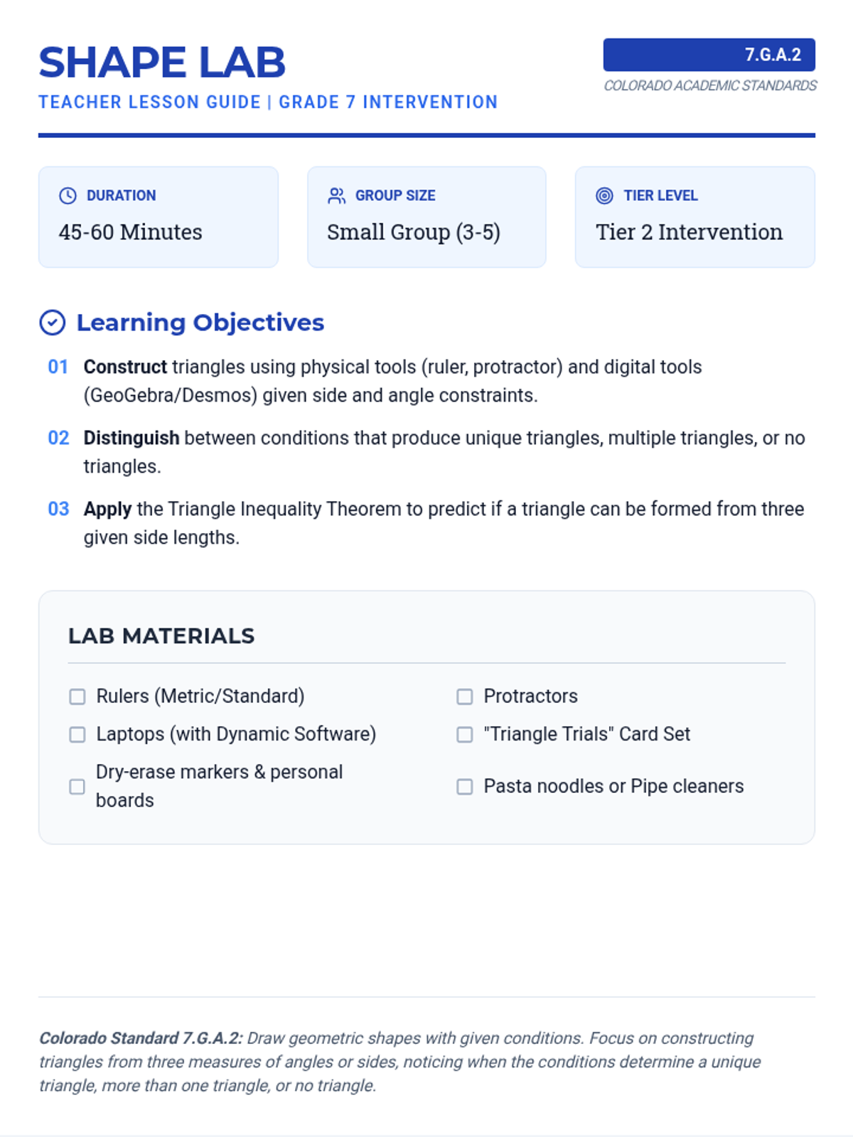 A Tier 2 intervention lesson for 7th grade students focusing on constructing triangles under specific constraints using physical tools and dynamic geometry software. Students investigate the 'Ambiguous Case' and triangle inequality through collaborative tasks and guided exploration.