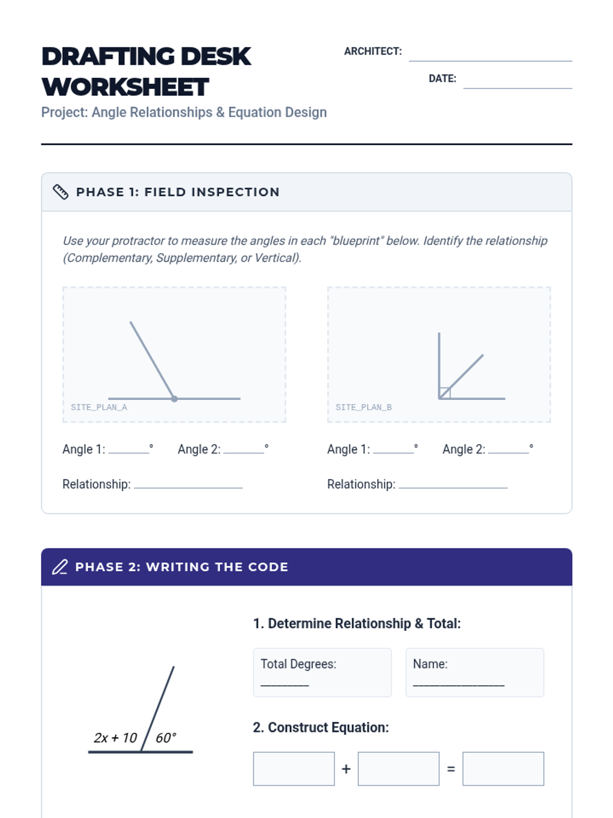 Students explore complementary, supplementary, and vertical angle relationships, and discover the triangle angle sum property through hands-on measurement and equation solving.