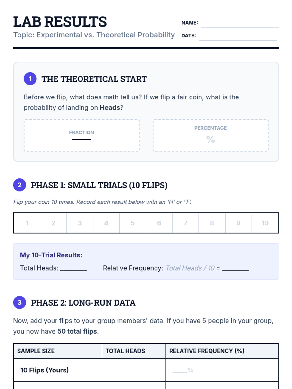 Students aggregate class data to observe how relative frequency converges on theoretical probability as the number of trials increases, illustrating the Law of Large Numbers.